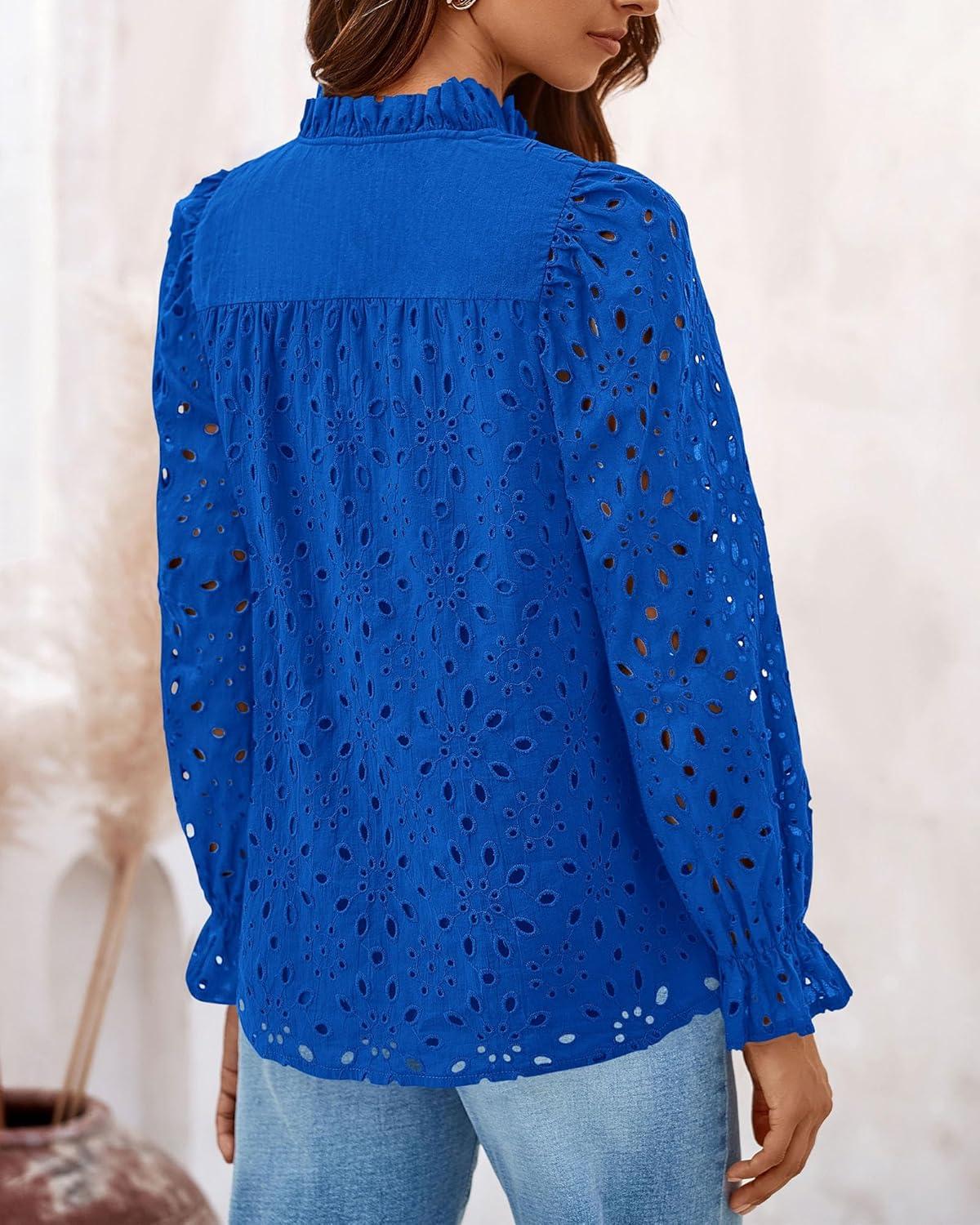 PRETTYGARDEN Women's Dressy Casual Blouse Tops Fall Spring Puff Long Sleeve Button V Neck Hollow Out Lace Embroidered Shirts(Blue)