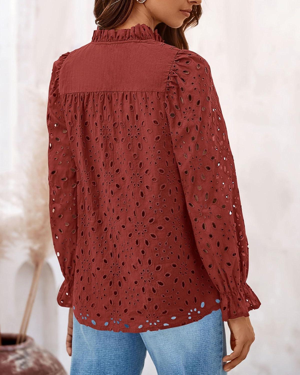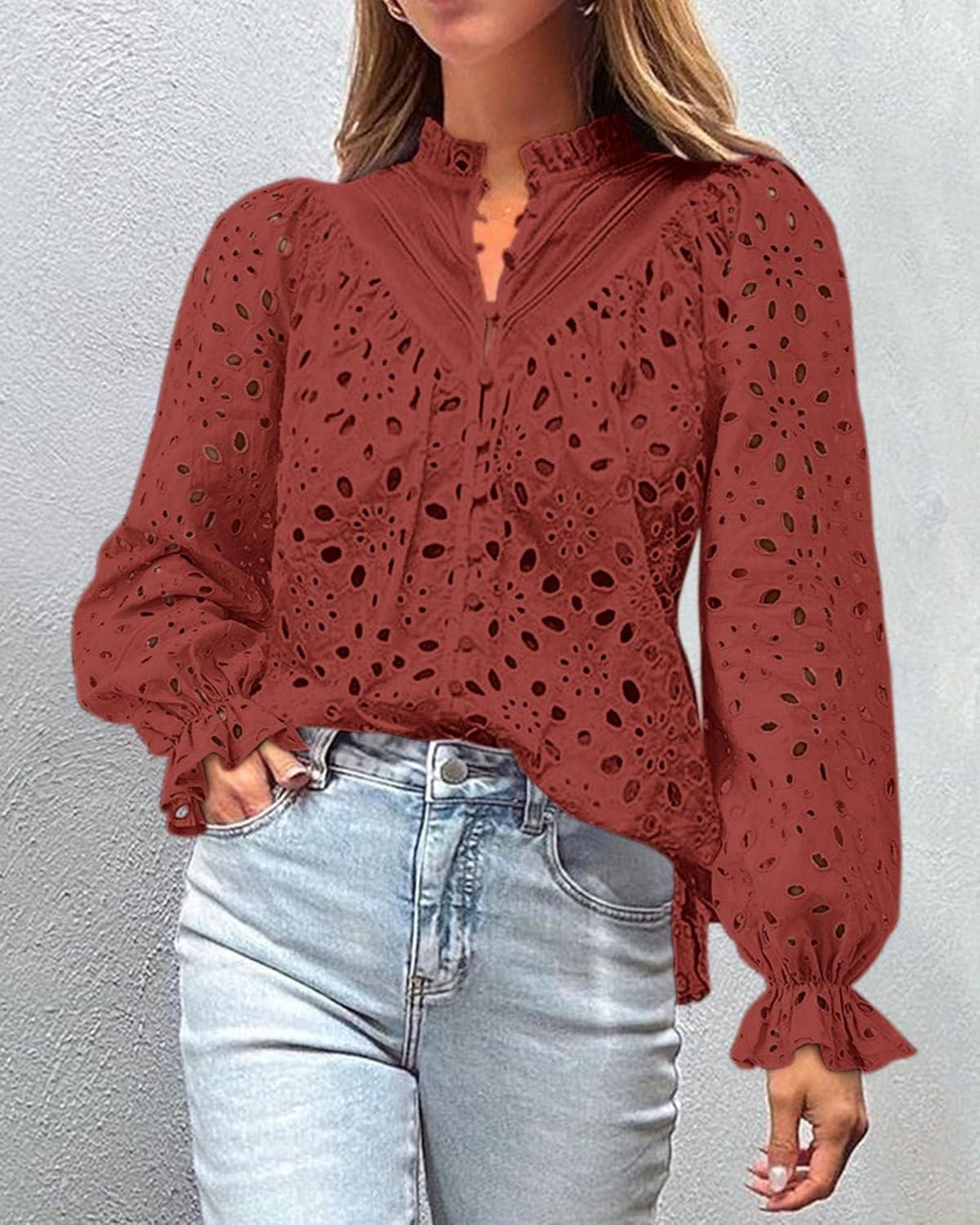 PRETTYGARDEN Women's Dressy Casual Blouse Tops Fall Spring Puff Long Sleeve Button V Neck Hollow Out Lace Embroidered Shirts(Brown Red)