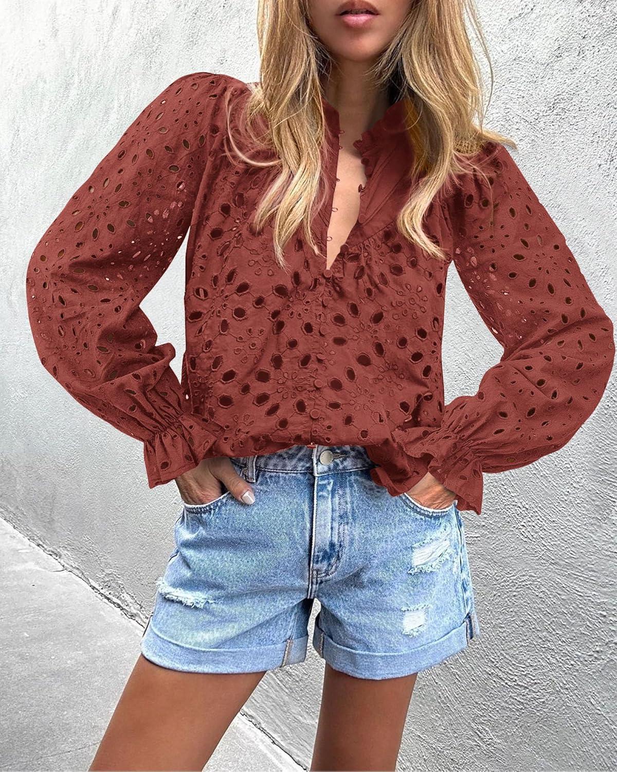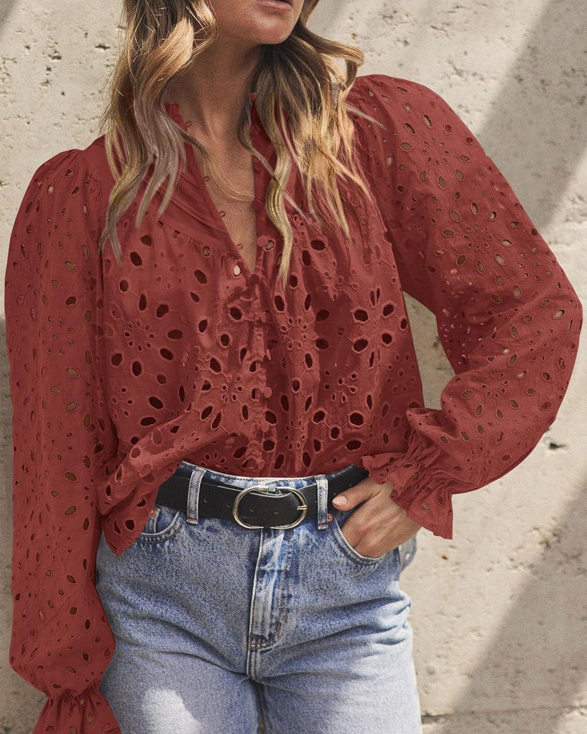 PRETTYGARDEN Women’s Dressy Casual Blouse Tops Fall Spring Puff Long Sleeve Button V Neck Hollow Out Lace Embroidered Shirts(Brown Red)