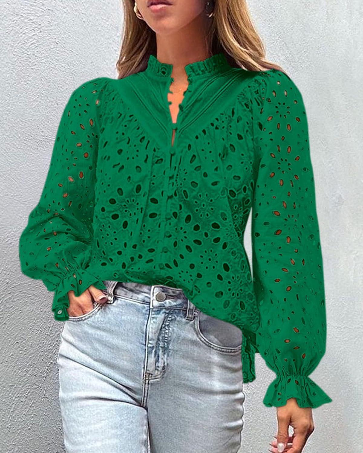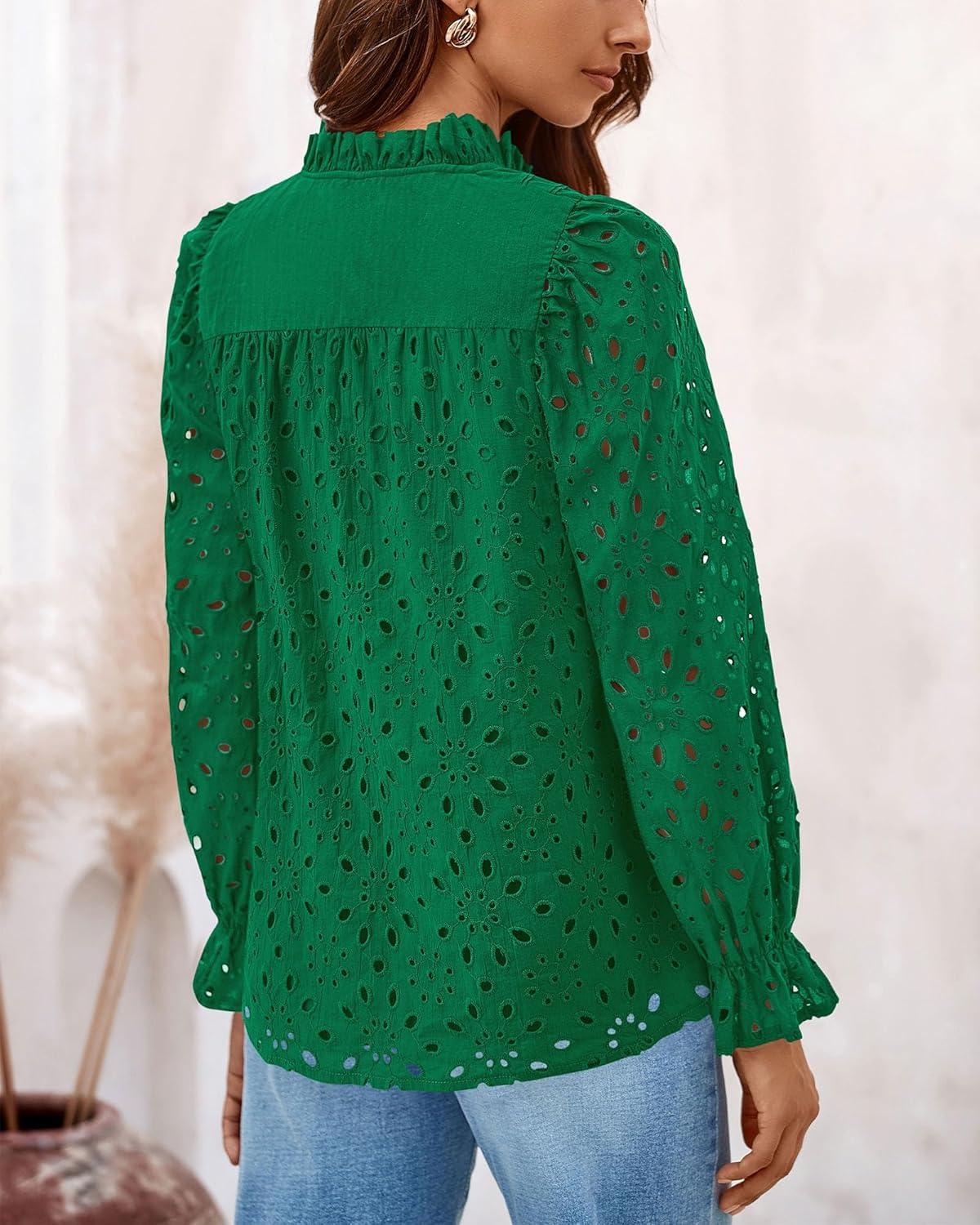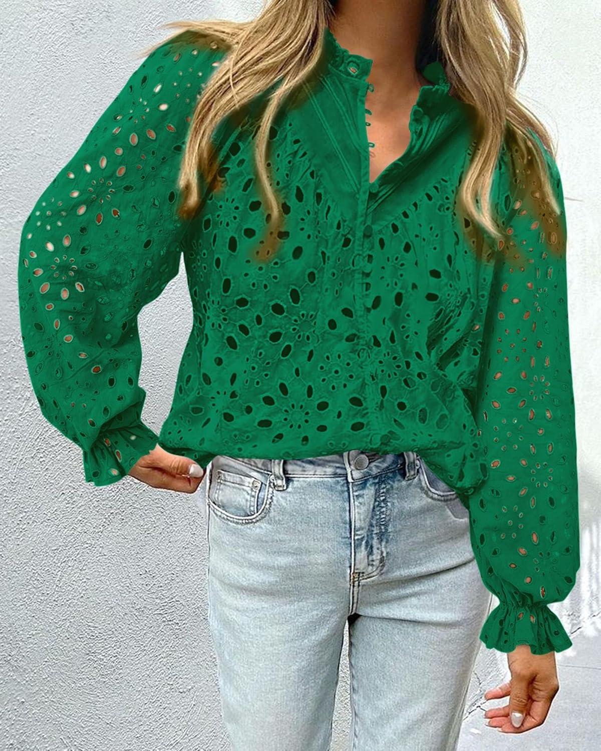 PRETTYGARDEN Women's Dressy Casual Blouse Tops Fall Spring Puff Long Sleeve Button V Neck Hollow Out Lace Embroidered Shirts(Dark Green)
