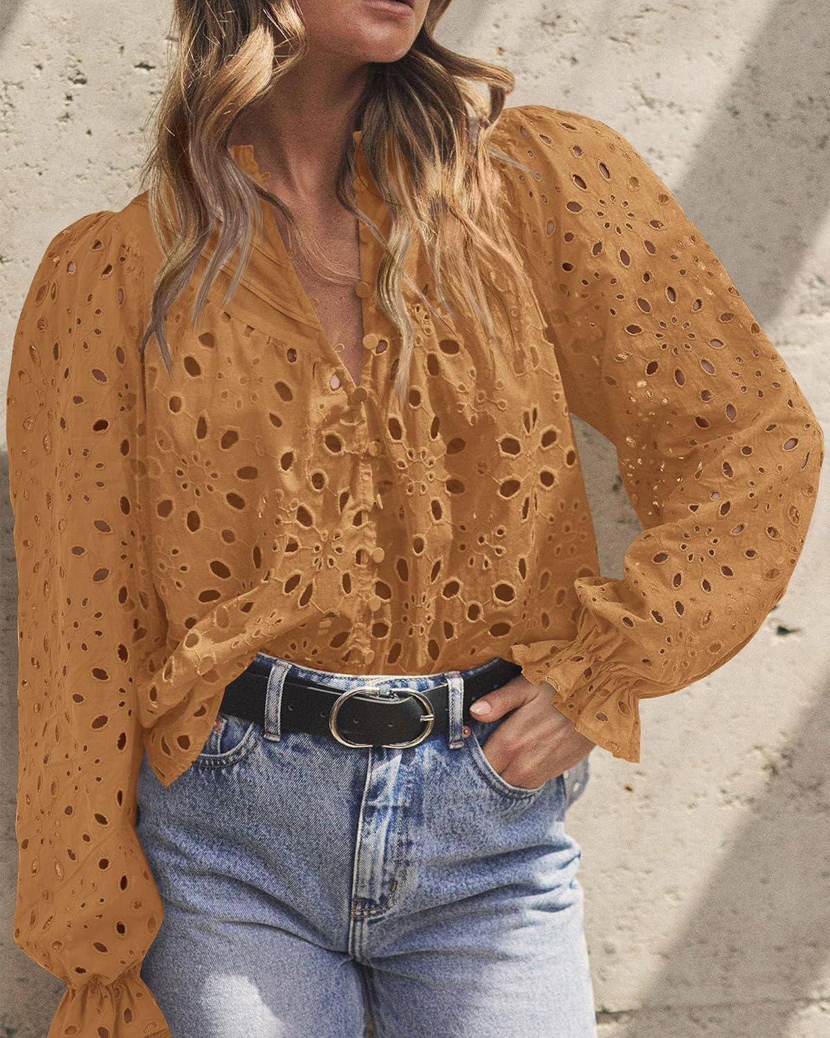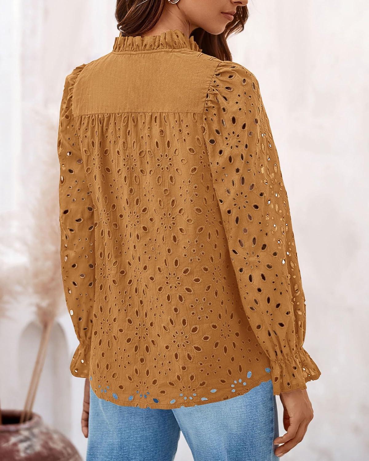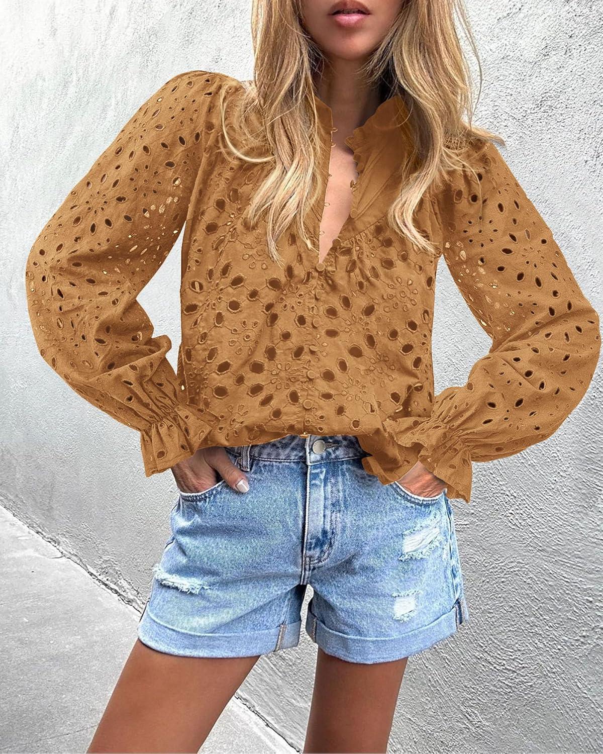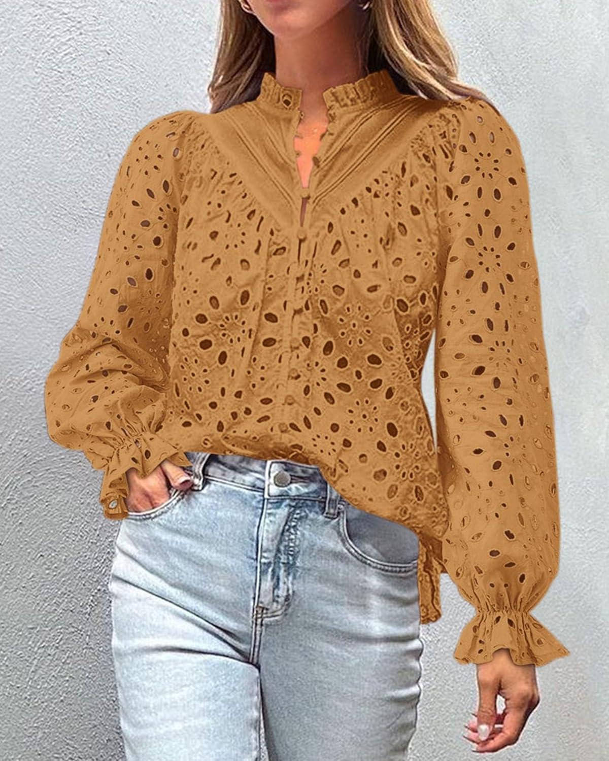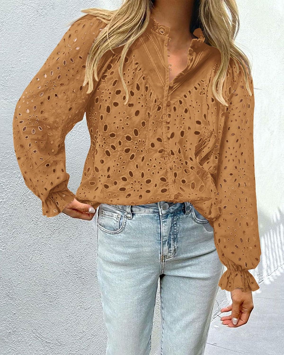 PRETTYGARDEN Women's Dressy Casual Blouse Tops Fall Spring Puff Long Sleeve Button V Neck Hollow Out Lace Embroidered Shirts(Khaki)
