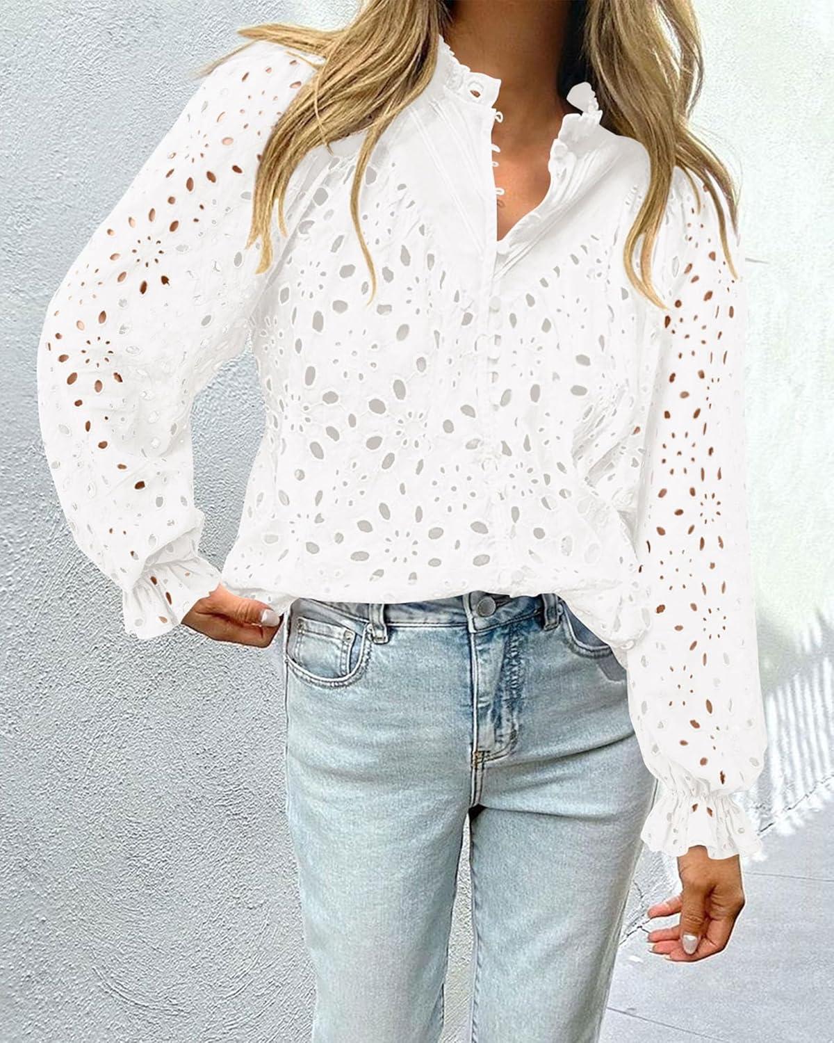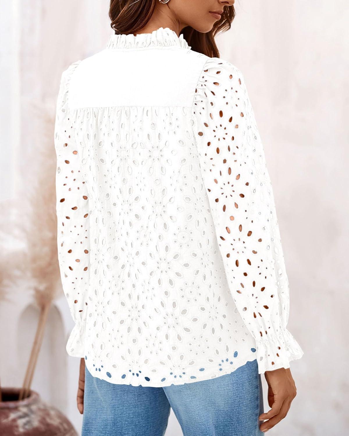 PRETTYGARDEN Women's Dressy Casual Blouse Tops Fall Spring Puff Long Sleeve Button V Neck Hollow Out Lace Embroidered Shirts(White)