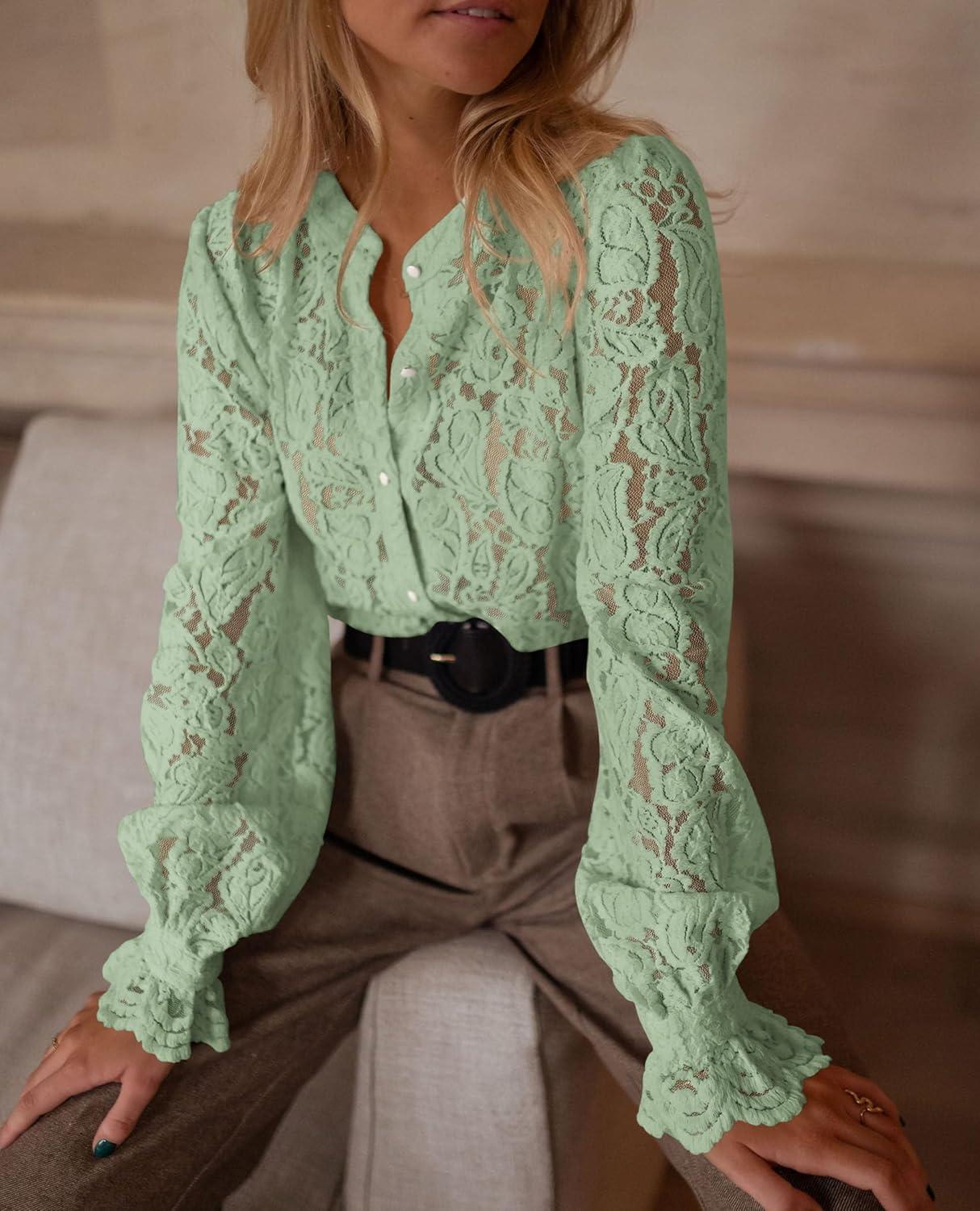 PRETTYGARDEN Women’s Dressy Casual Lace Blouse Long Sleeve Button Up Shirts Tops Spring Fall Fashion Clothes(Green)