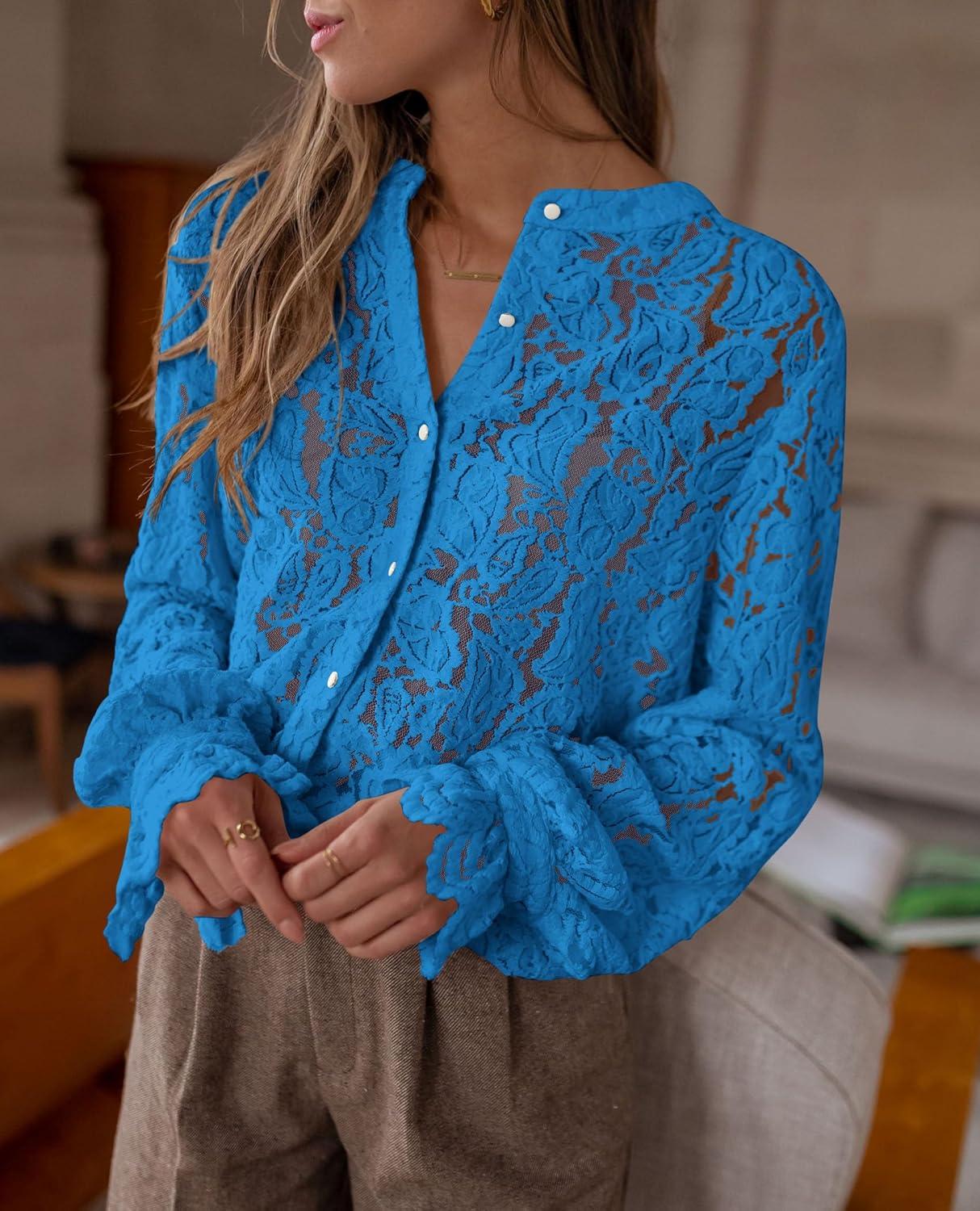PRETTYGARDEN Women’s Dressy Casual Lace Blouse Long Sleeve Button Up Shirts Tops Spring Fall Fashion Clothes(Grey Blue)