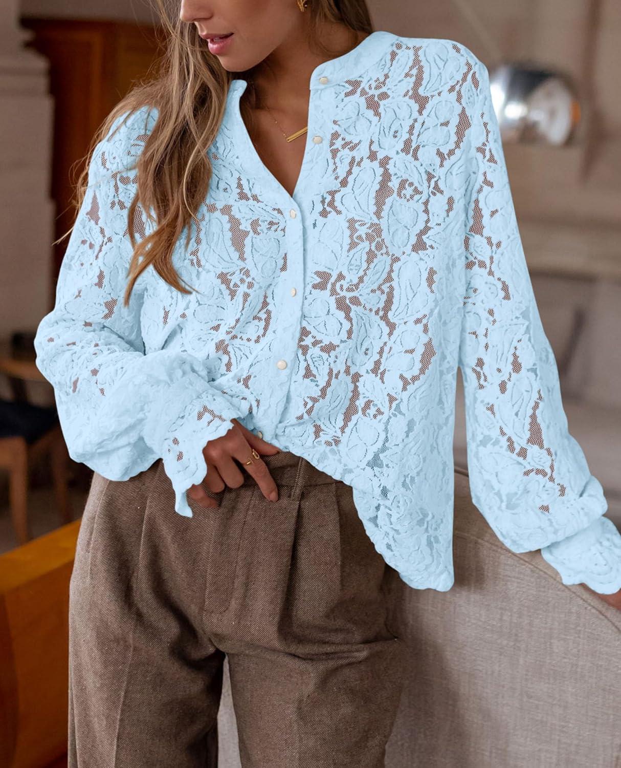 PRETTYGARDEN Women's Dressy Casual Lace Blouse Long Sleeve Button Up Shirts Tops Spring Fall Fashion Clothes(Light Blue)