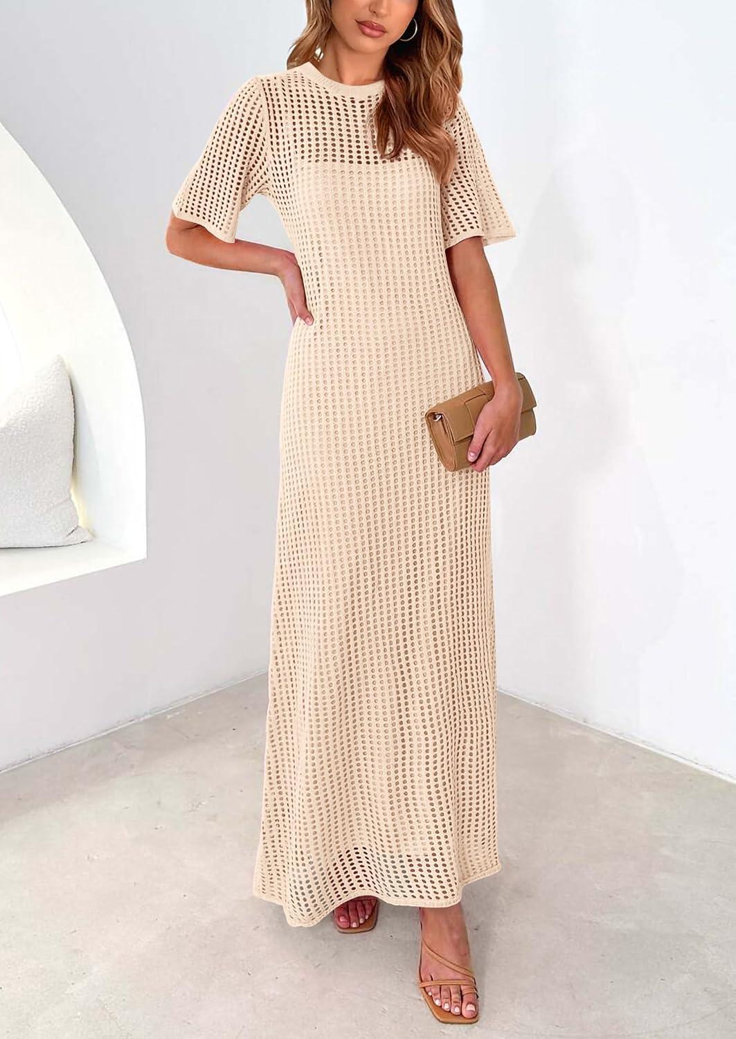 PRETTYGARDEN Womens Eyelet Cover Up Dress 2025 Summer Vacation Resort Maxi Dresses Beach Short Sleeve Hollow Out Sundress(Apricot)