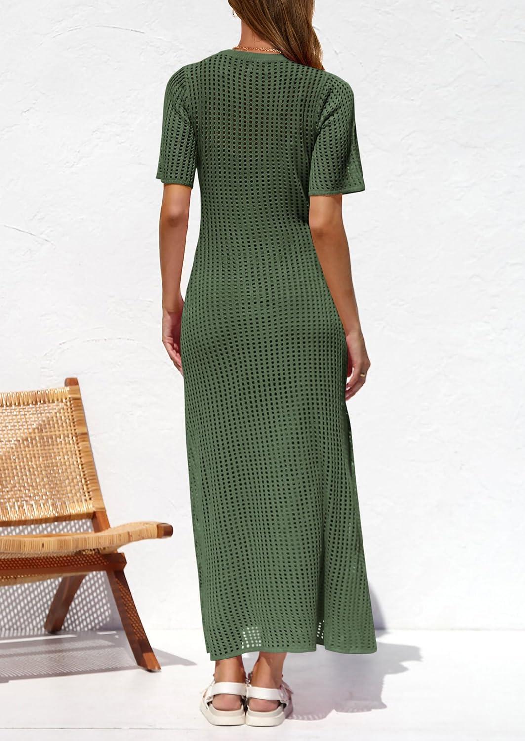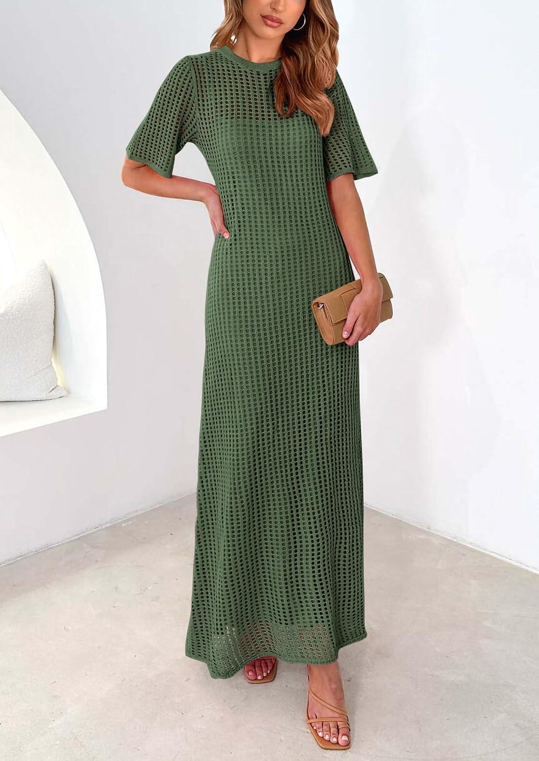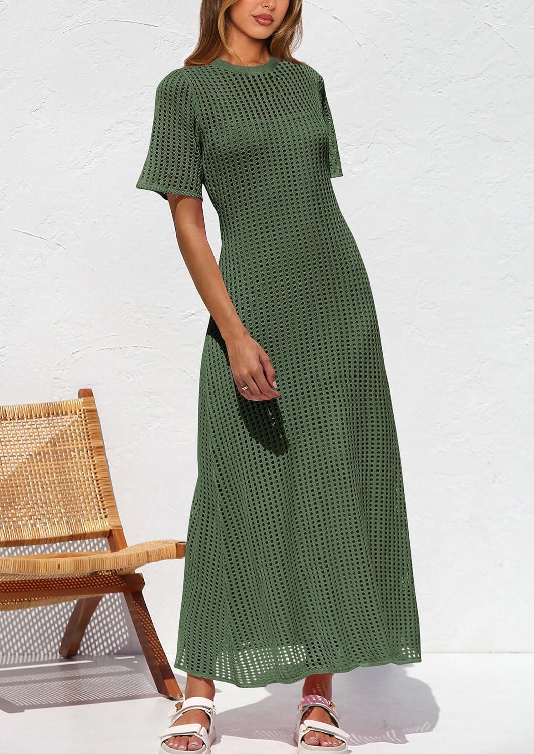 PRETTYGARDEN Womens Eyelet Cover Up Dress 2025 Summer Vacation Resort Maxi Dresses Beach Short Sleeve Hollow Out Sundress(Army Green)