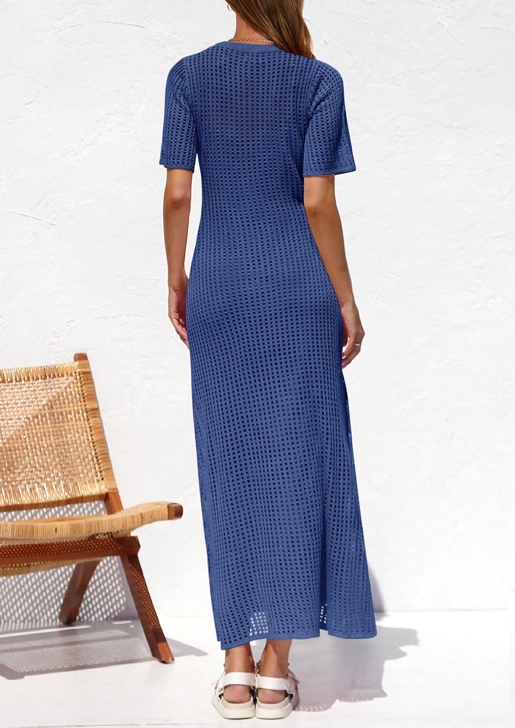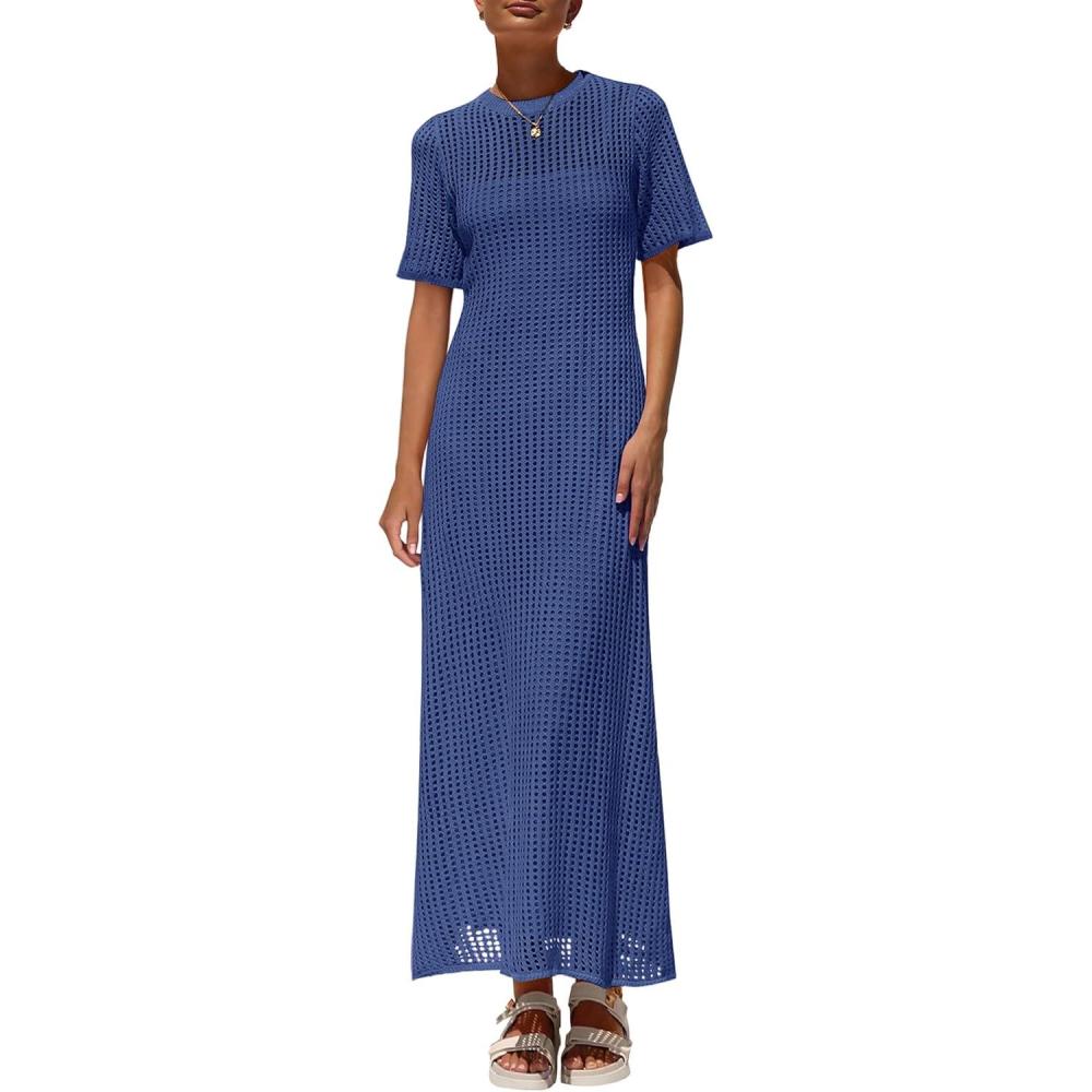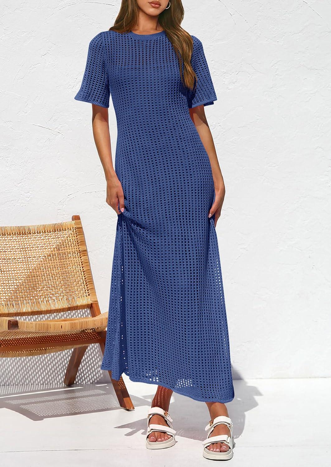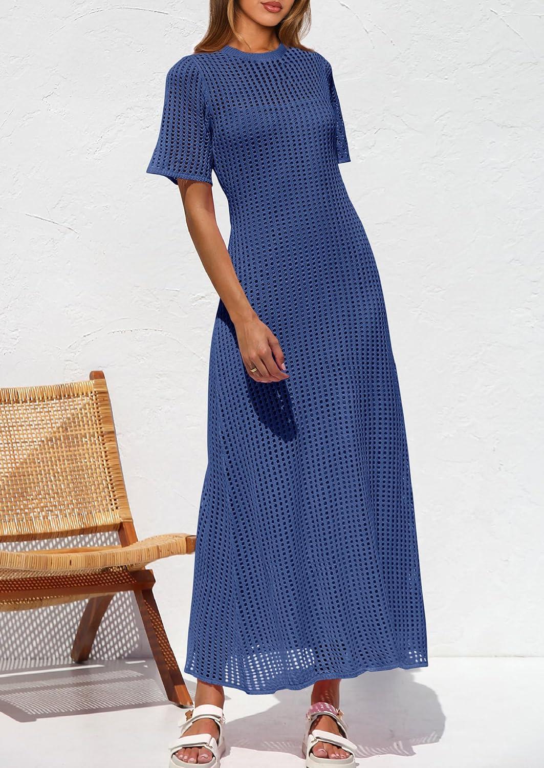 PRETTYGARDEN Womens Eyelet Cover Up Dress 2025 Summer Vacation Resort Maxi Dresses Beach Short Sleeve Hollow Out Sundress(Blue)