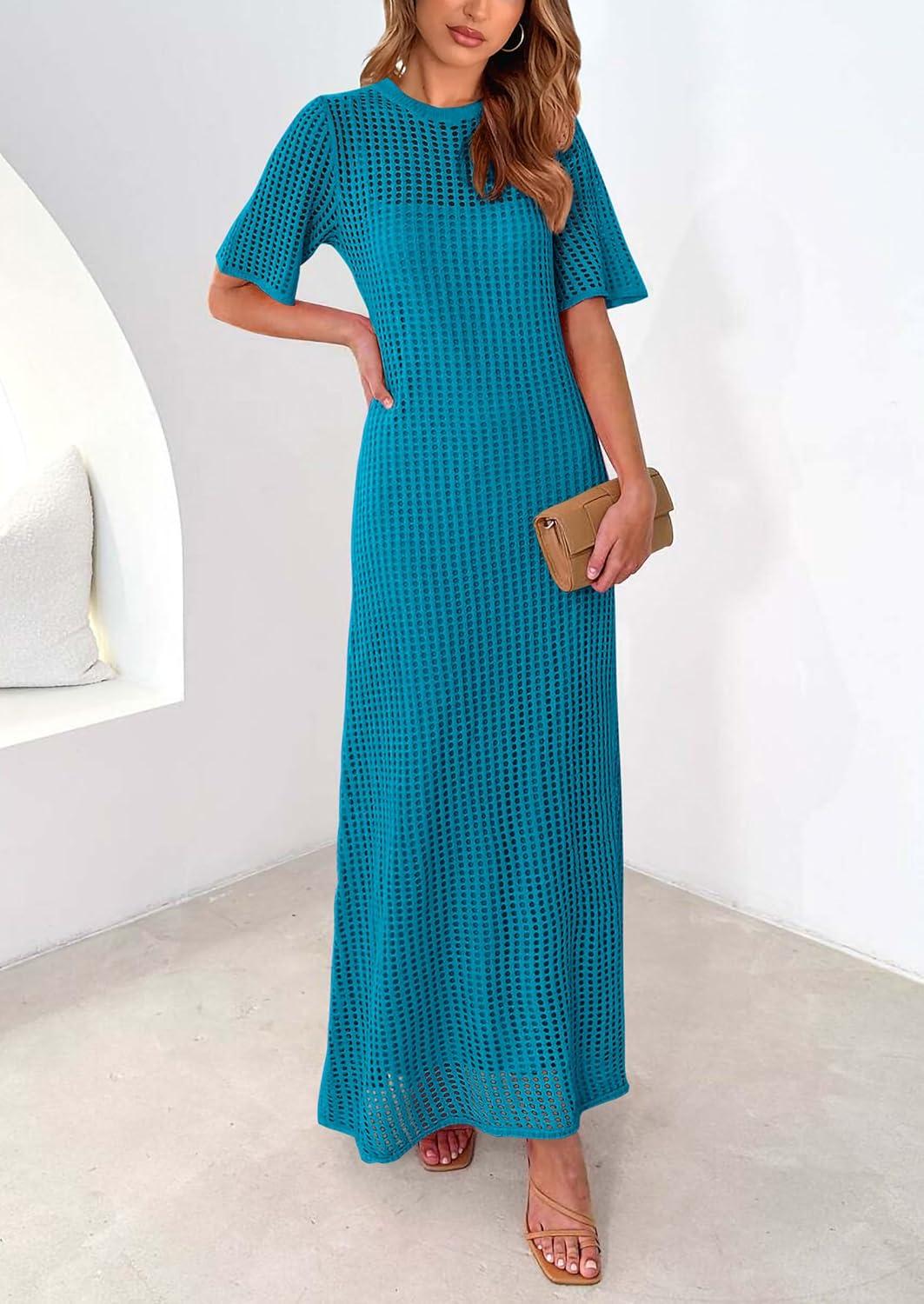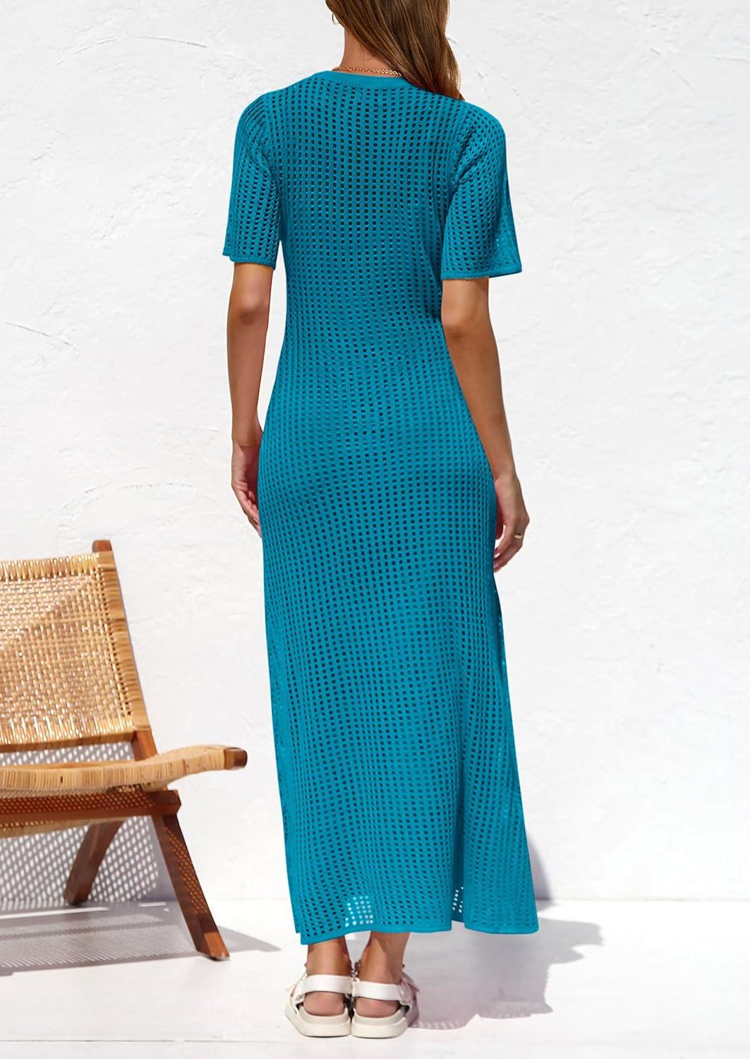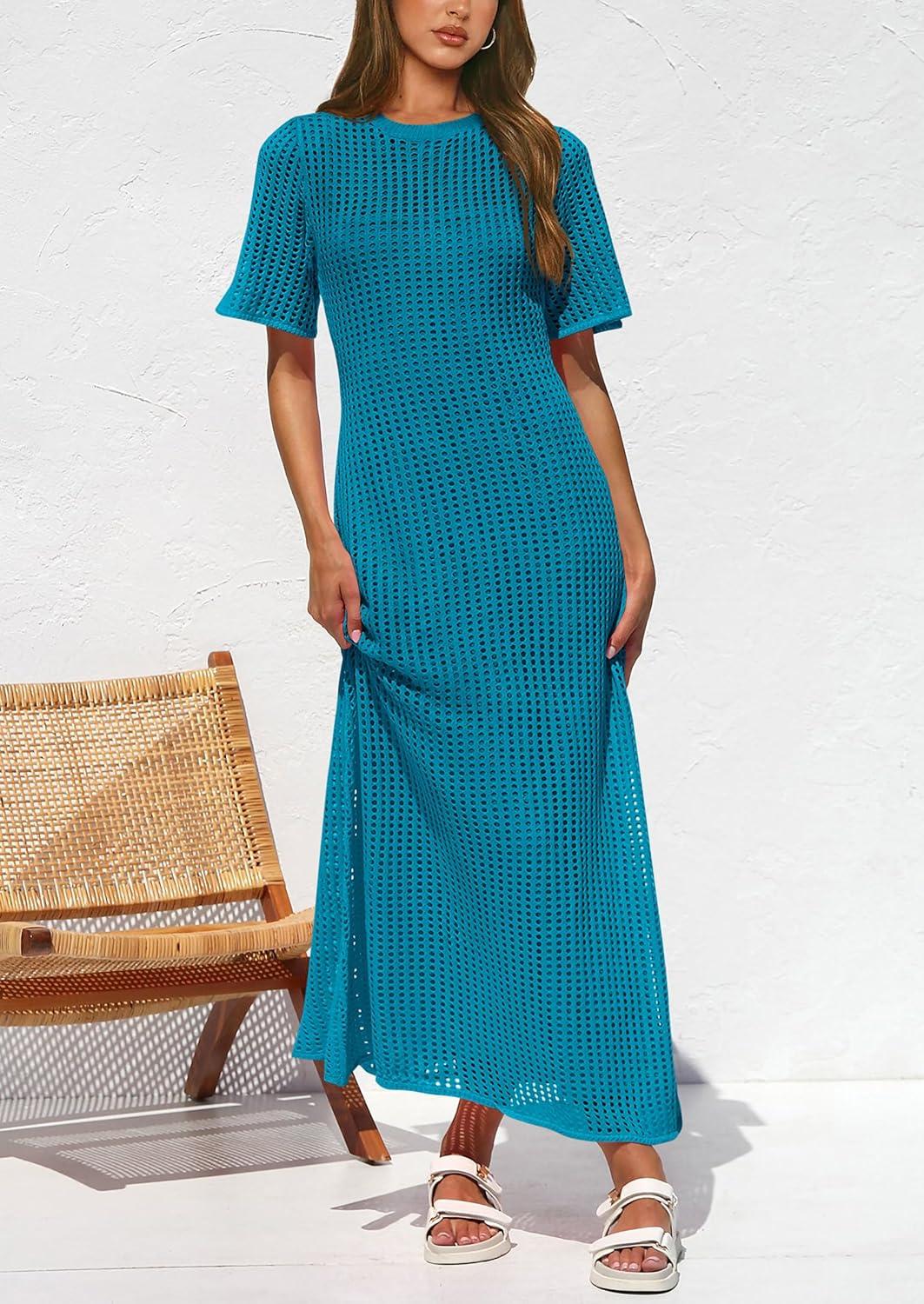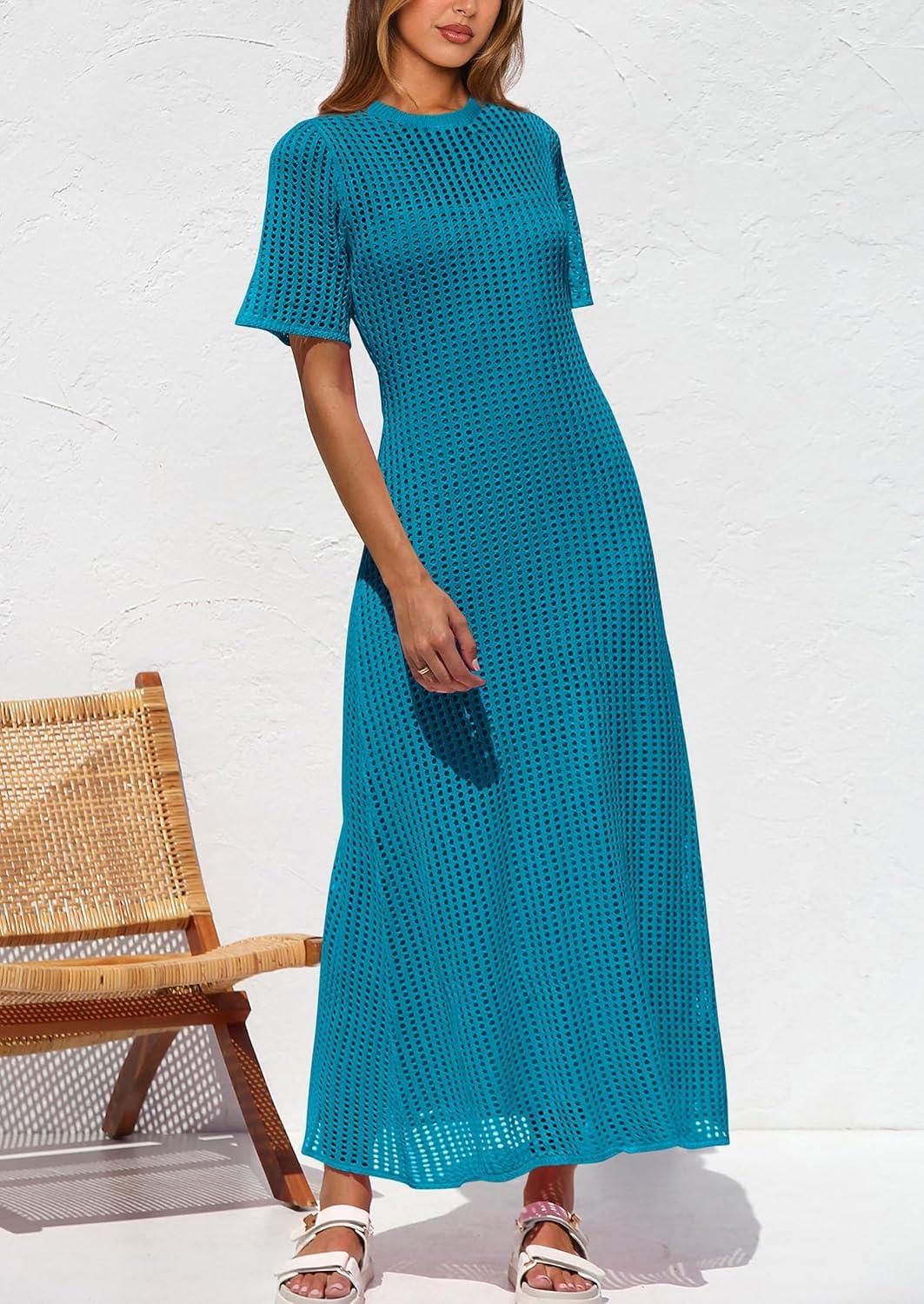 PRETTYGARDEN Womens Eyelet Cover Up Dress 2025 Summer Vacation Resort Maxi Dresses Beach Short Sleeve Hollow Out Sundress(Lake Blue)
