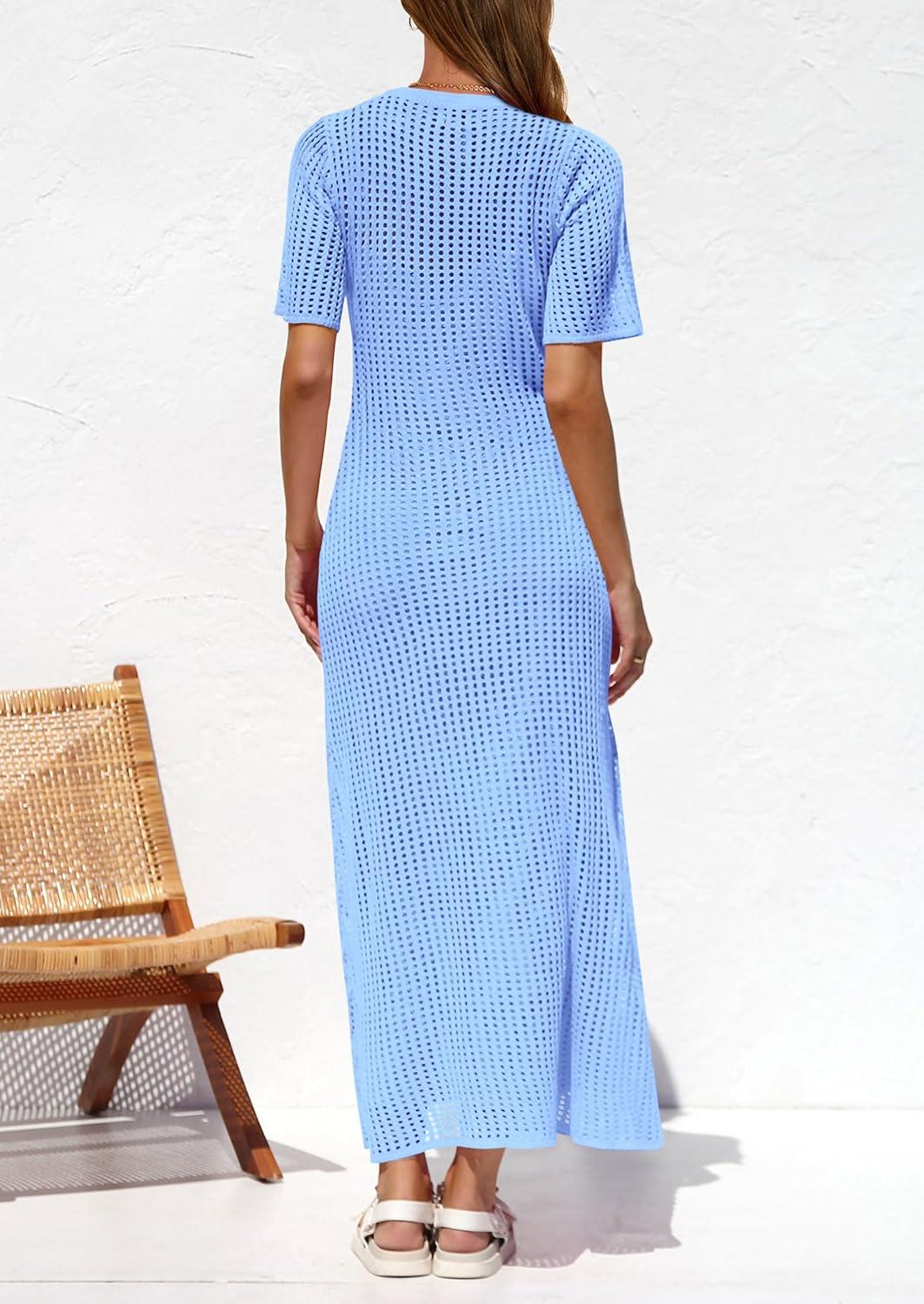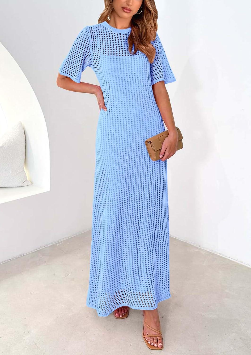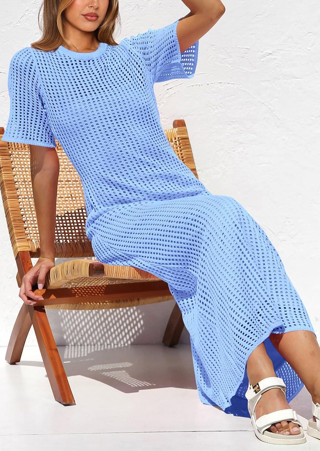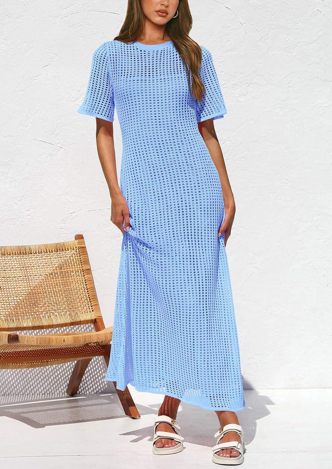 PRETTYGARDEN Womens Eyelet Cover Up Dress 2025 Summer Vacation Resort Maxi Dresses Beach Short Sleeve Hollow Out Sundress(Lake Blue)