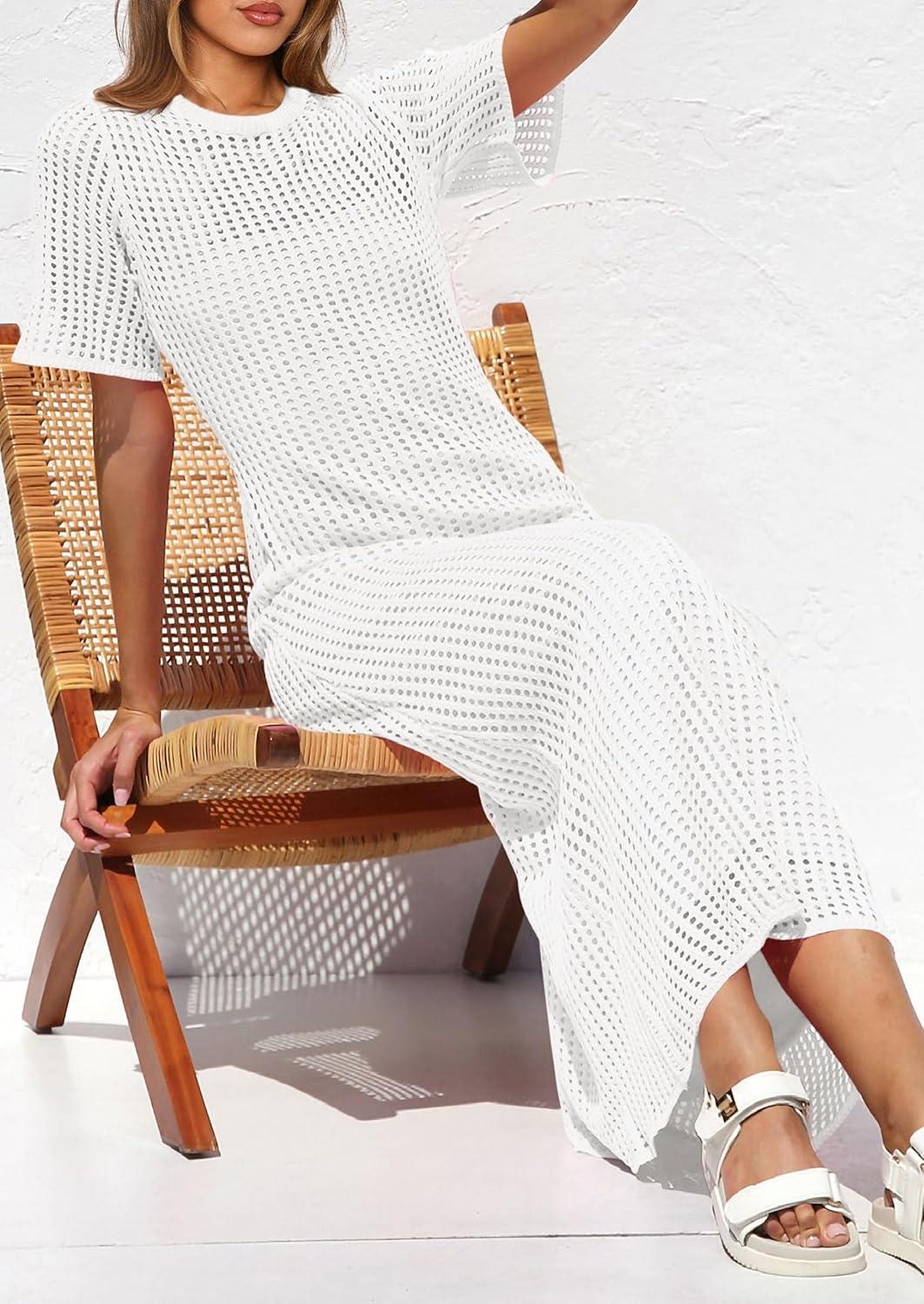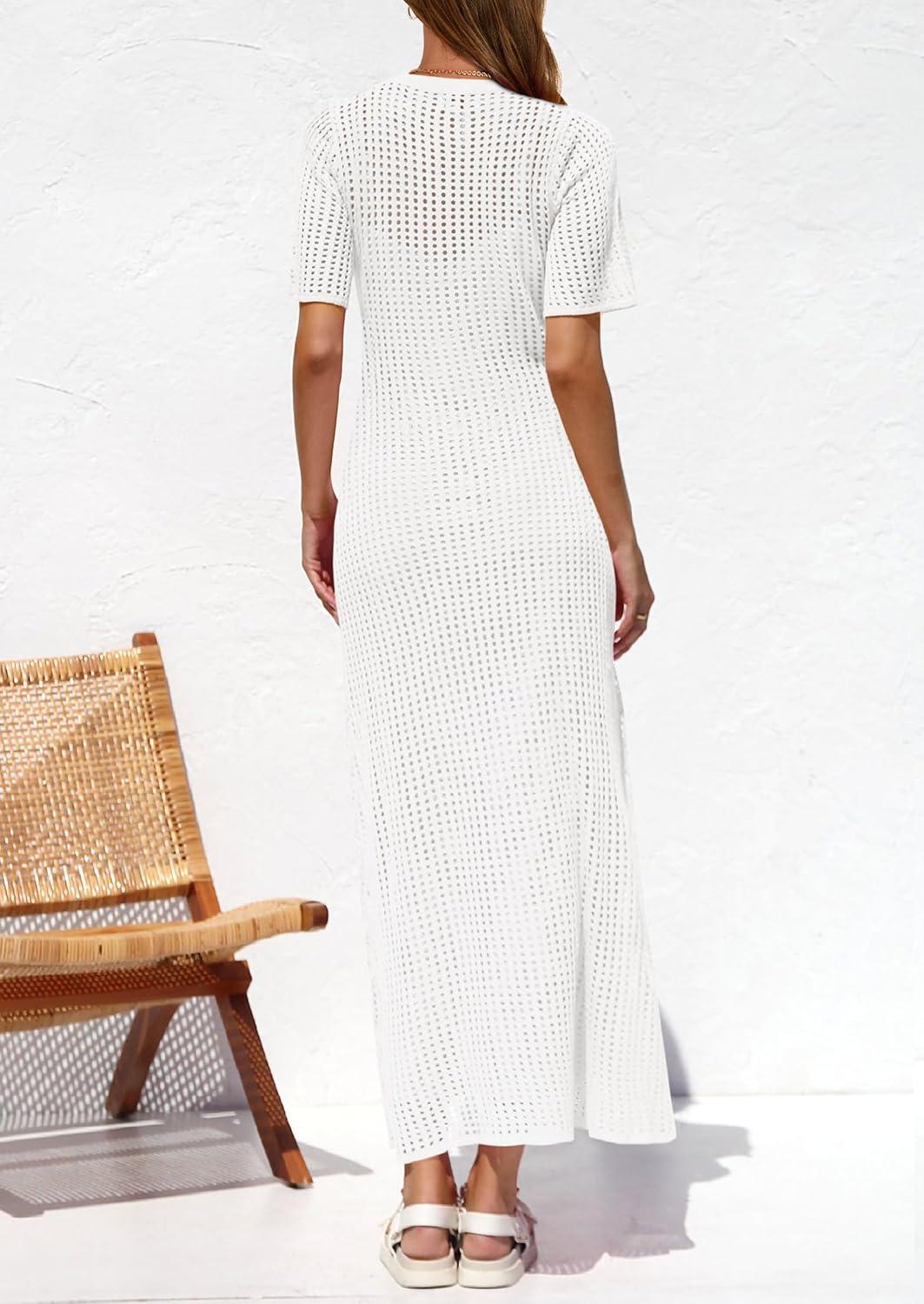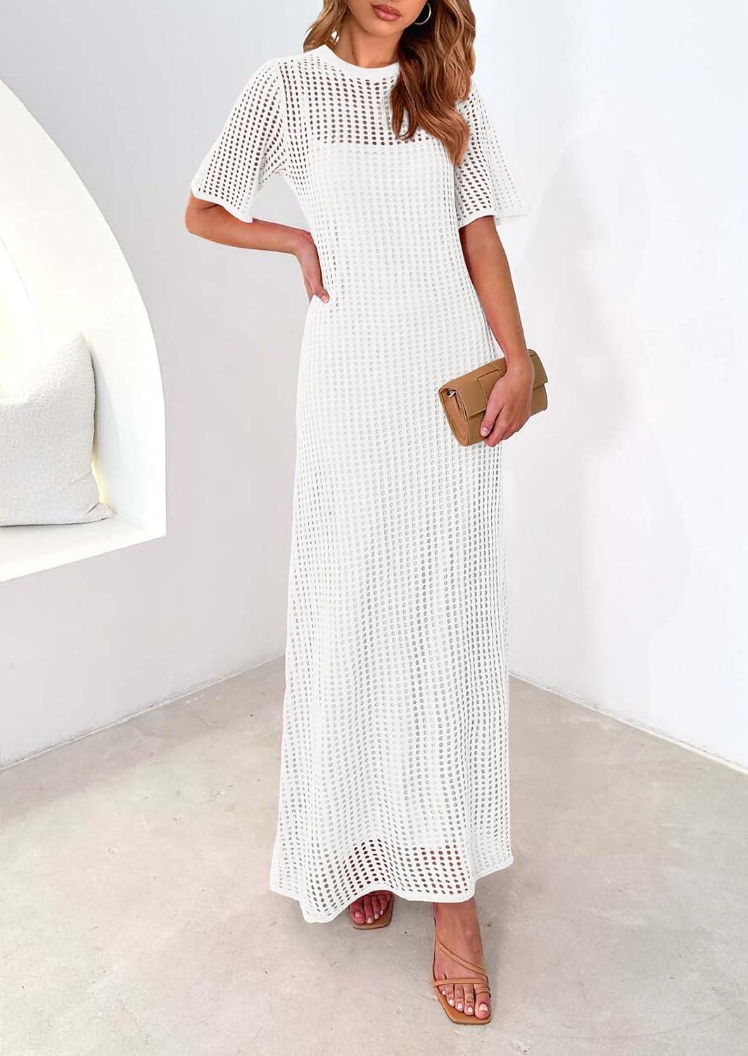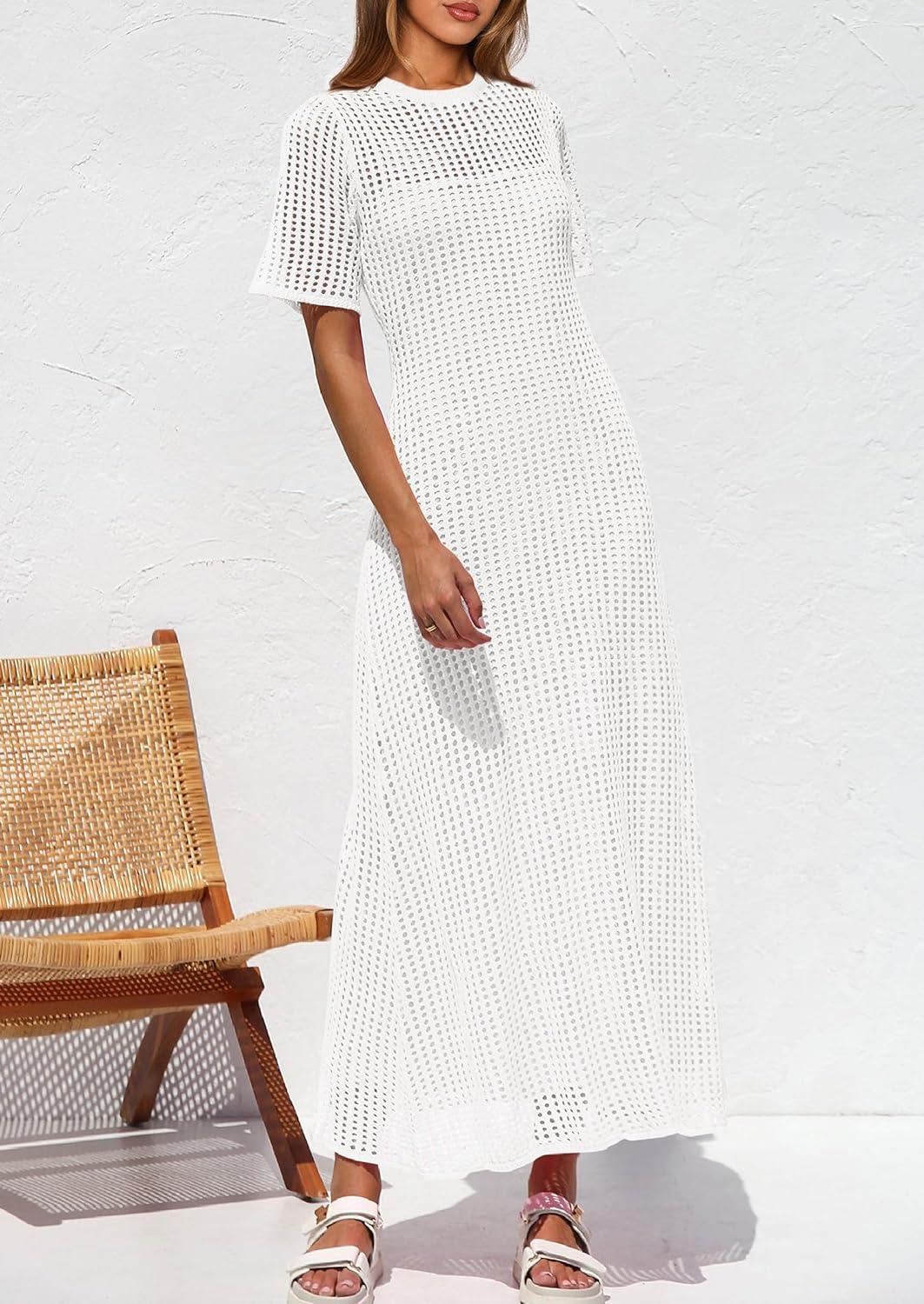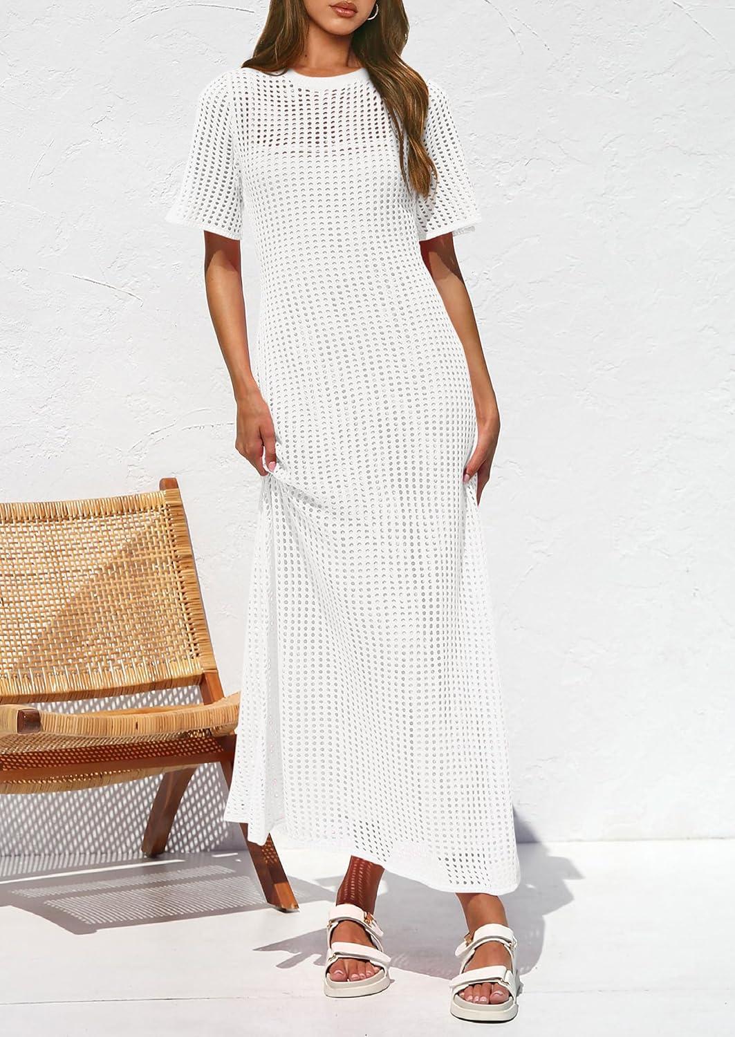 PRETTYGARDEN Womens Eyelet Cover Up Dress 2025 Summer Vacation Resort Maxi Dresses Beach Short Sleeve Hollow Out Sundress(White)