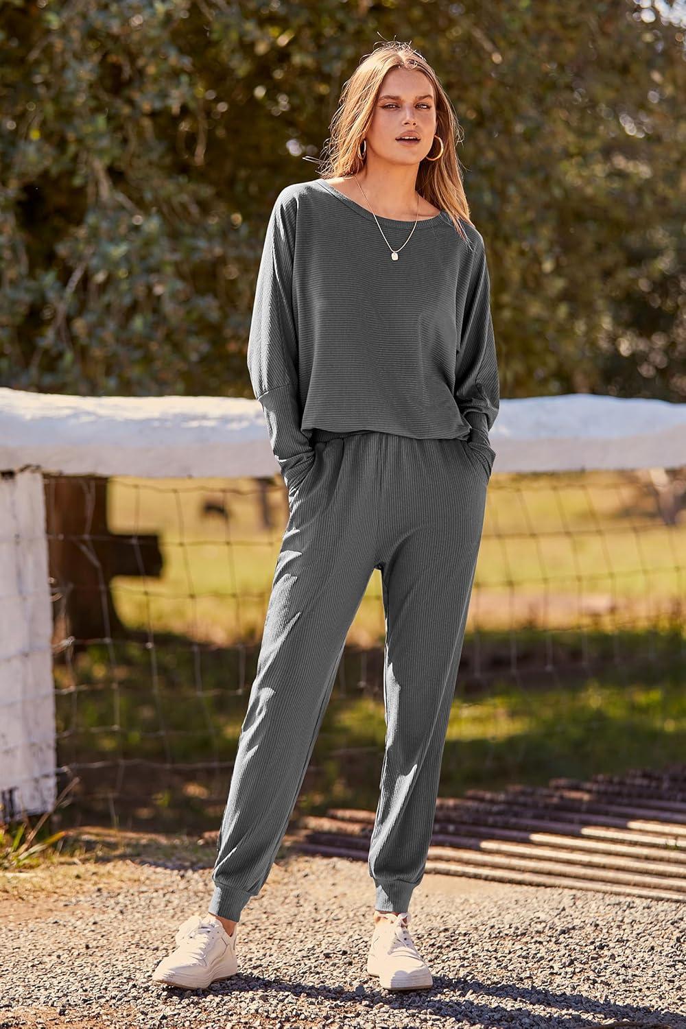 PRETTYGARDEN Women's Fall 2 Piece Lounge Set Long Sleeve Tops Ribbed Pants Spring Matching Sweatsuit Travel Outfits Clothes(Dark Grey)