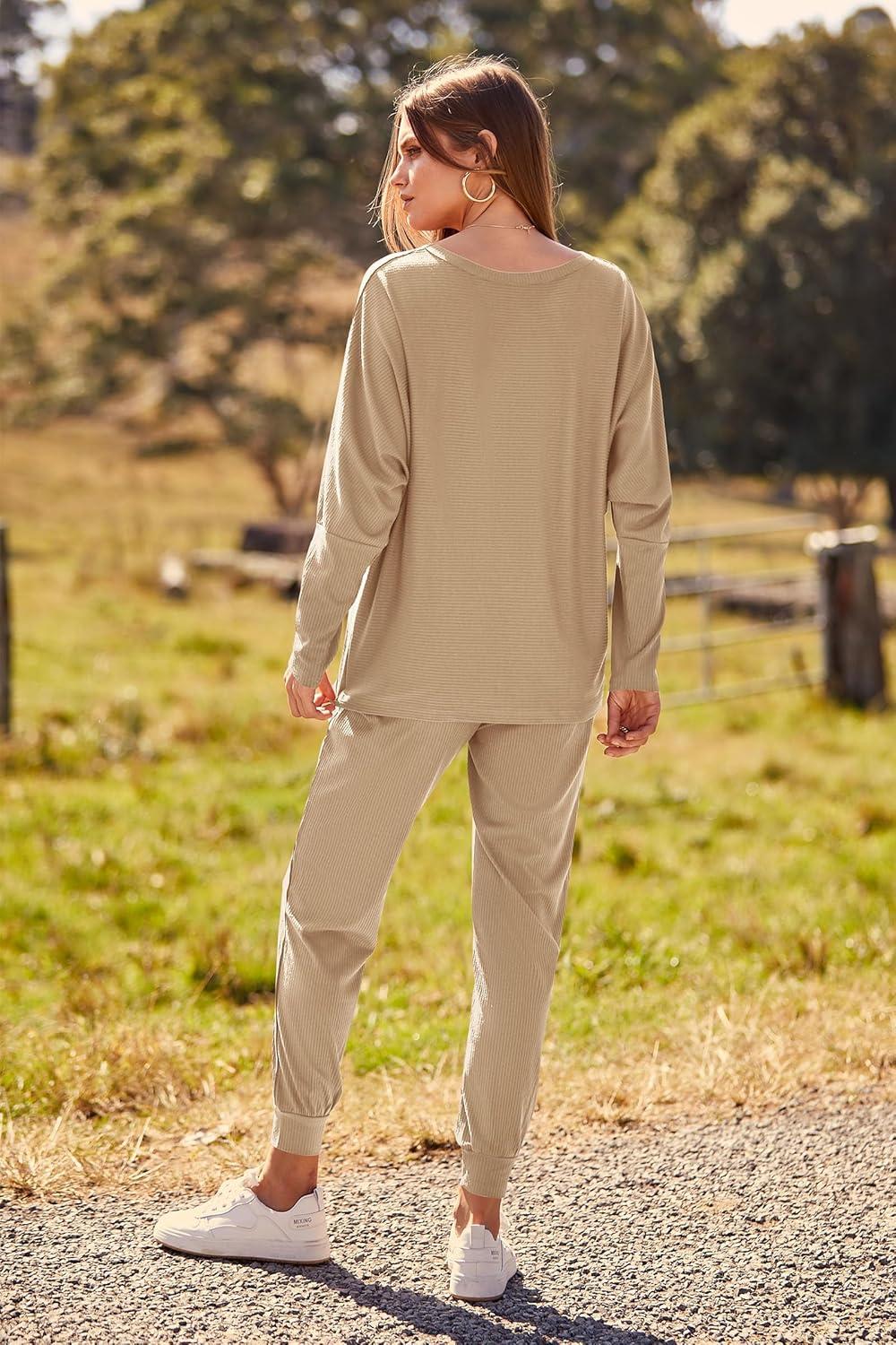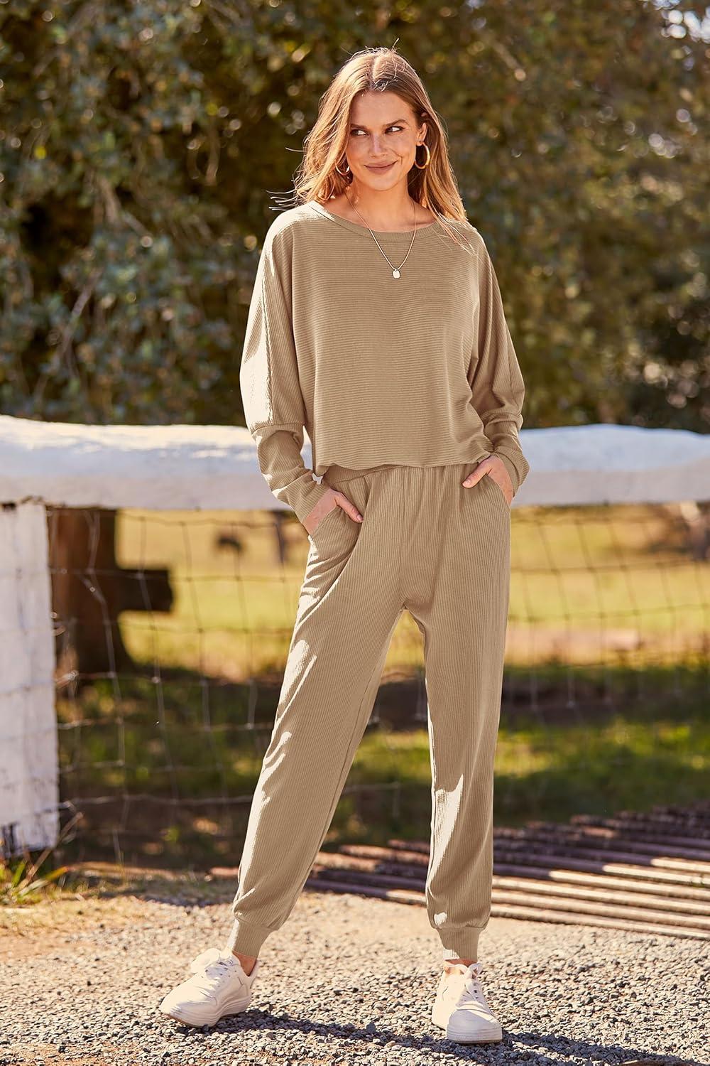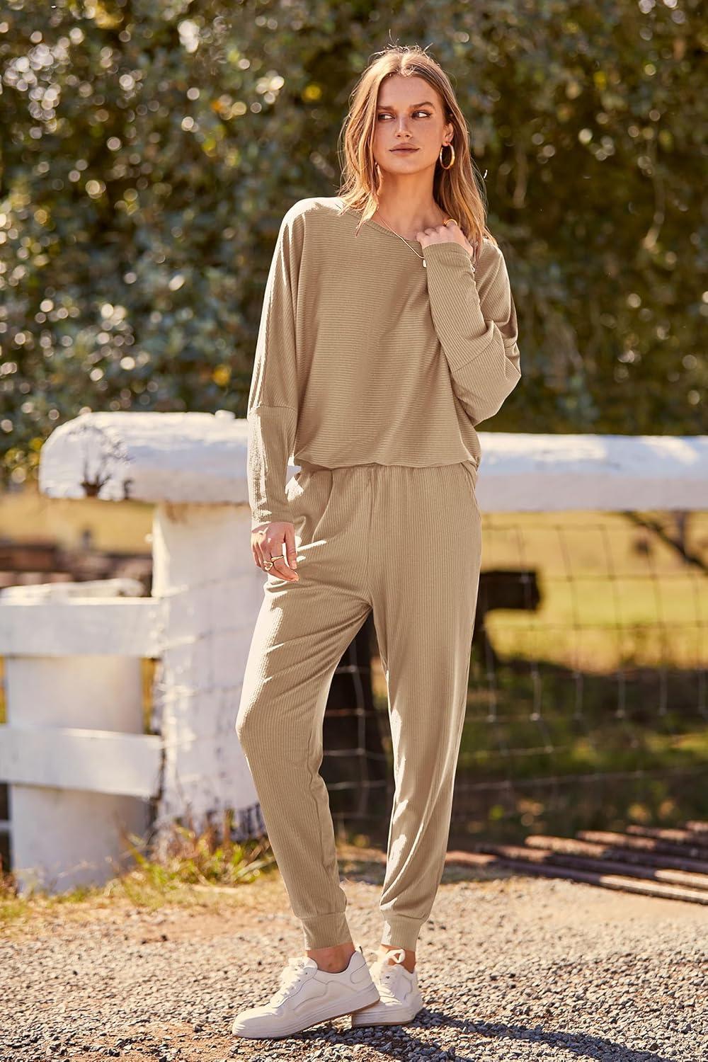 PRETTYGARDEN Women's Fall 2 Piece Lounge Set Long Sleeve Tops Ribbed Pants Spring Matching Sweatsuit Travel Outfits Clothes(Khaki)