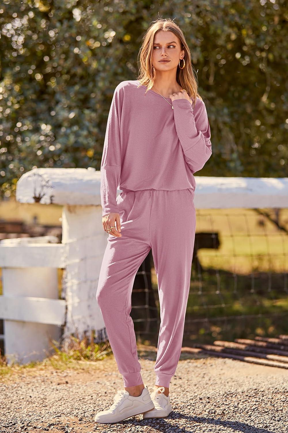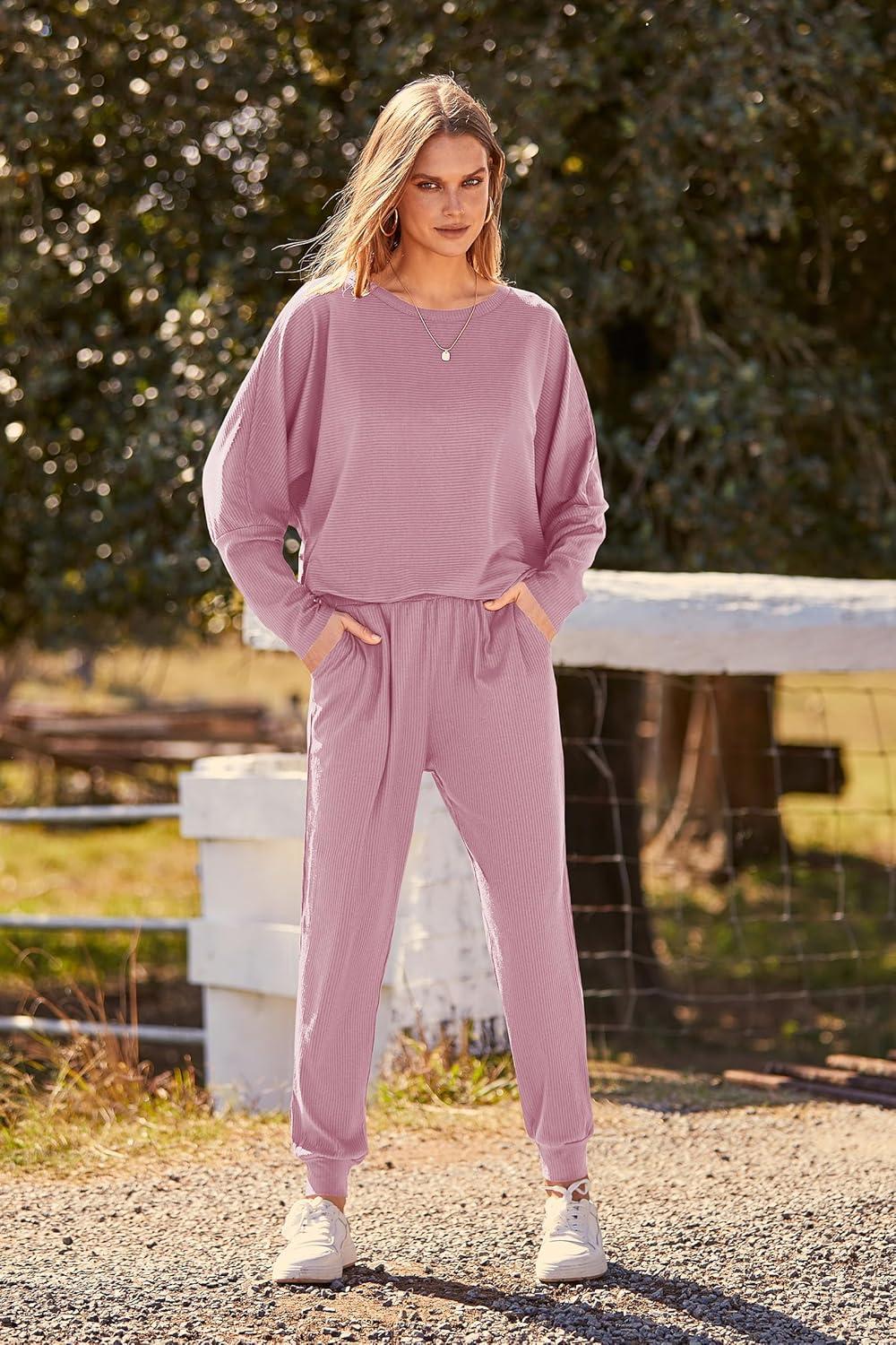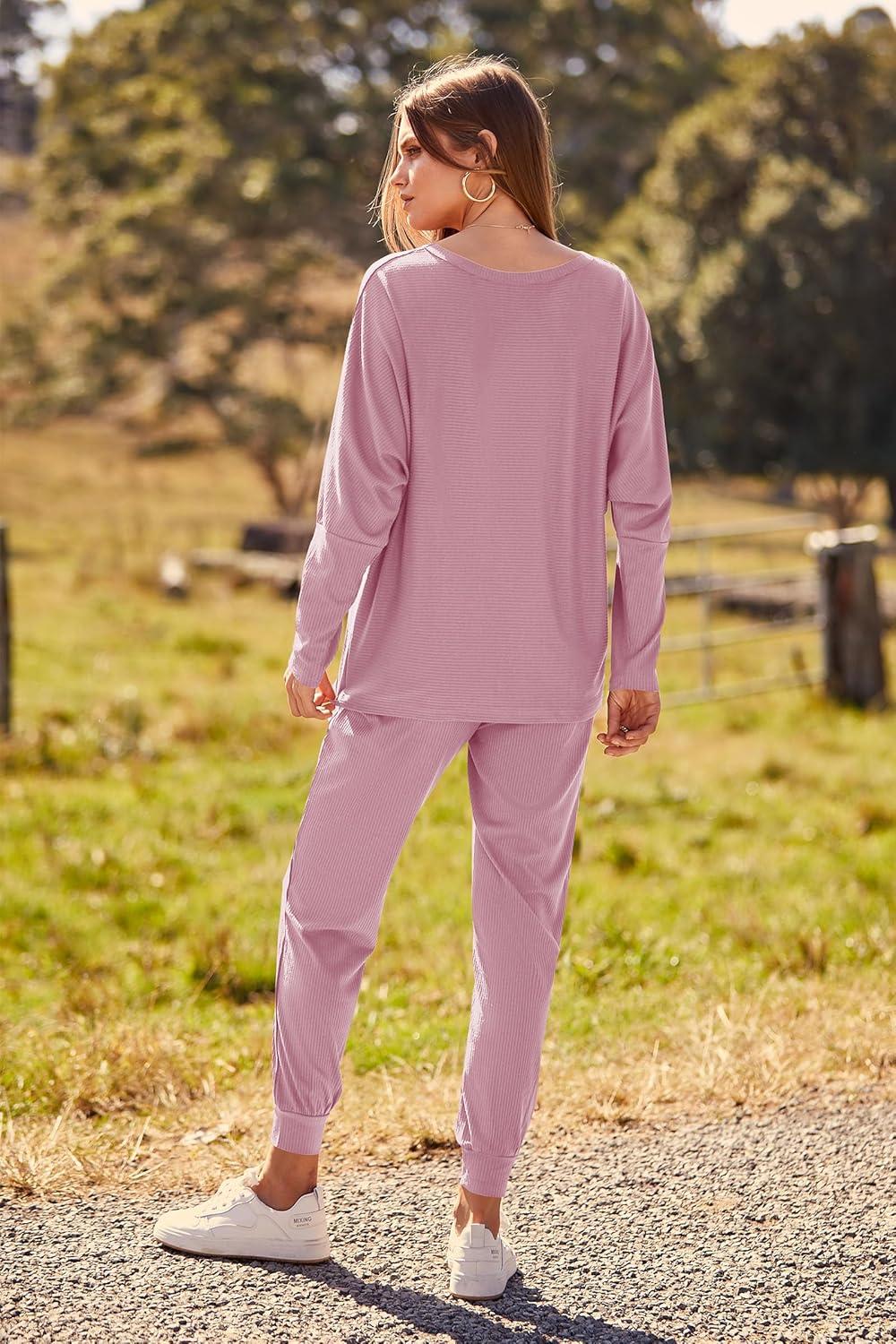 PRETTYGARDEN Women’s Fall 2 Piece Lounge Set Long Sleeve Tops Ribbed Pants Spring Matching Sweatsuit Travel Outfits Clothes(Pink)