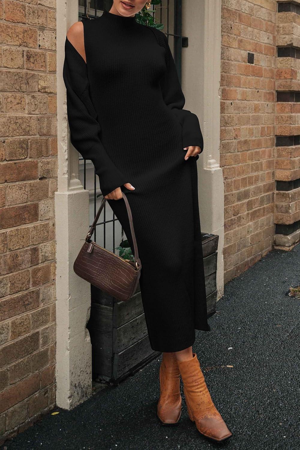 PRETTYGARDEN Women's Fall 2 Piece Outfits Knit Long Sleeve Cropped Cardigan Pullover Sweater Maxi Dress Sets Winter Clothing(Black)
