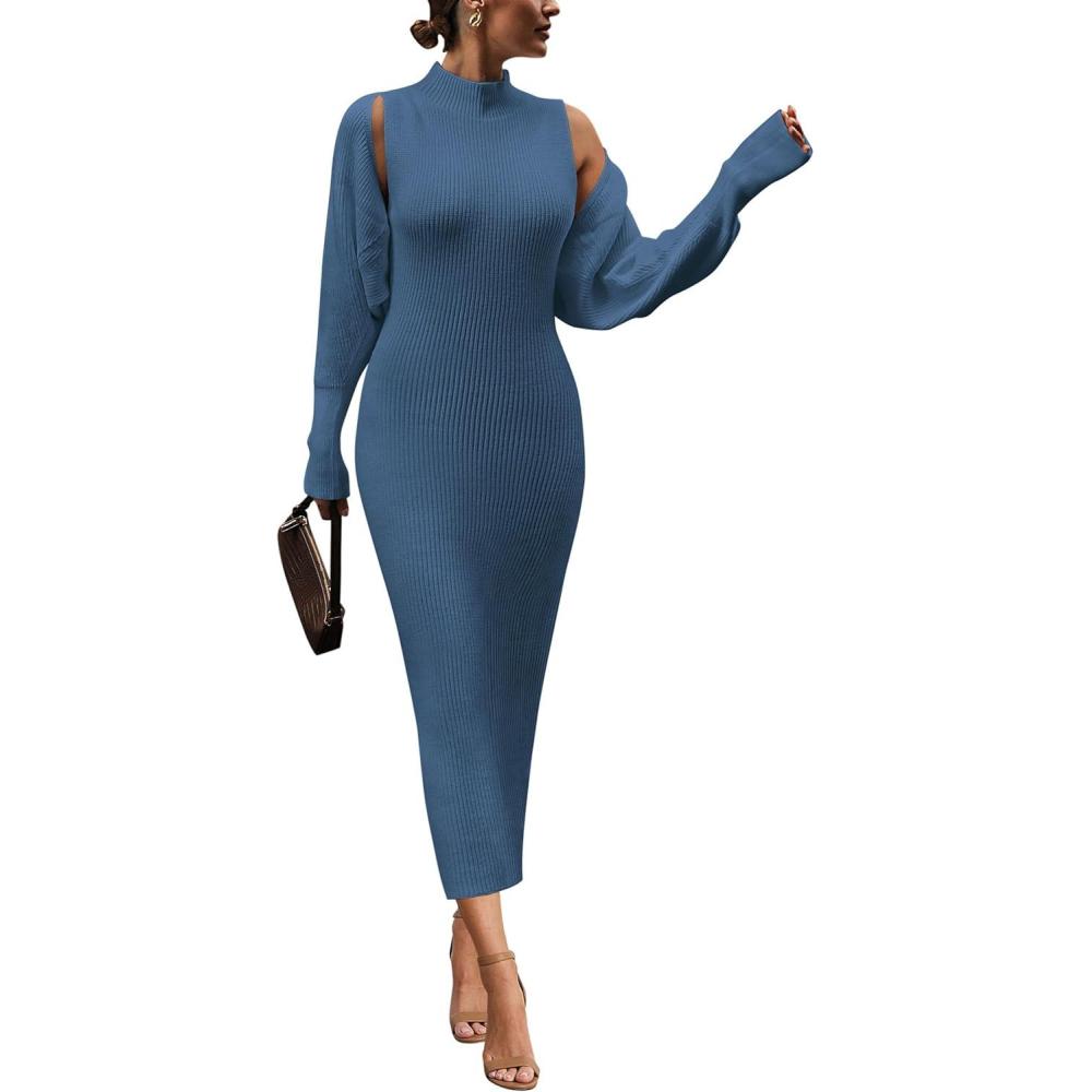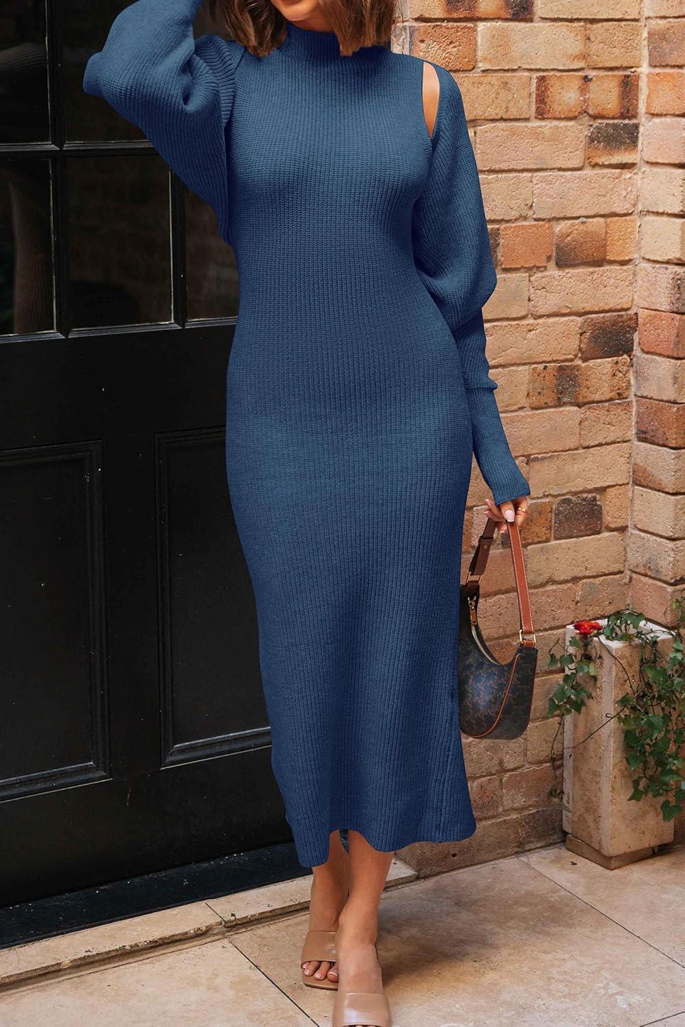 PRETTYGARDEN Women’s Fall 2 Piece Outfits Knit Long Sleeve Cropped Cardigan Pullover Sweater Maxi Dress Sets Winter Clothing(Blue)