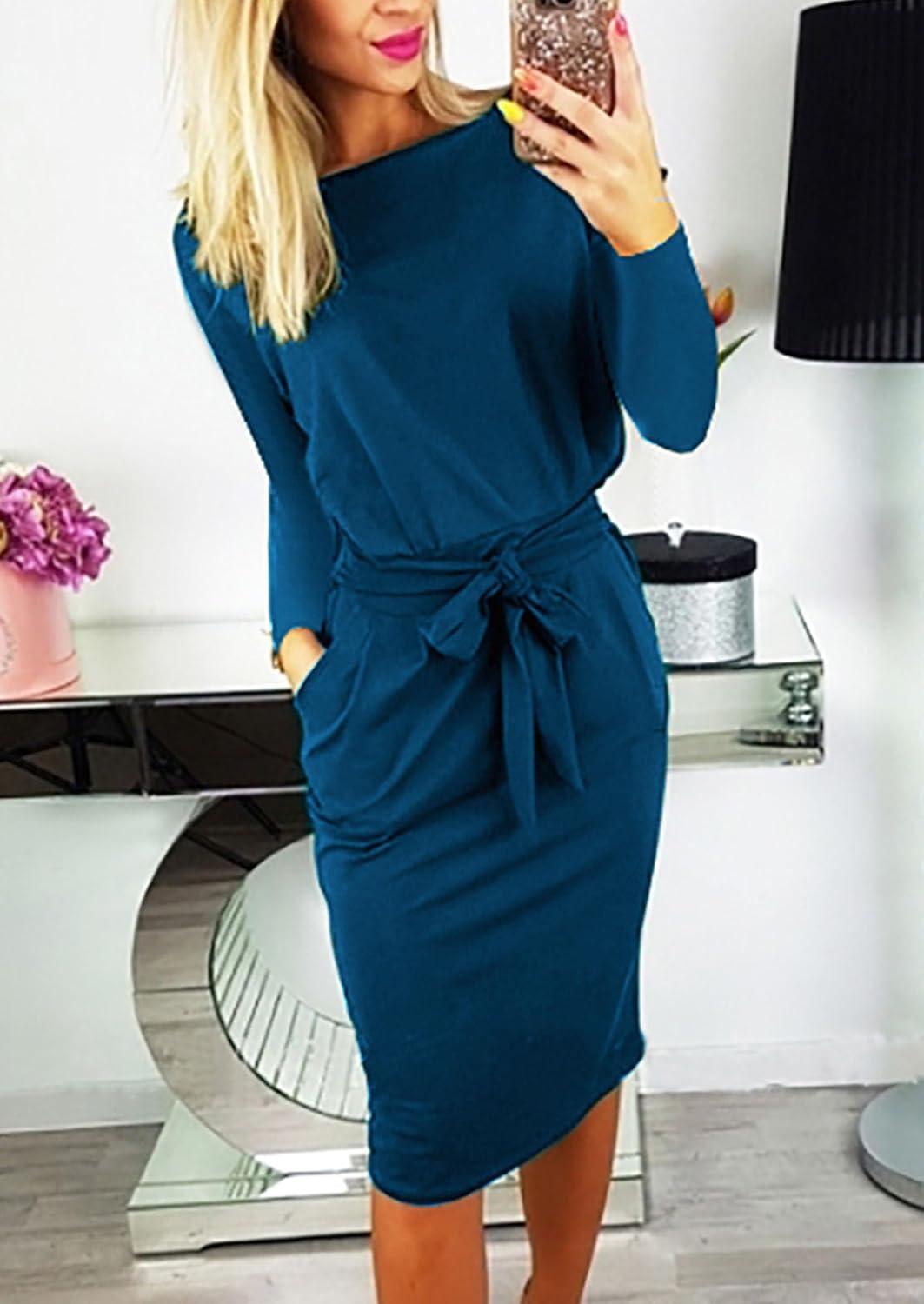 PRETTYGARDEN Women’s Fall Bodycon Party Dress Casual Long Sleeve Tie Waist Fitted Sheath Pencil Dresses with Pockets(Dark Green)