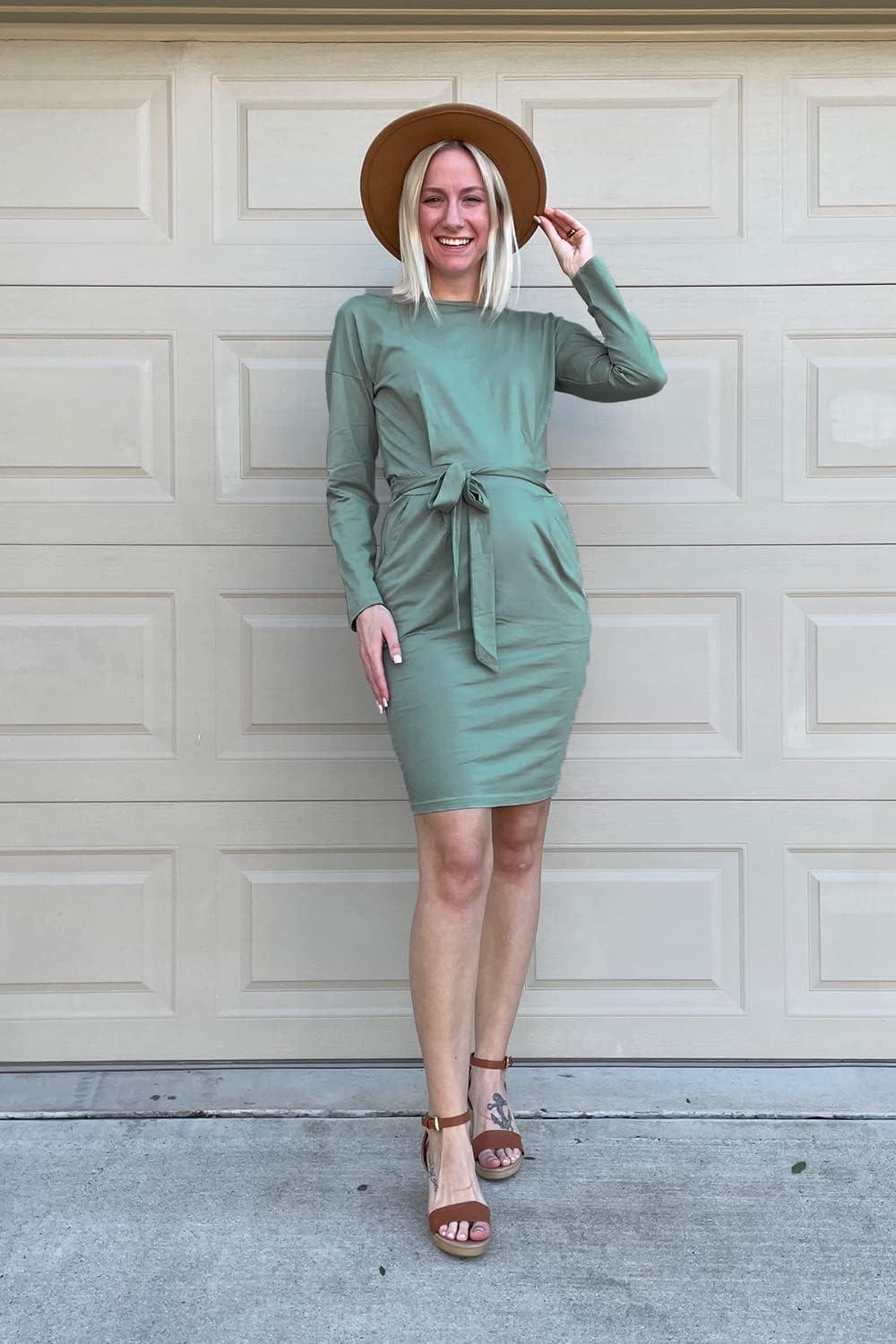 PRETTYGARDEN Women’s Fall Bodycon Party Dress Casual Long Sleeve Tie Waist Fitted Sheath Pencil Dresses with Pockets(Grey Green)