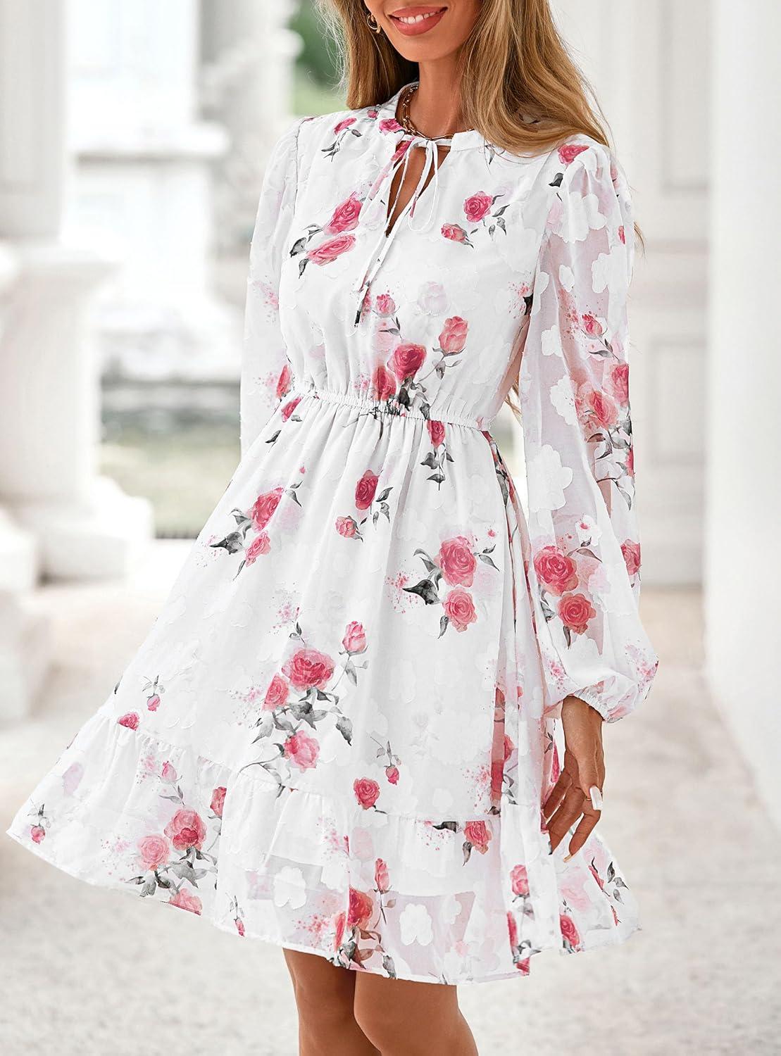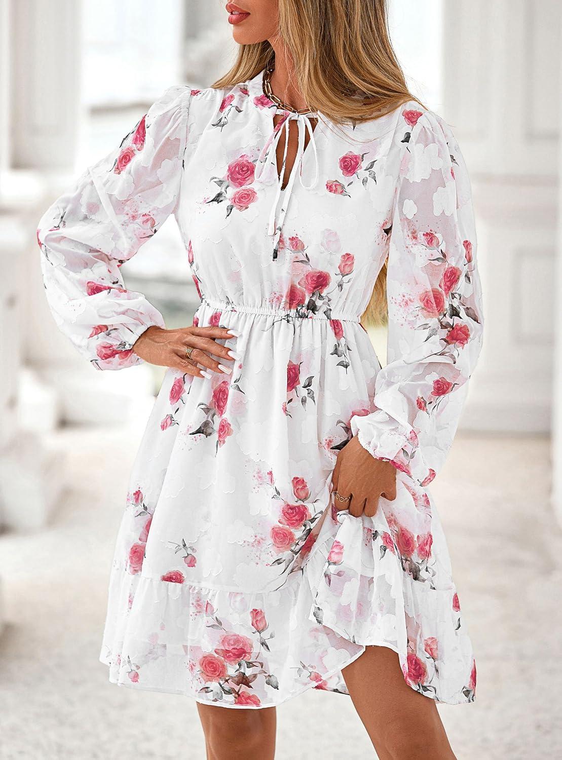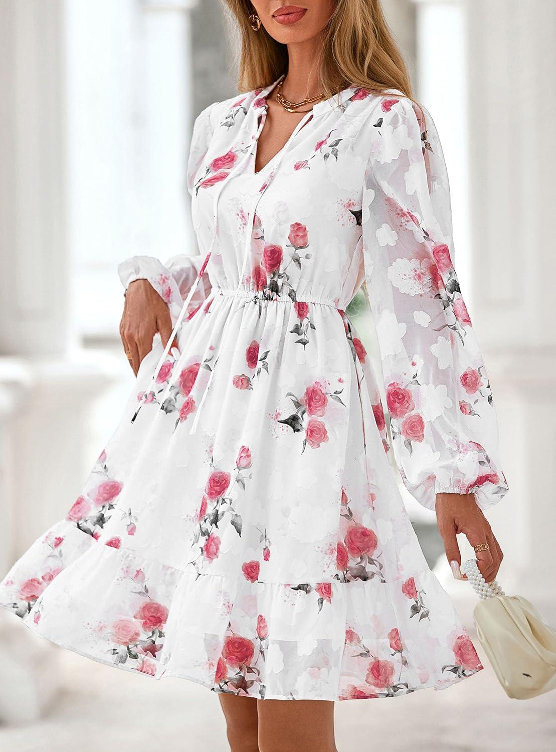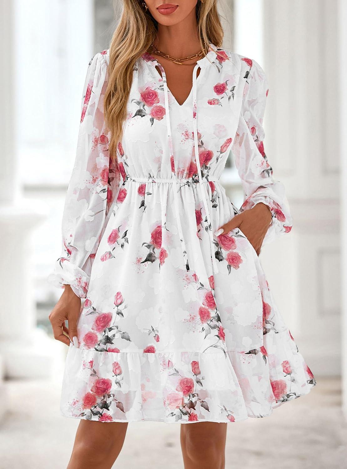 PRETTYGARDEN Women’s Fall Boho Dresses 2025 Floral Long Sleeve V Neck Mini Flowy Wedding Guest Dress Trendy Vacation Outfits(Floral White Red)