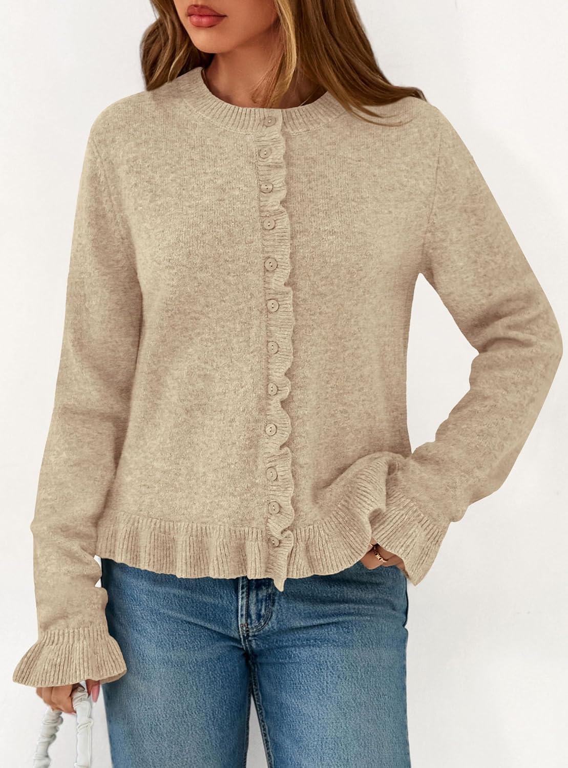 PRETTYGARDEN Womens Fall Button Down Cardigans Chunky Knit Ruffle Open Front Cropped Cardigan Sweaters Soft Long Sleeve Tops(Khaki)