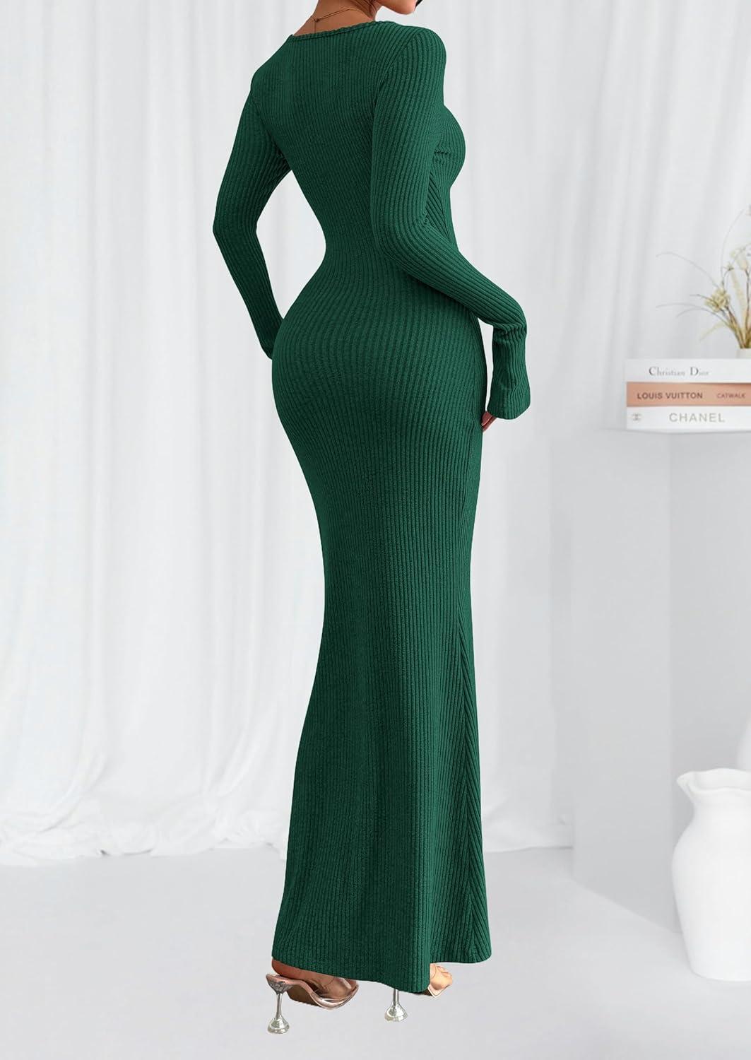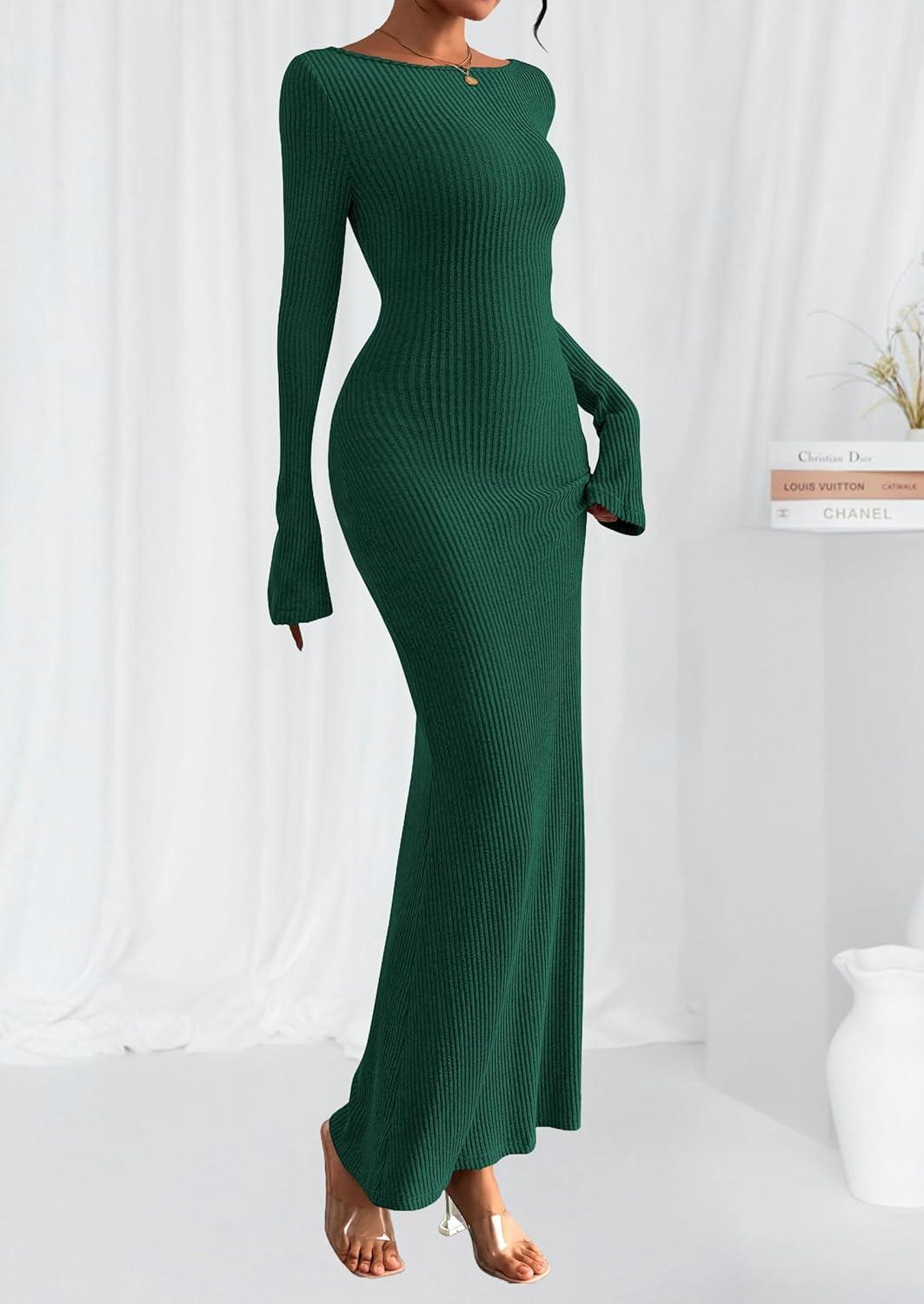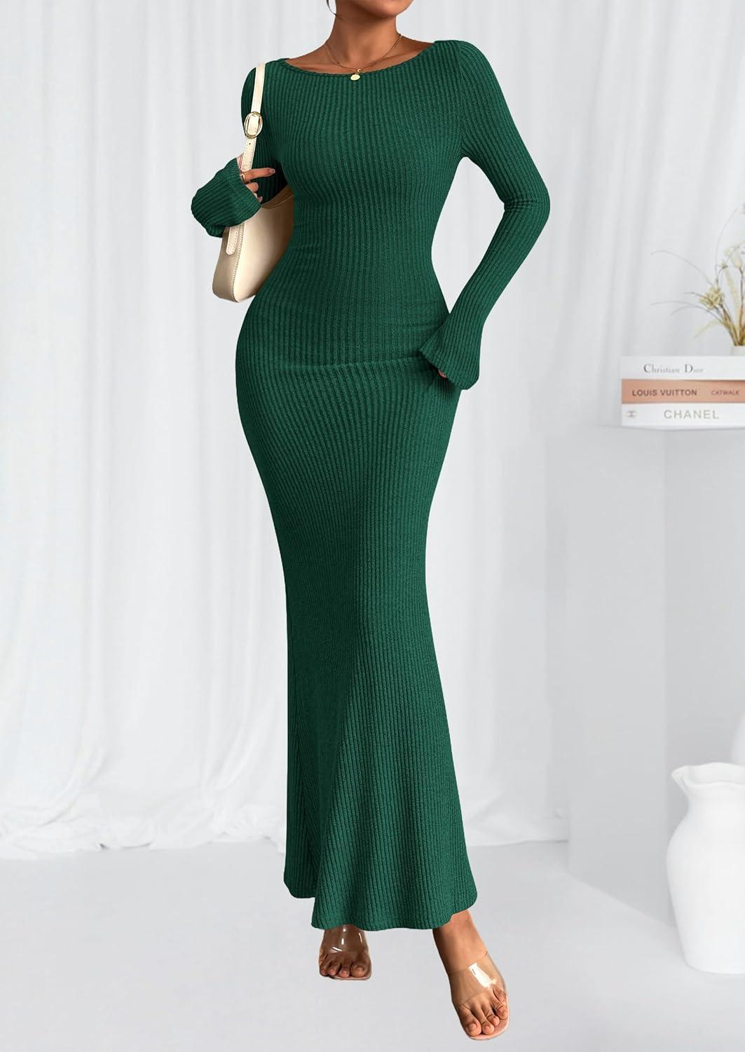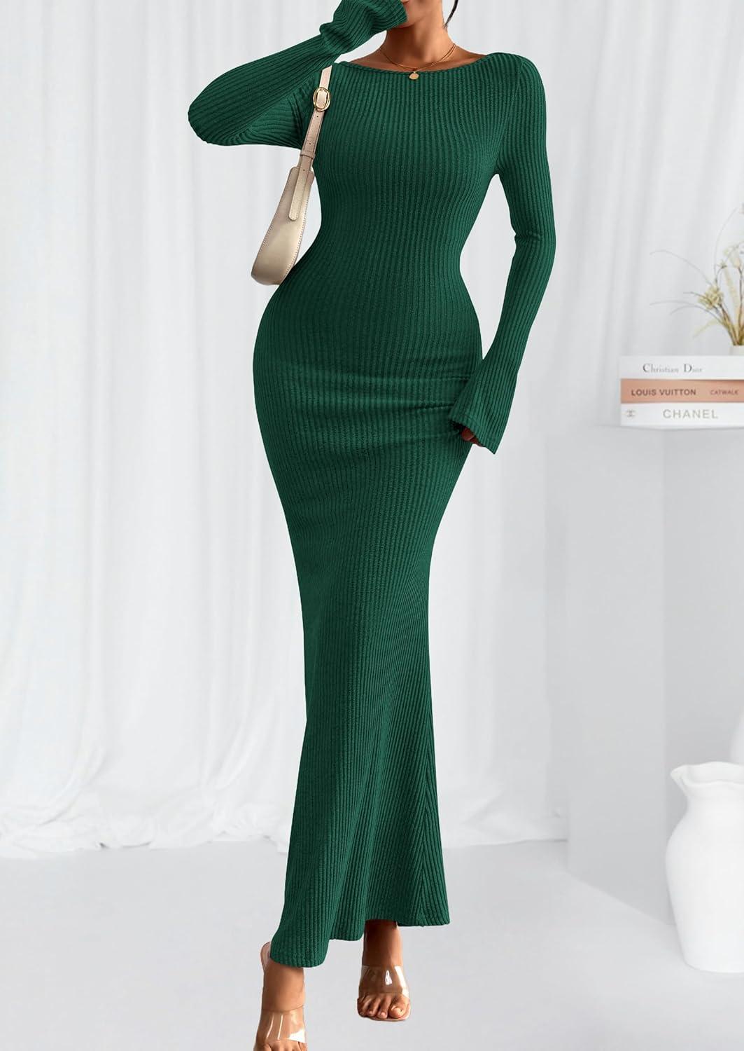 PRETTYGARDEN Women's Fall Fashion 2025 Long Sleeve Maxi Dress Ribbed Knit Boat Neck Bodycon Casual Dresses Going Out Outfits(Dark Green)