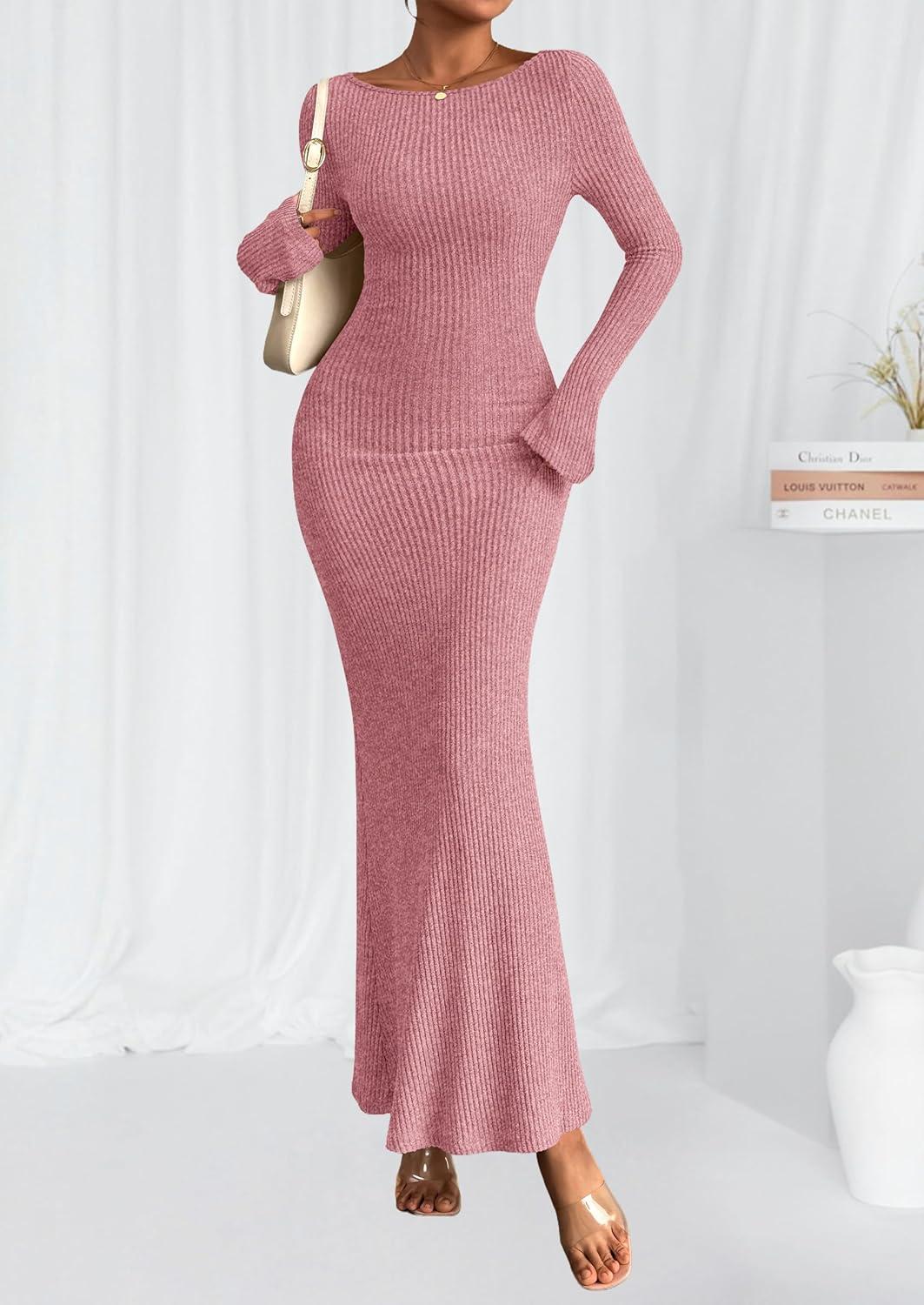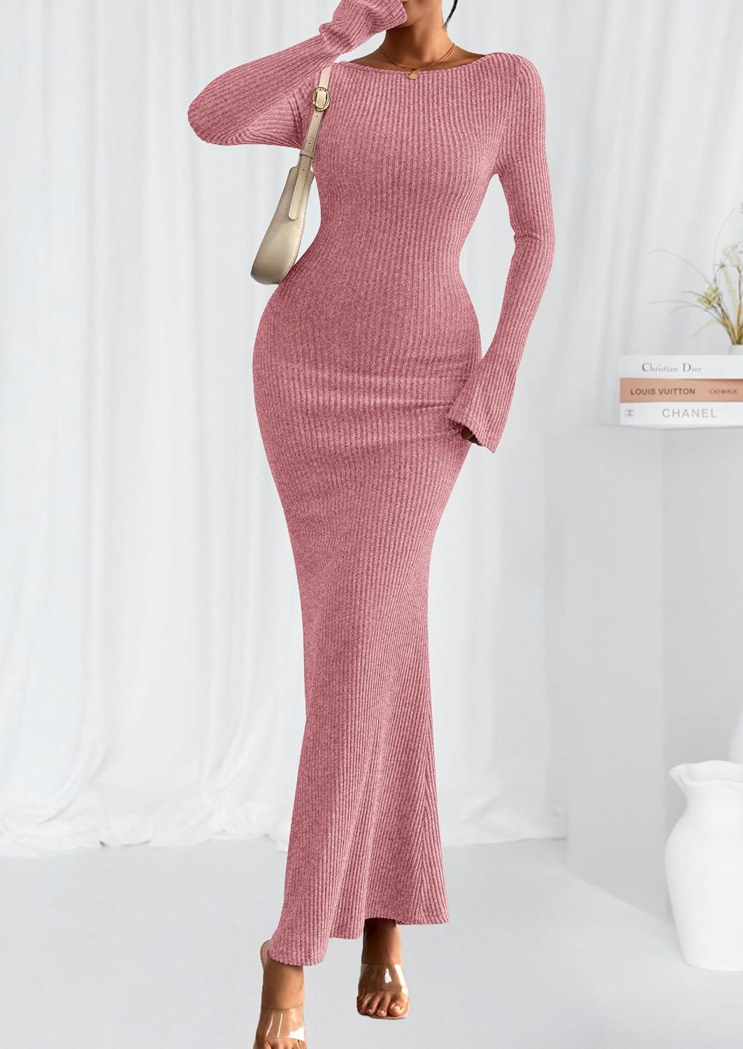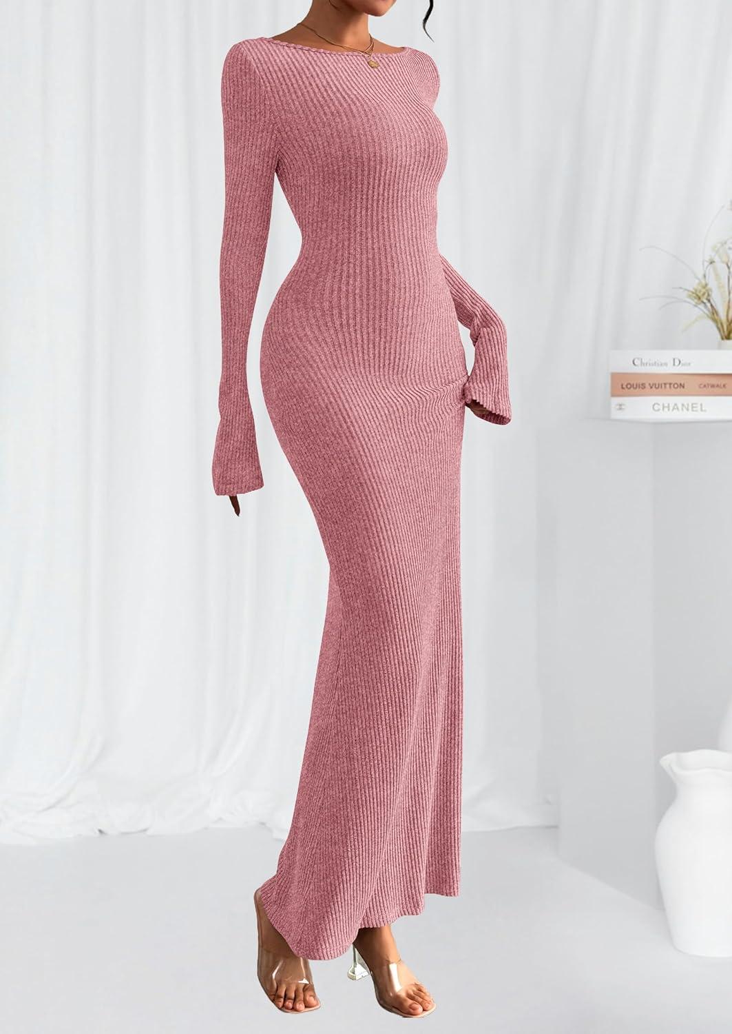 PRETTYGARDEN Women’s Fall Fashion 2025 Long Sleeve Maxi Dress Ribbed Knit Boat Neck Bodycon Casual Dresses Going Out Outfits(Pink)
