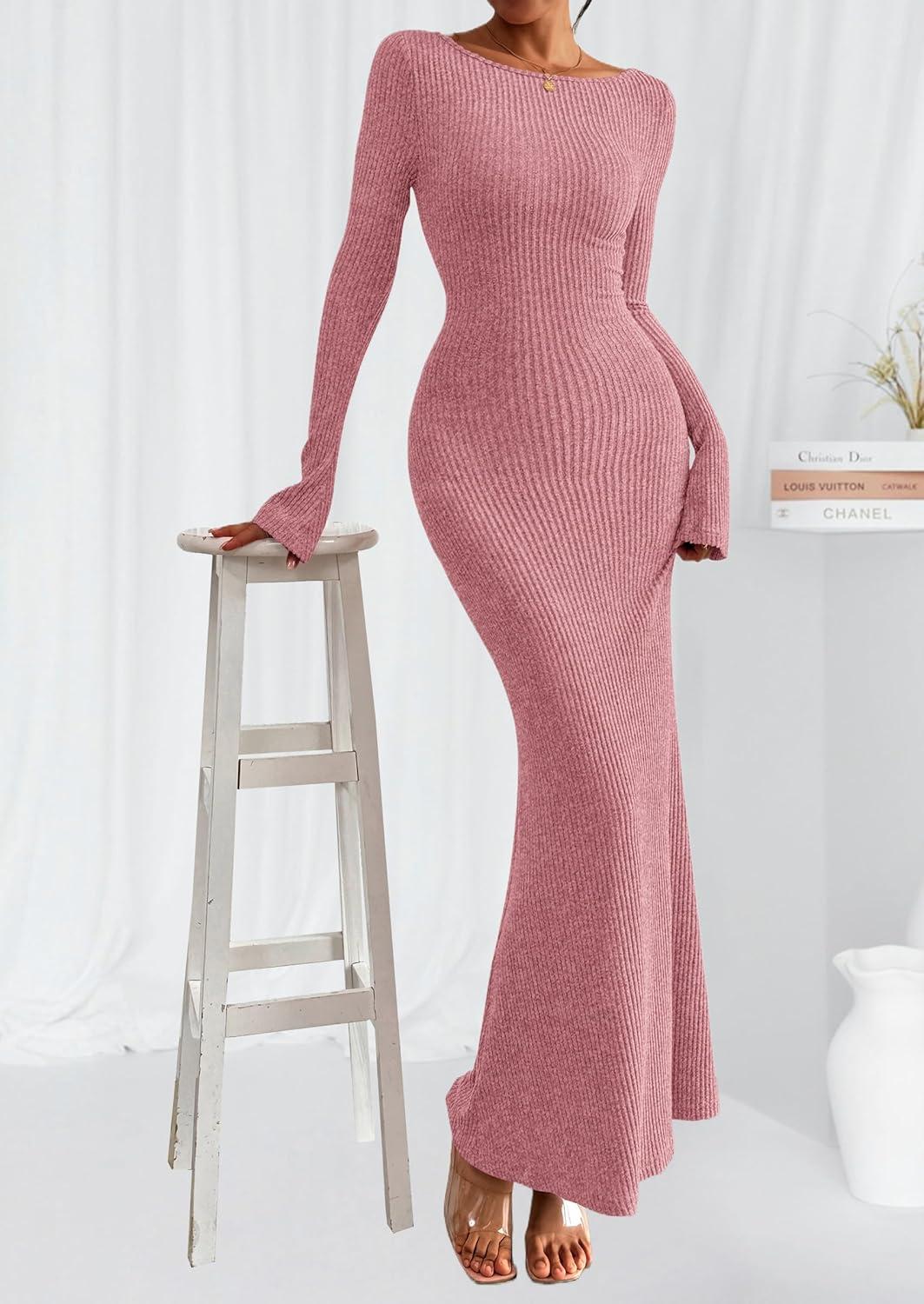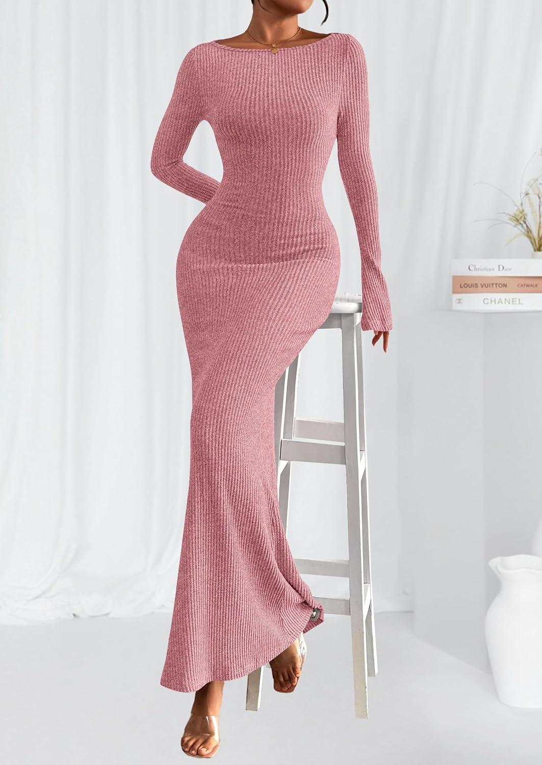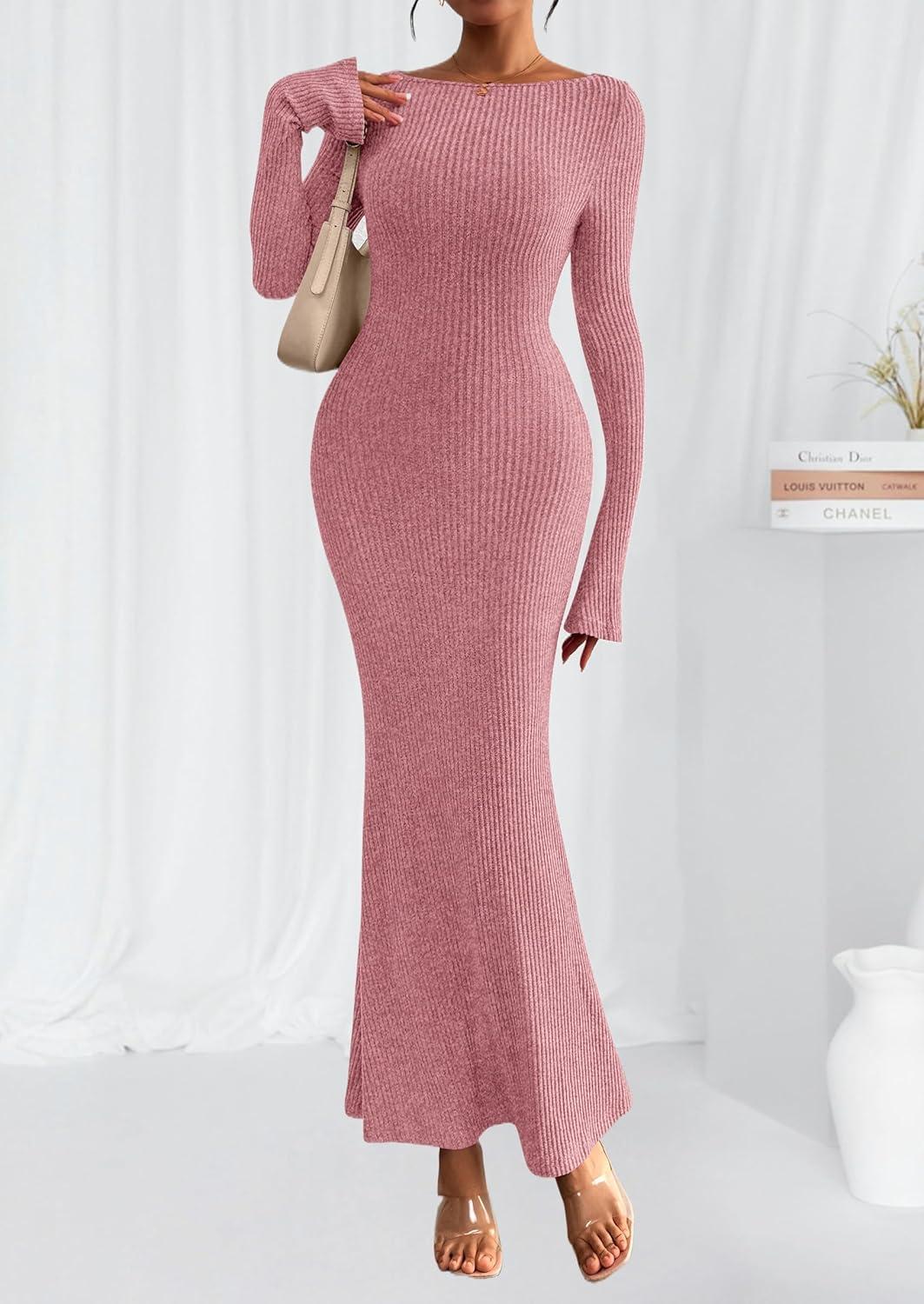 PRETTYGARDEN Women’s Fall Fashion 2025 Long Sleeve Maxi Dress Ribbed Knit Boat Neck Bodycon Casual Dresses Going Out Outfits(Pink)