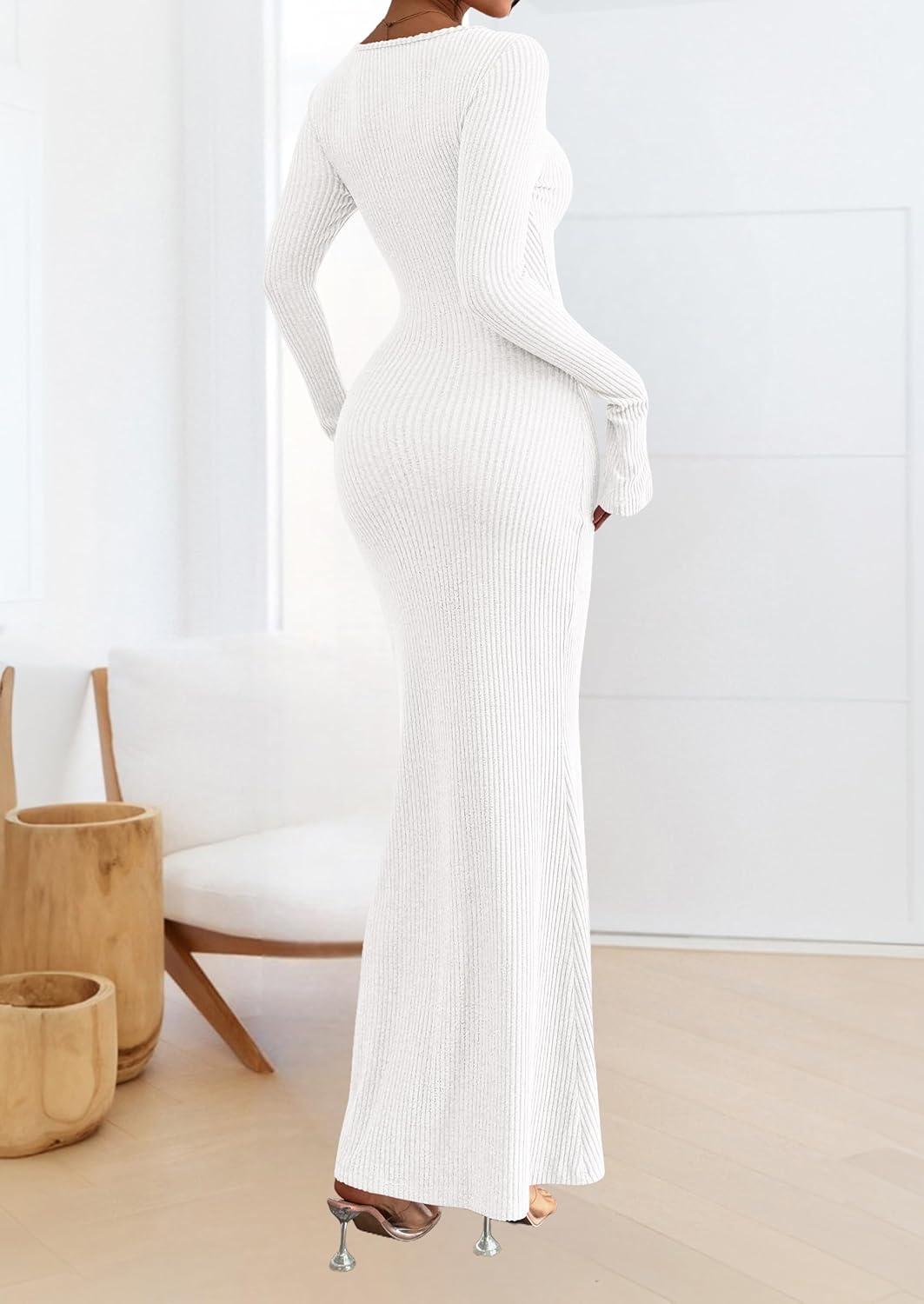 PRETTYGARDEN Women’s Fall Fashion 2025 Long Sleeve Maxi Dress Ribbed Knit Boat Neck Bodycon Casual Dresses Going Out Outfits(White)