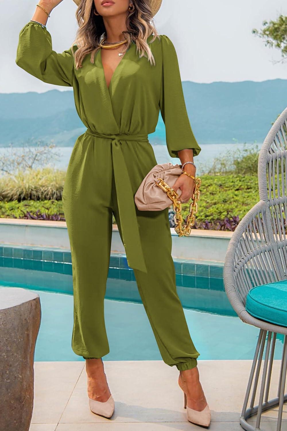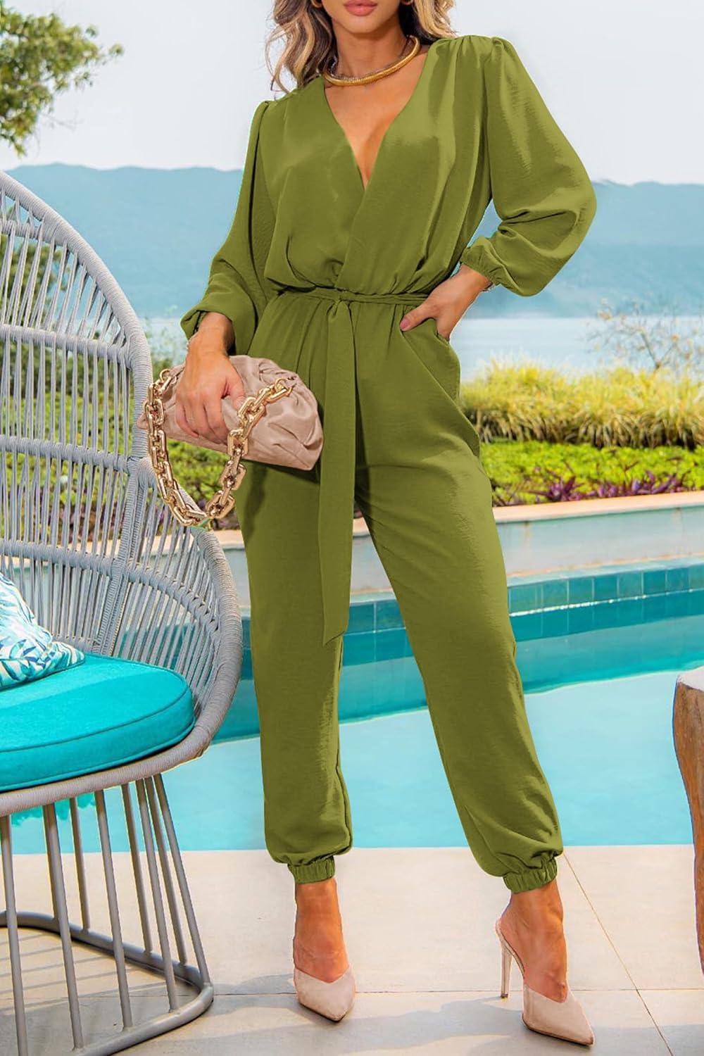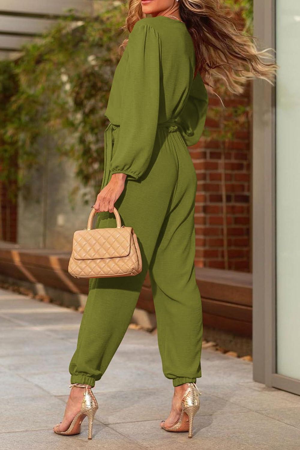 PRETTYGARDEN Women's Fall Jumpsuits Dressy Casual Pants Romper Spring Long Sleeve V Neck Belt Pockets One Piece Outfits(Olive Green)