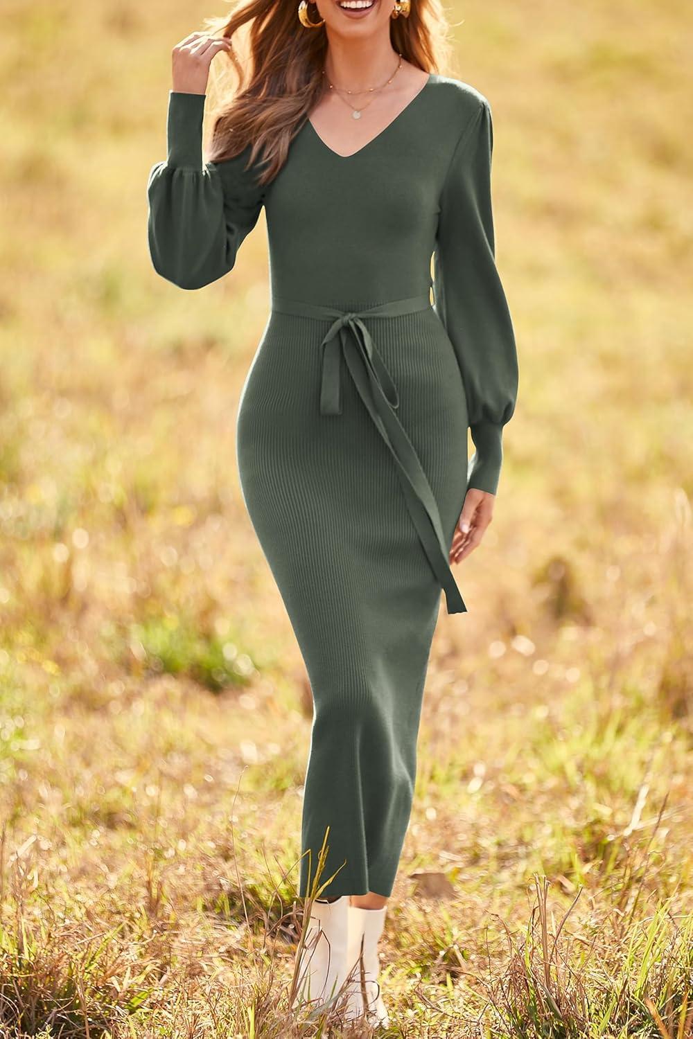PRETTYGARDEN Women's Fall Knit Pullover Sweater Dress Elegant Long Lantern Sleeve V Neck Winter Maxi Bodycon Dresses(Army Green)