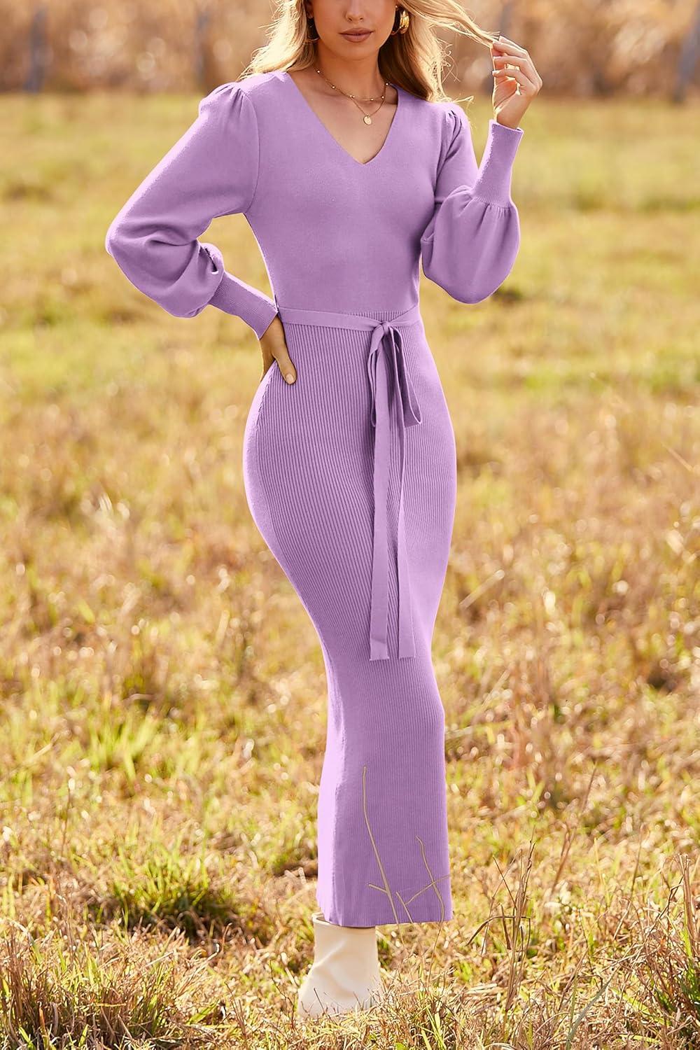 PRETTYGARDEN Women’s Fall Knit Pullover Sweater Dress Elegant Long Lantern Sleeve V Neck Winter Maxi Bodycon Dresses(Light Purple)