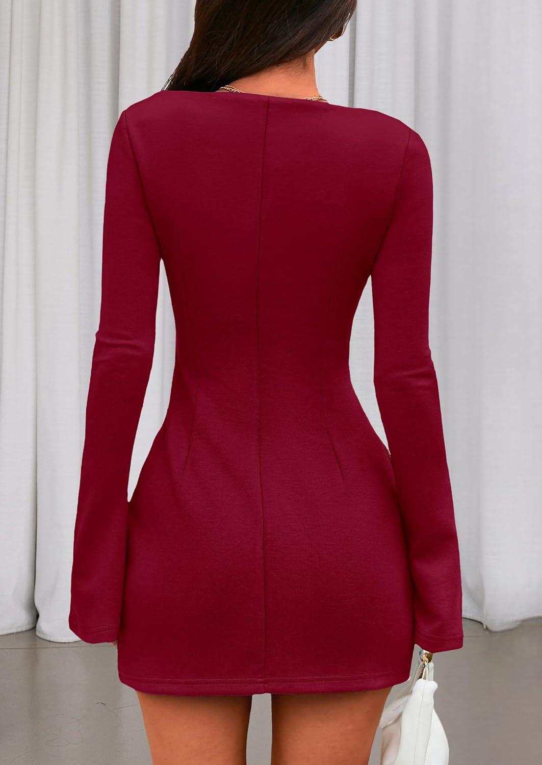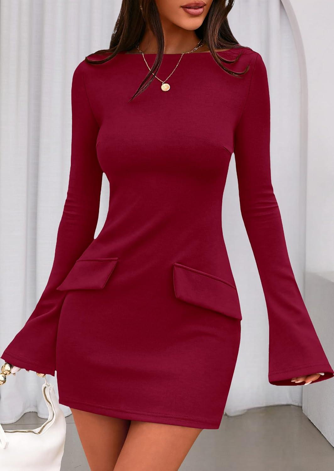 PRETTYGARDEN Womens Fall Long Sleeve Mini Dress 2025 Trendy Boat Neck Bodycon Knit Elegant Short Party Formal Dresses(Red)