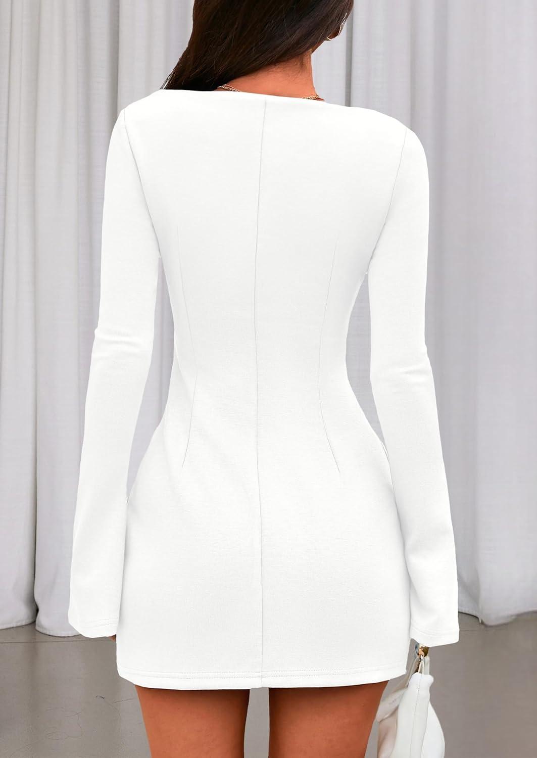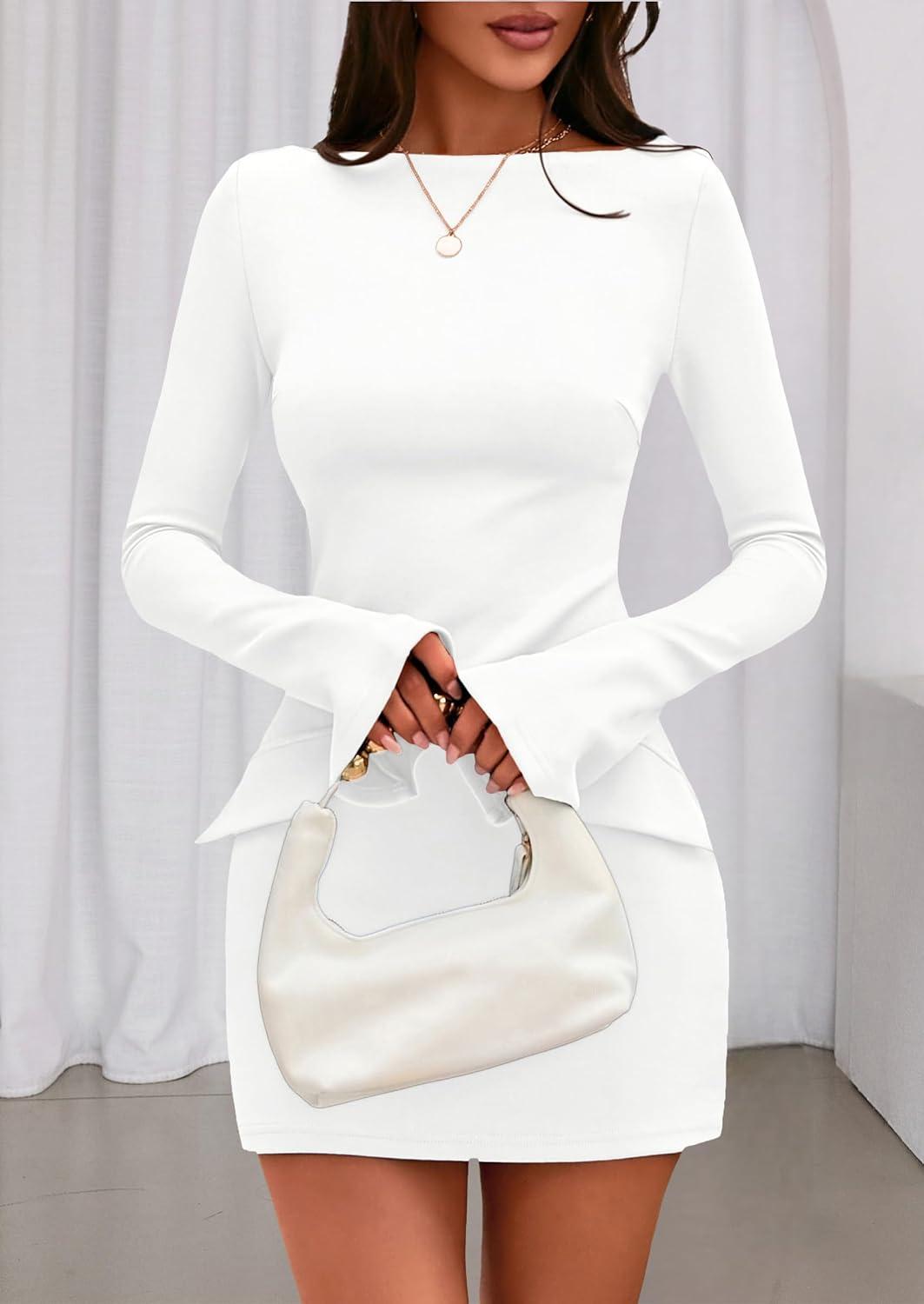PRETTYGARDEN Womens Fall Long Sleeve Mini Dress 2025 Trendy Boat Neck Bodycon Knit Elegant Short Party Formal Dresses(White)