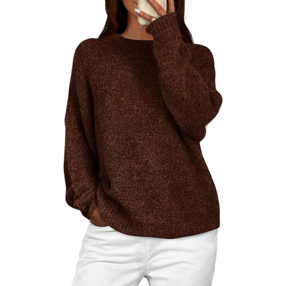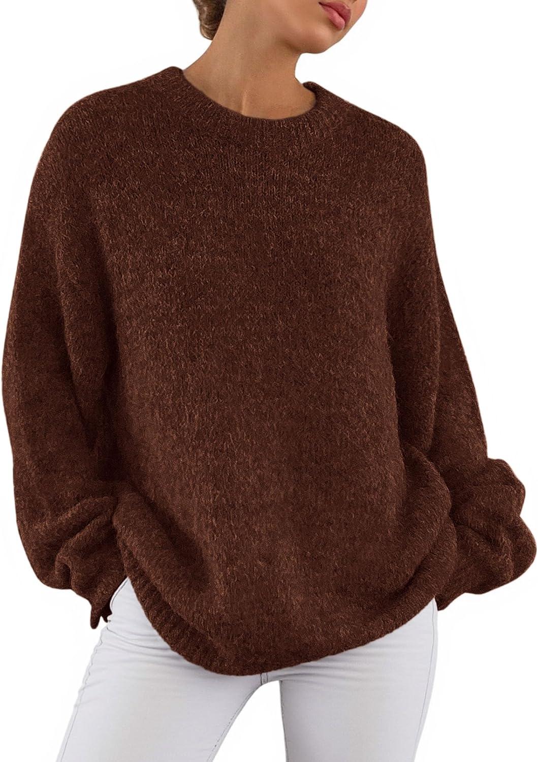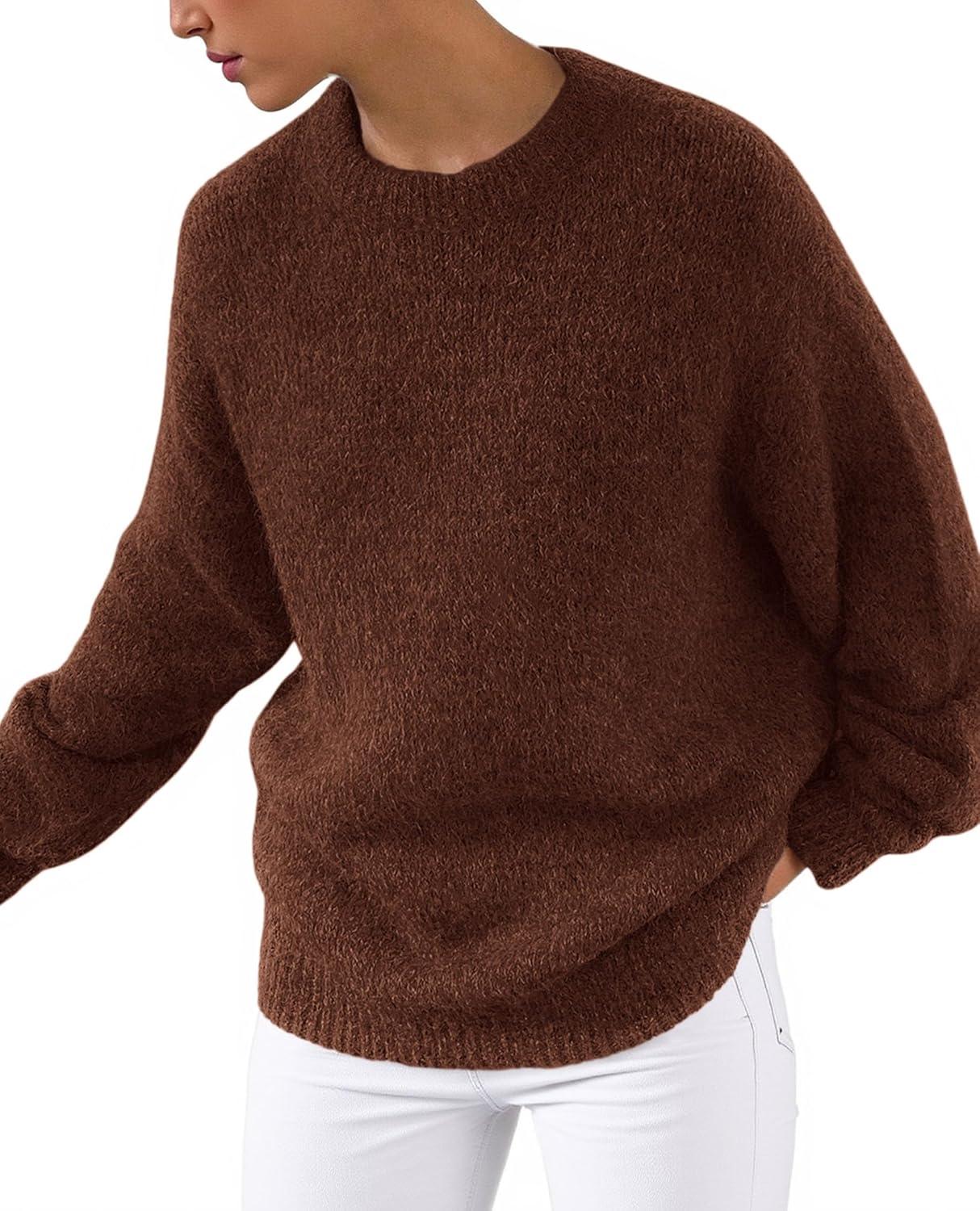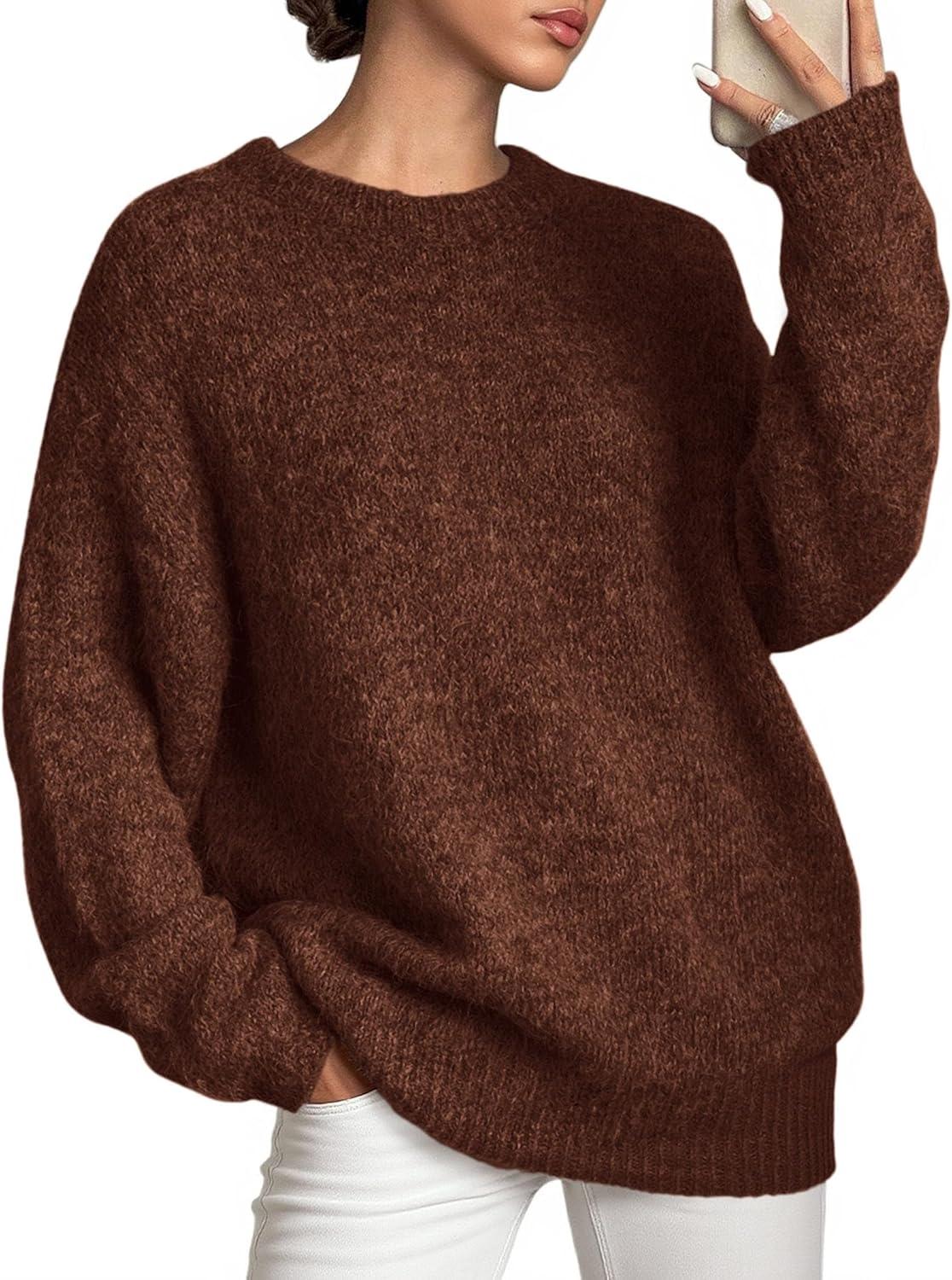 PRETTYGARDEN Womens Fall Long Sleeve Sweater Crew Neck Fuzzy Loose Fit Chunky Knit Oversized Pullover Sweaters Going Out Tops(Dark Brown)