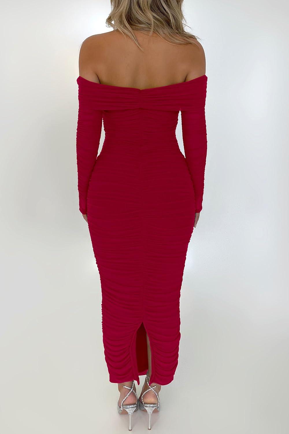 PRETTYGARDEN Women's Fall Off The Shoulder Maxi Dress Spring Long Sleeve Ruched Fitted Bodycon Club Dresses with Slit(Red)
