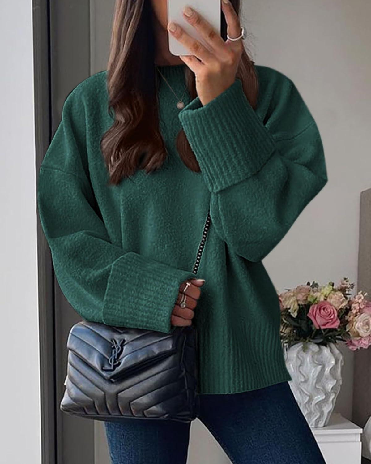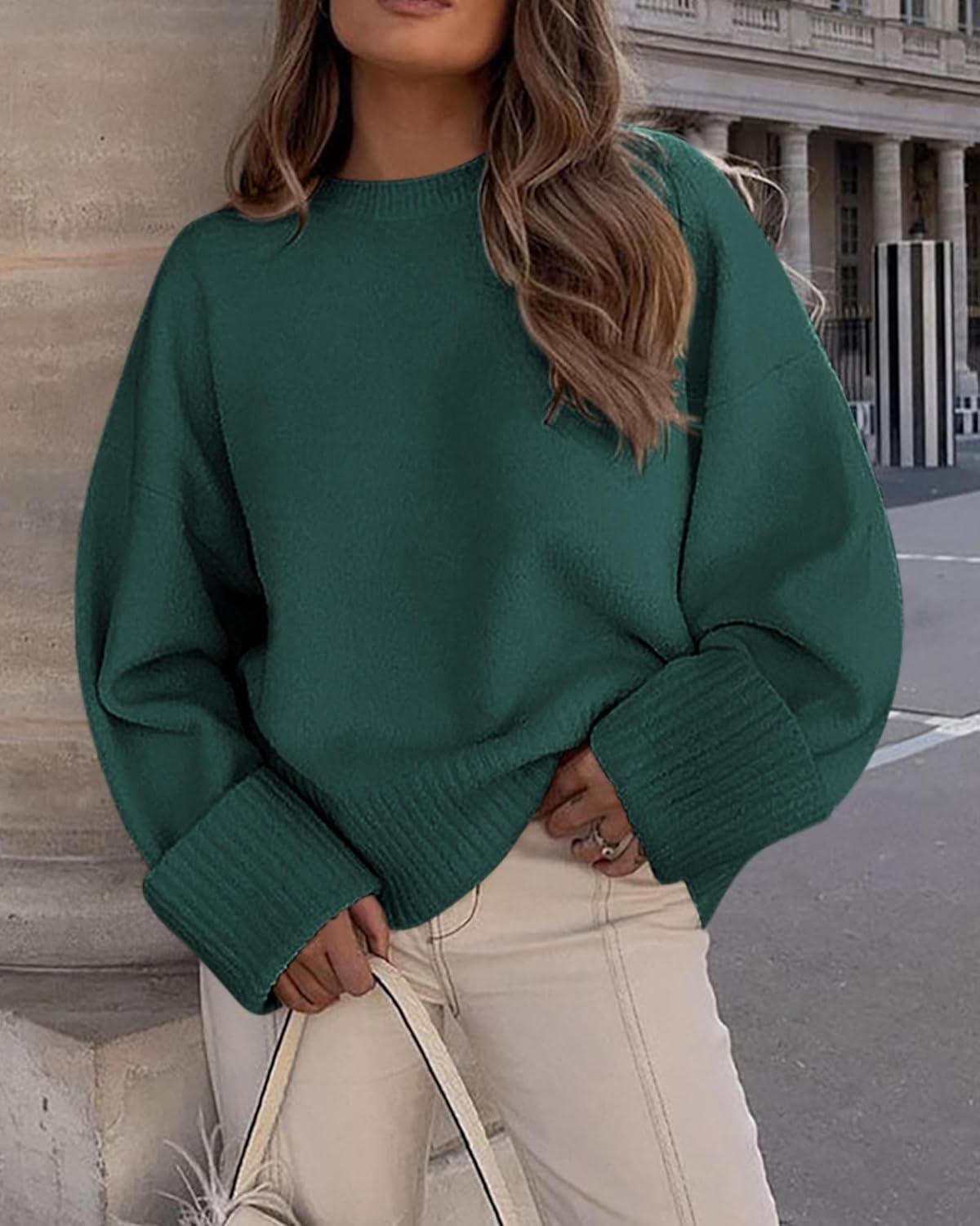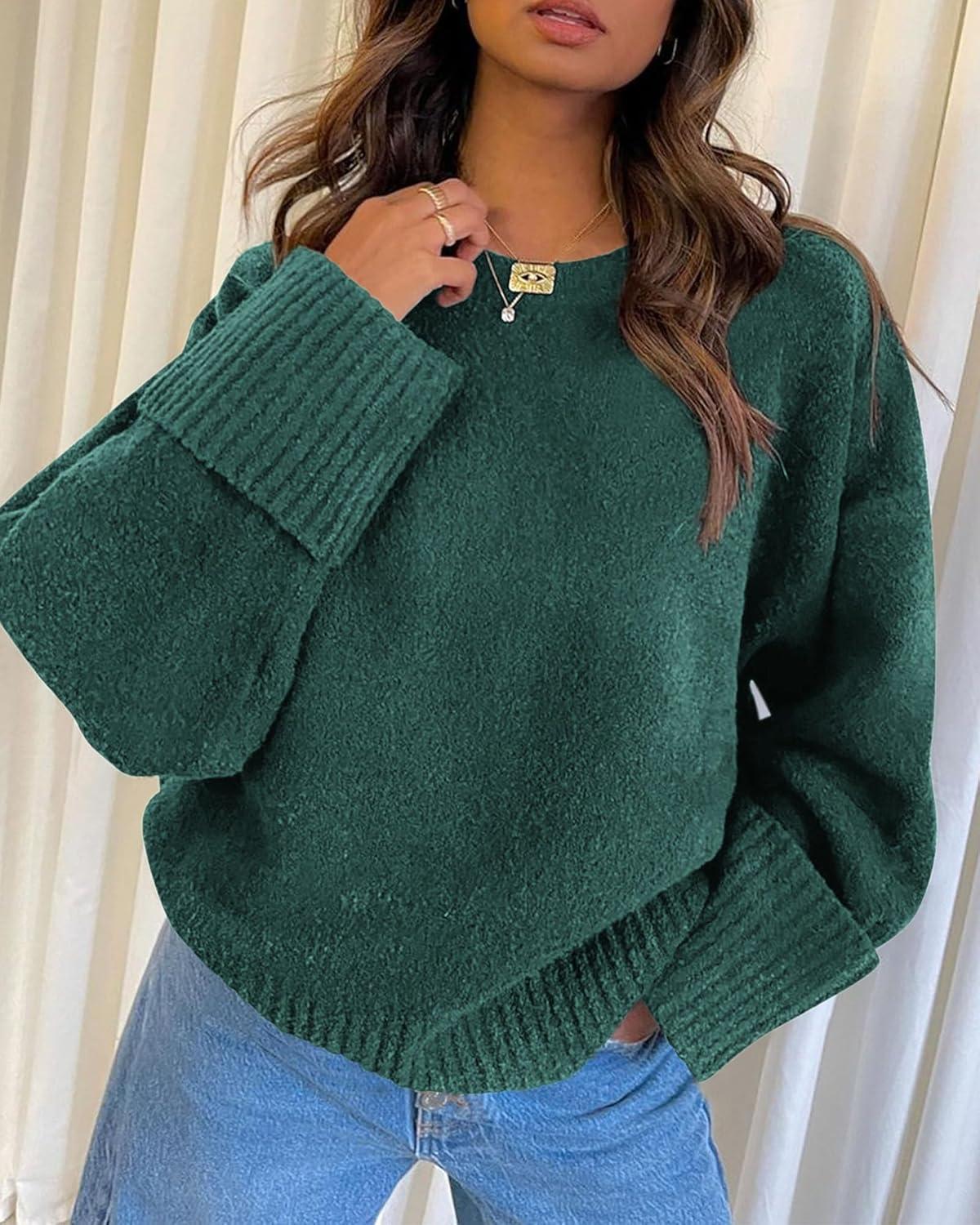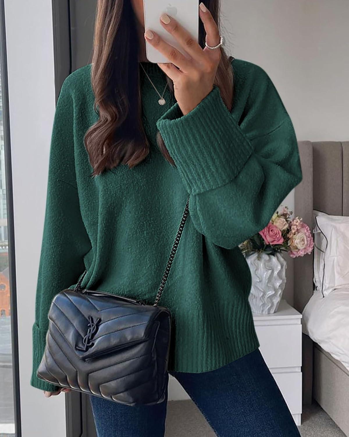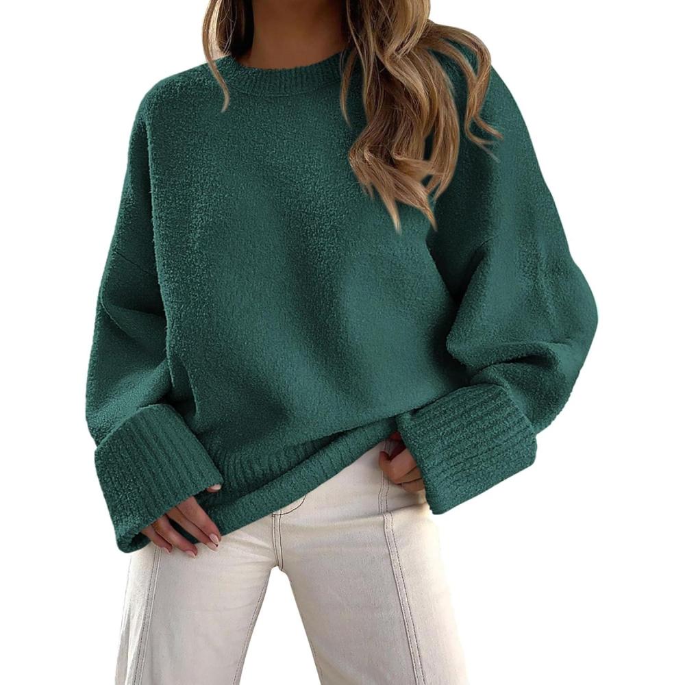 PRETTYGARDEN Women’s Fall Oversized Sweaters Casual Crewneck Pullover Long Sleeve Fuzzy Chunky Knit Tops Blouse(Dark Green)