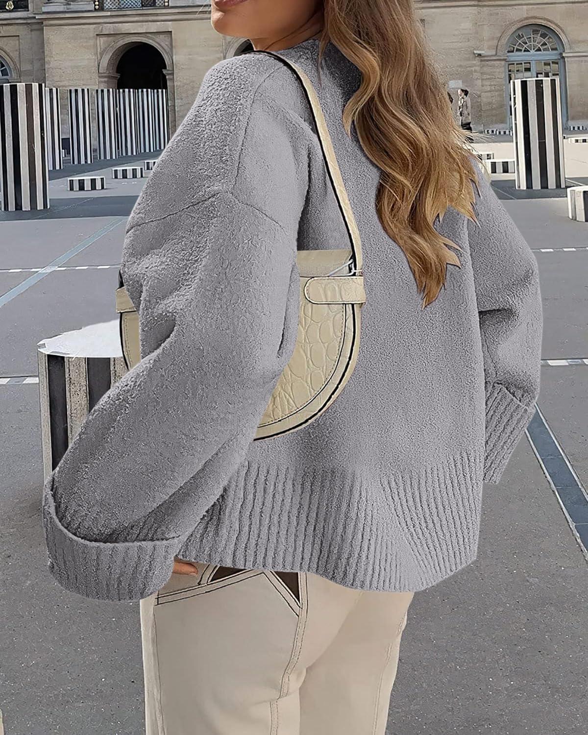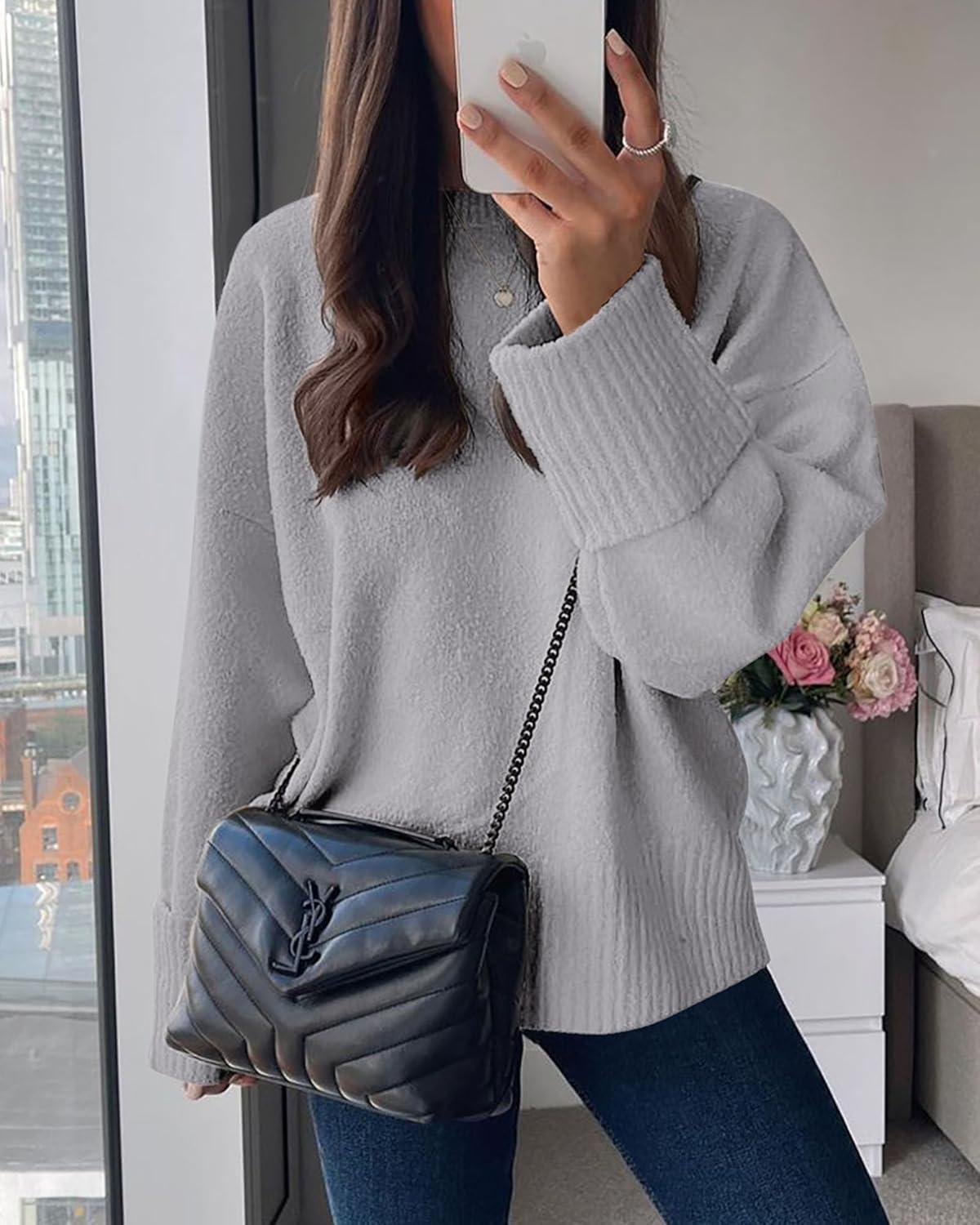PRETTYGARDEN Women’s Fall Oversized Sweaters Casual Crewneck Pullover Long Sleeve Fuzzy Chunky Knit Tops Blouse(Light Grey)