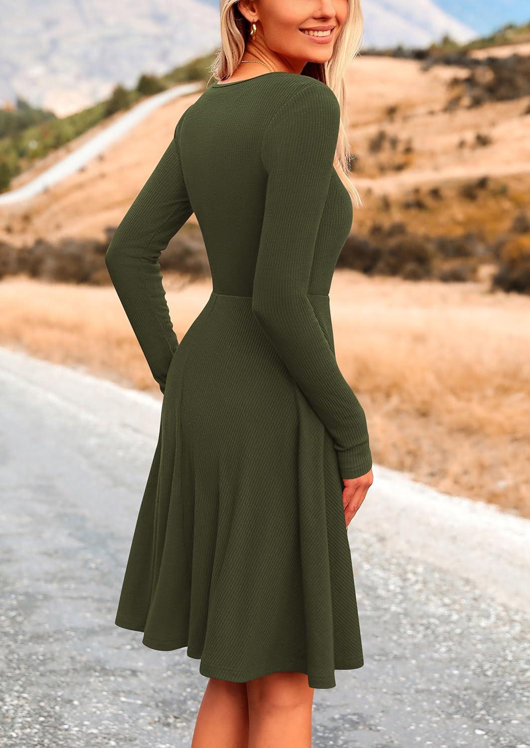 PRETTYGARDEN Women’s Fall Short Dress Ribbed Knit Crewneck Long Sleeve A Line Flowy Casual Elegant Going Out Winter Dresses(Army Green)