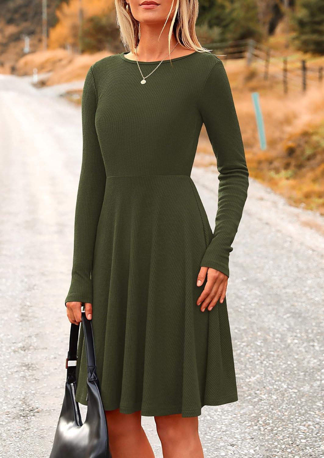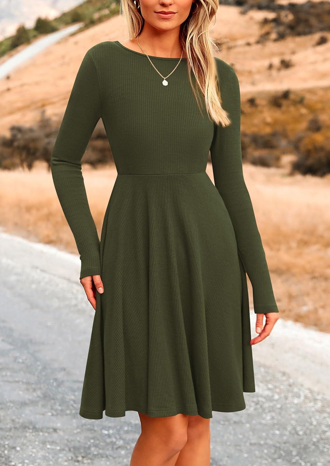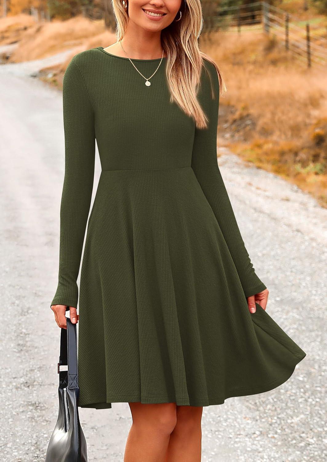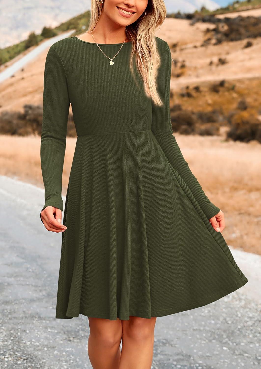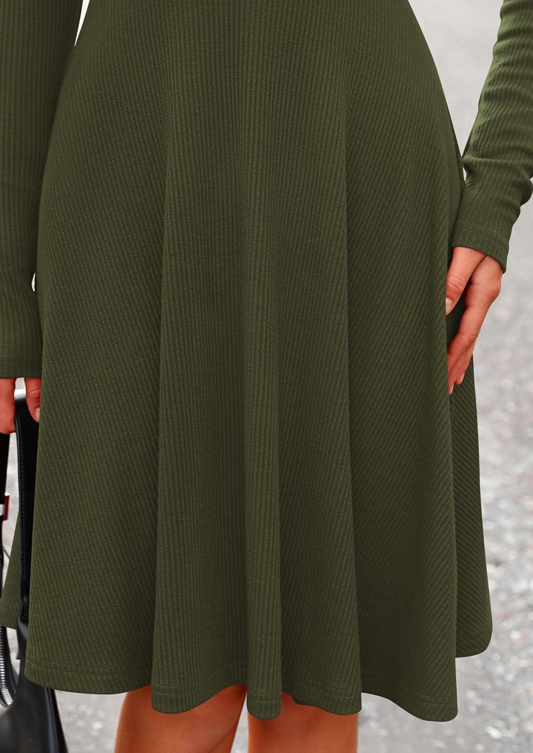 PRETTYGARDEN Women's Fall Short Dress Ribbed Knit Crewneck Long Sleeve A Line Flowy Casual Elegant Going Out Winter Dresses(Army Green)
