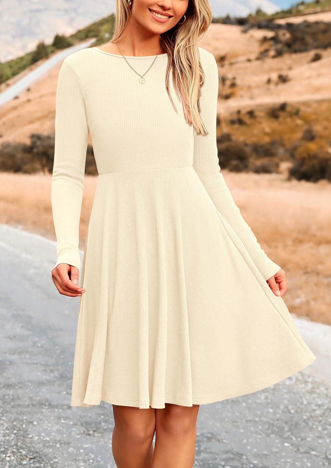 PRETTYGARDEN Women’s Fall Short Dress Ribbed Knit Crewneck Long Sleeve A Line Flowy Casual Elegant Going Out Winter Dresses(Beige)