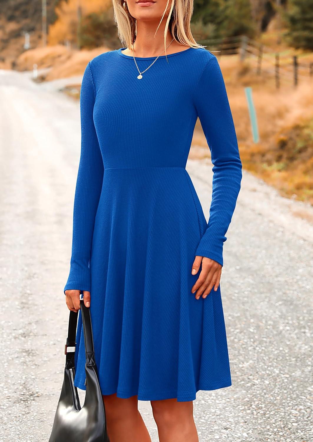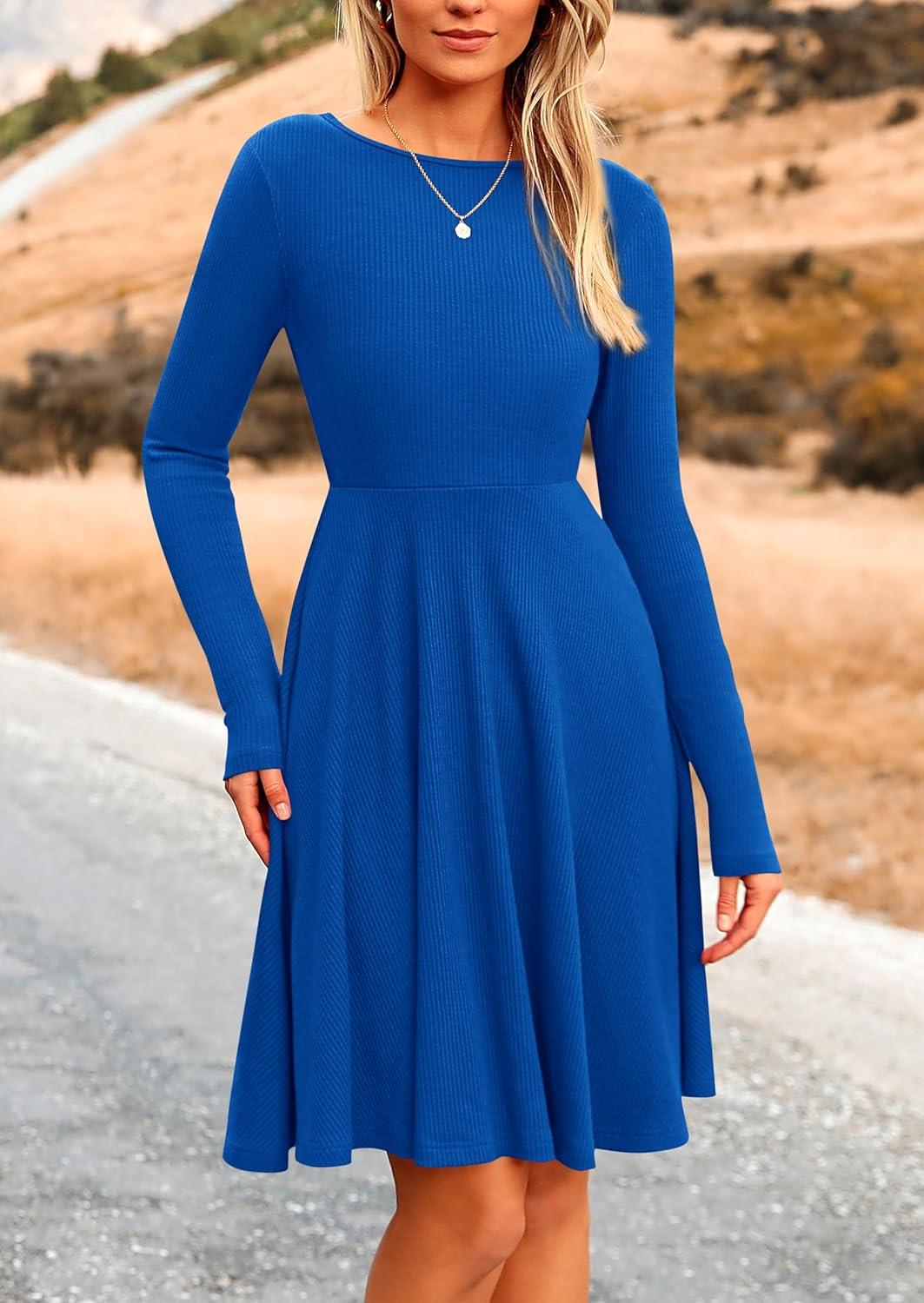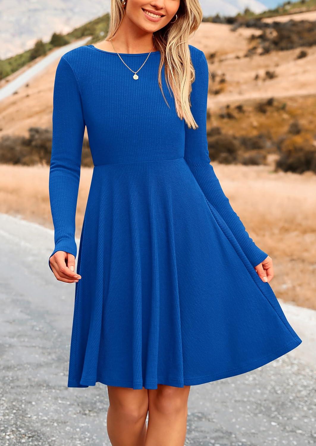 PRETTYGARDEN Women's Fall Short Dress Ribbed Knit Crewneck Long Sleeve A Line Flowy Casual Elegant Going Out Winter Dresses(Blue)