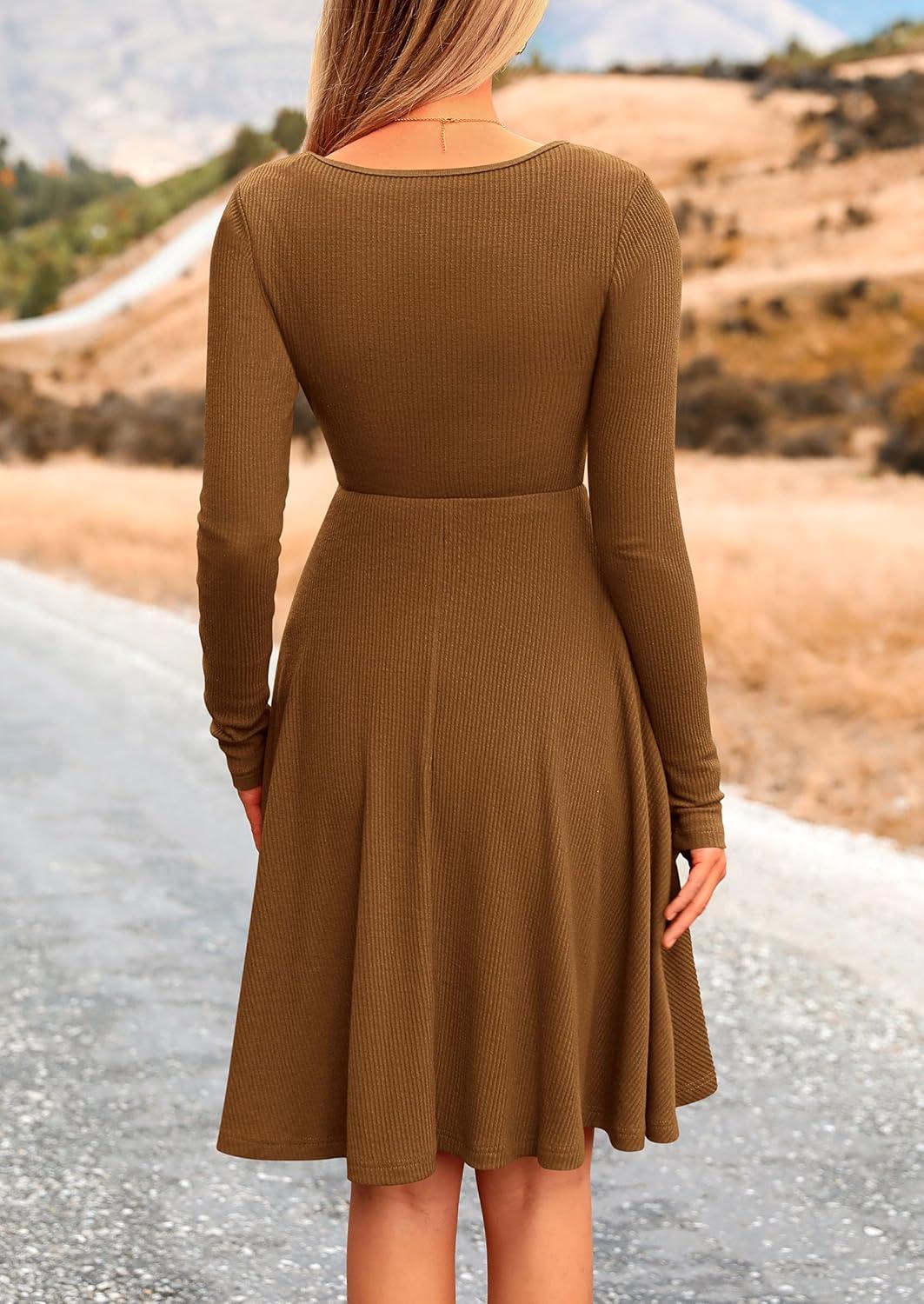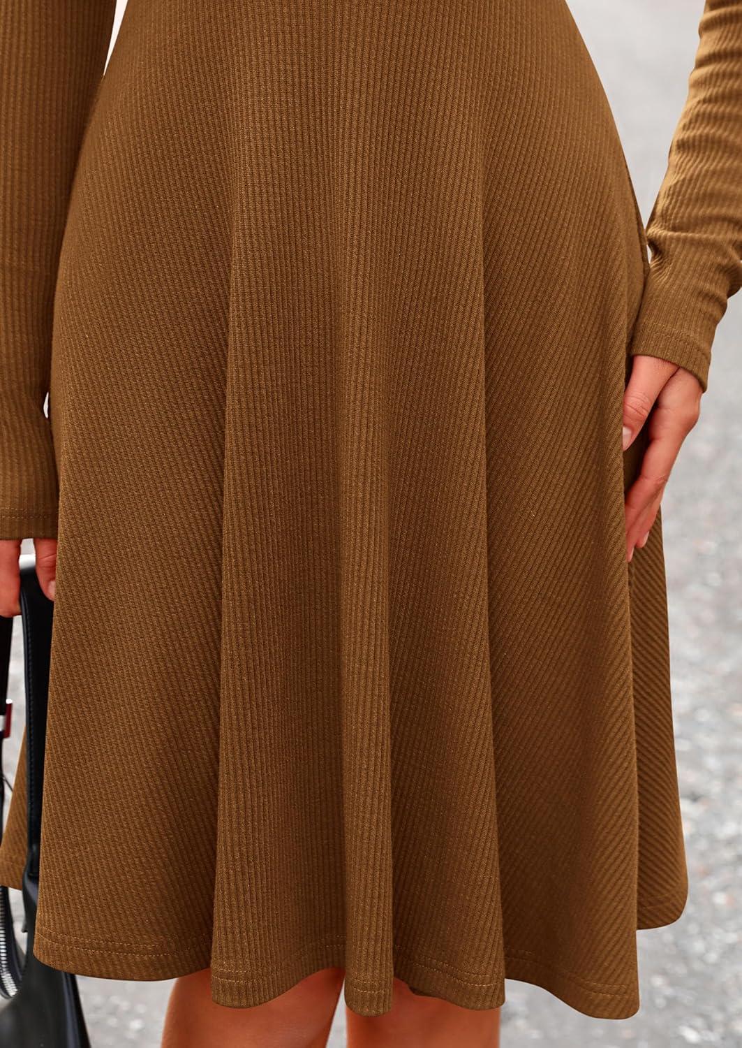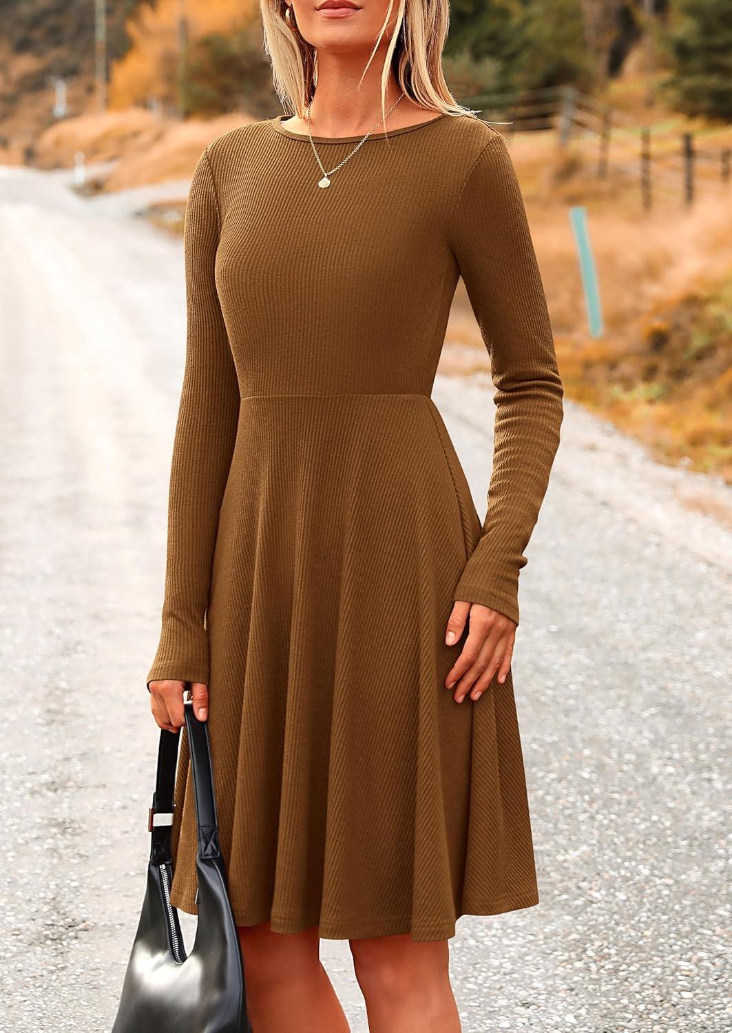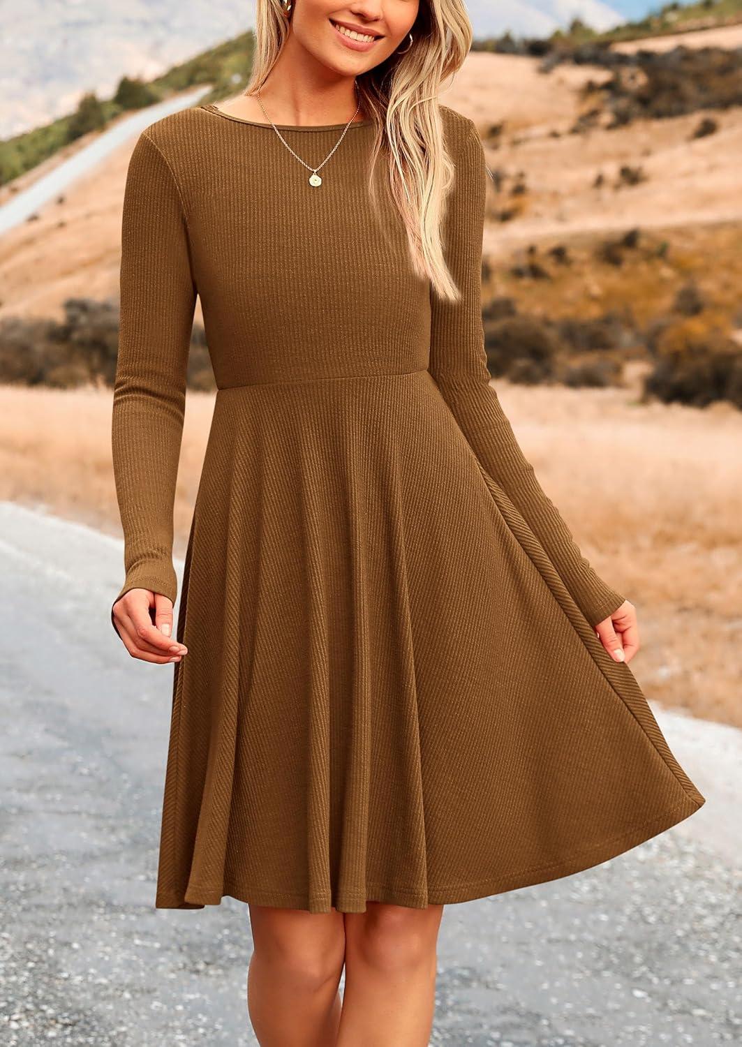 PRETTYGARDEN Women’s Fall Short Dress Ribbed Knit Crewneck Long Sleeve A Line Flowy Casual Elegant Going Out Winter Dresses(Brown)