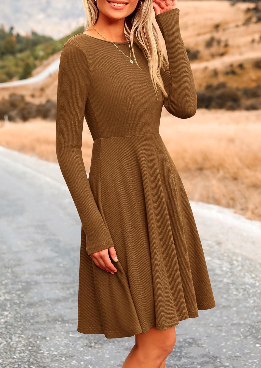 PRETTYGARDEN Women's Fall Short Dress Ribbed Knit Crewneck Long Sleeve A Line Flowy Casual Elegant Going Out Winter Dresses(Brown)