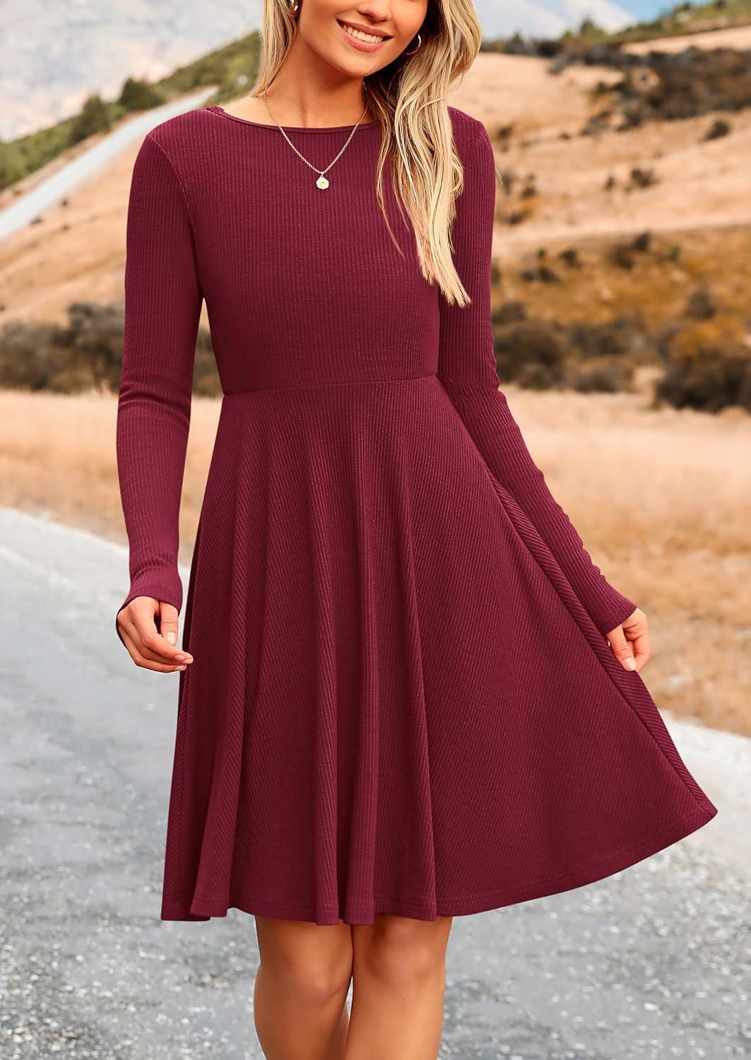 PRETTYGARDEN Women’s Fall Short Dress Ribbed Knit Crewneck Long Sleeve A Line Flowy Casual Elegant Going Out Winter Dresses(Wine Red)