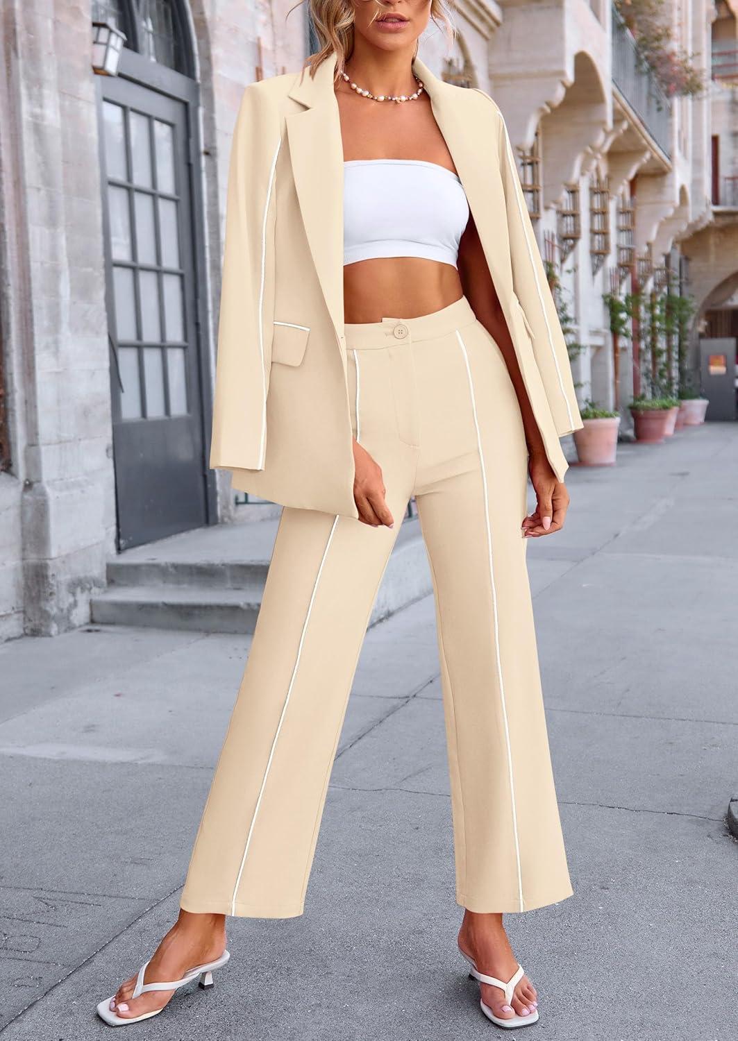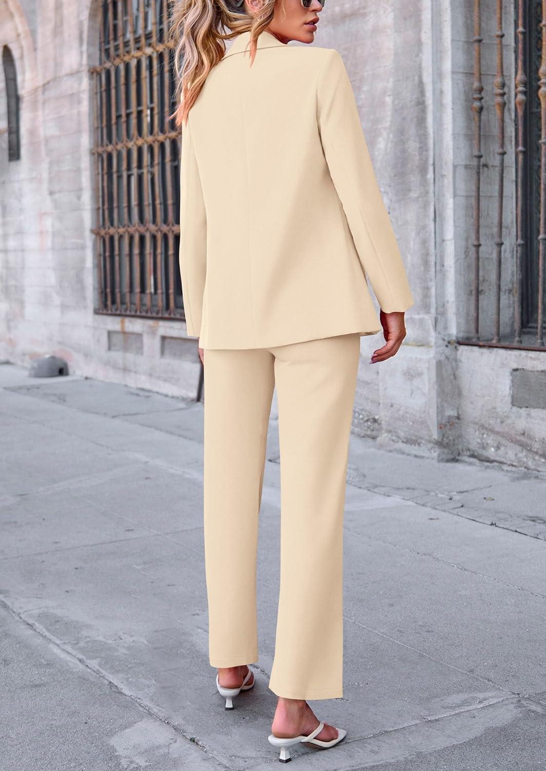 PRETTYGARDEN Women's Fall Spring 2 Piece Blazer Outfits Business Casual Oversized Jacket Wide Leg Work Pants Dressy Suit Set(Beige)