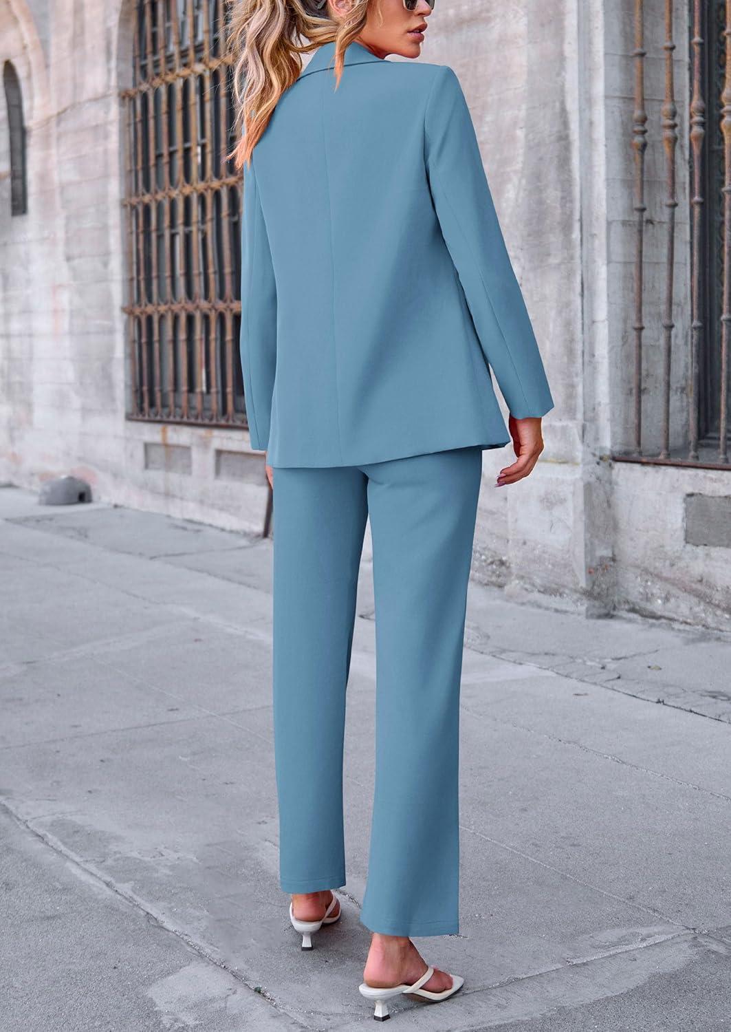PRETTYGARDEN Women’s Fall Spring 2 Piece Blazer Outfits Business Casual Oversized Jacket Wide Leg Work Pants Dressy Suit Set(Blue)