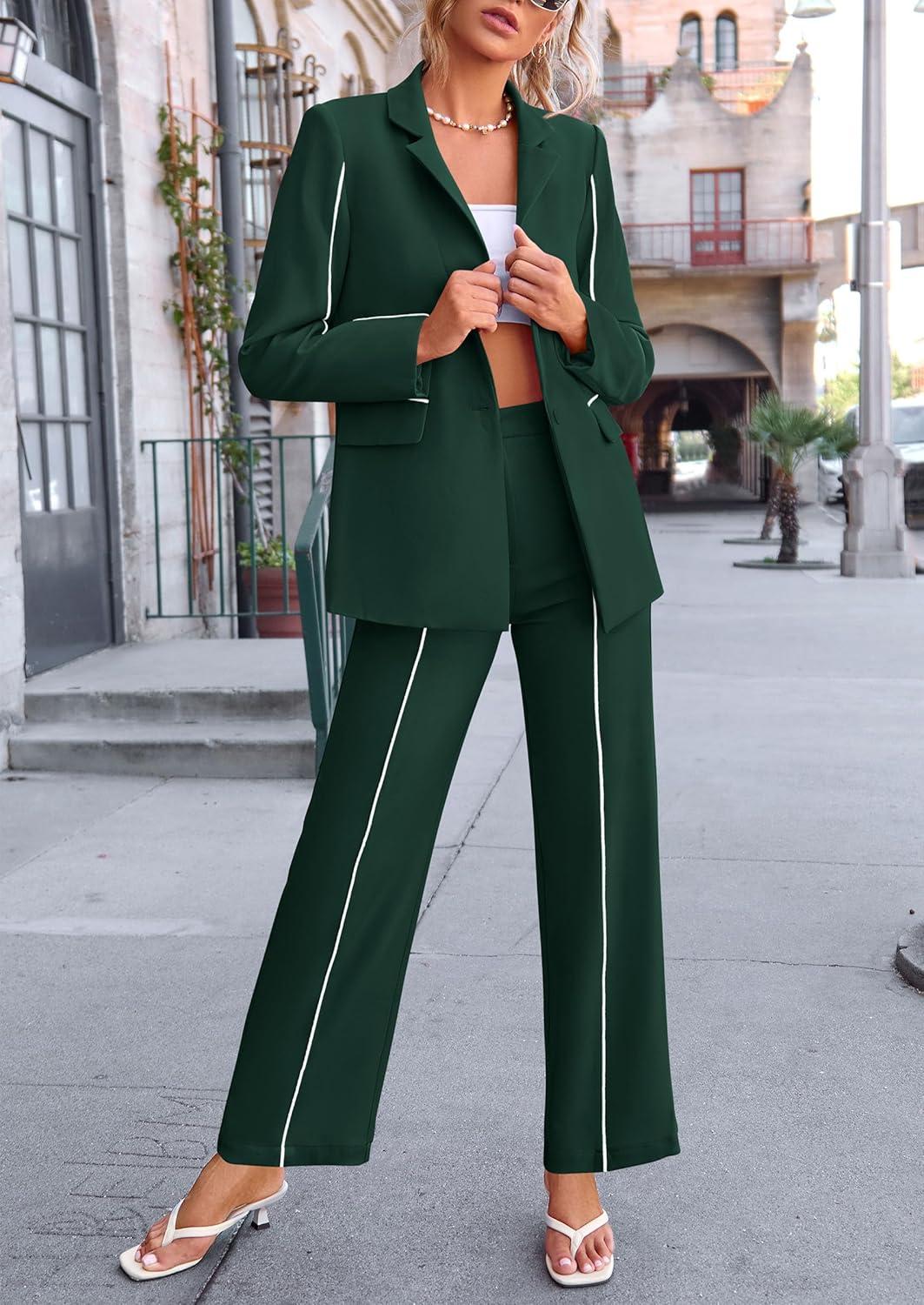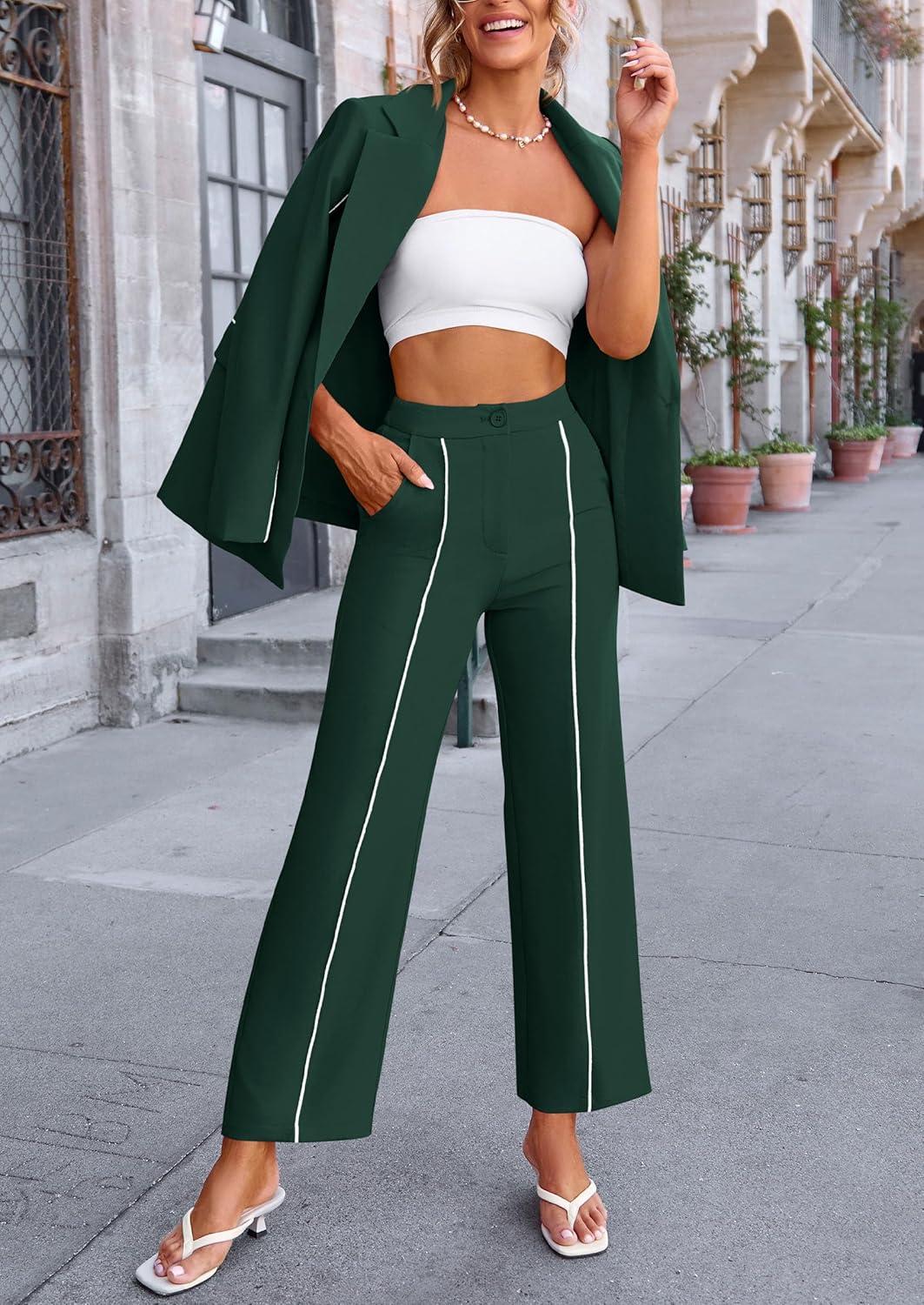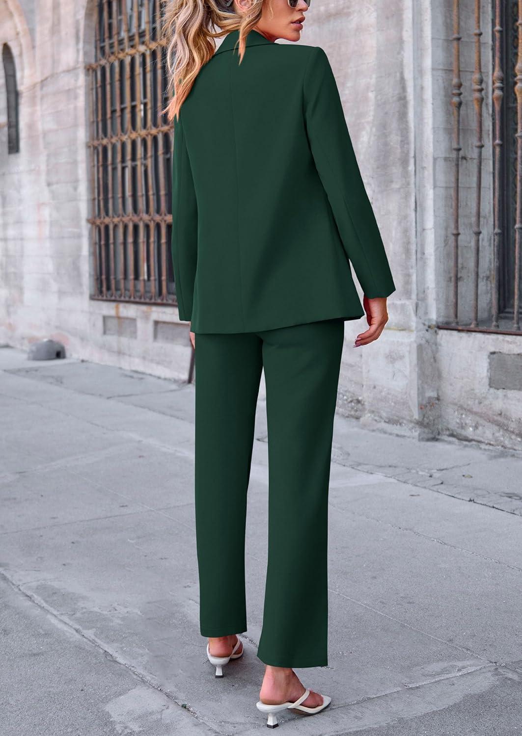 imagePRETTYGARDEN Womens Fall Spring 2 Piece Blazer Outfits Business Casual Oversized Jacket Wide Leg Work Pants Dressy Suit SetDark Green