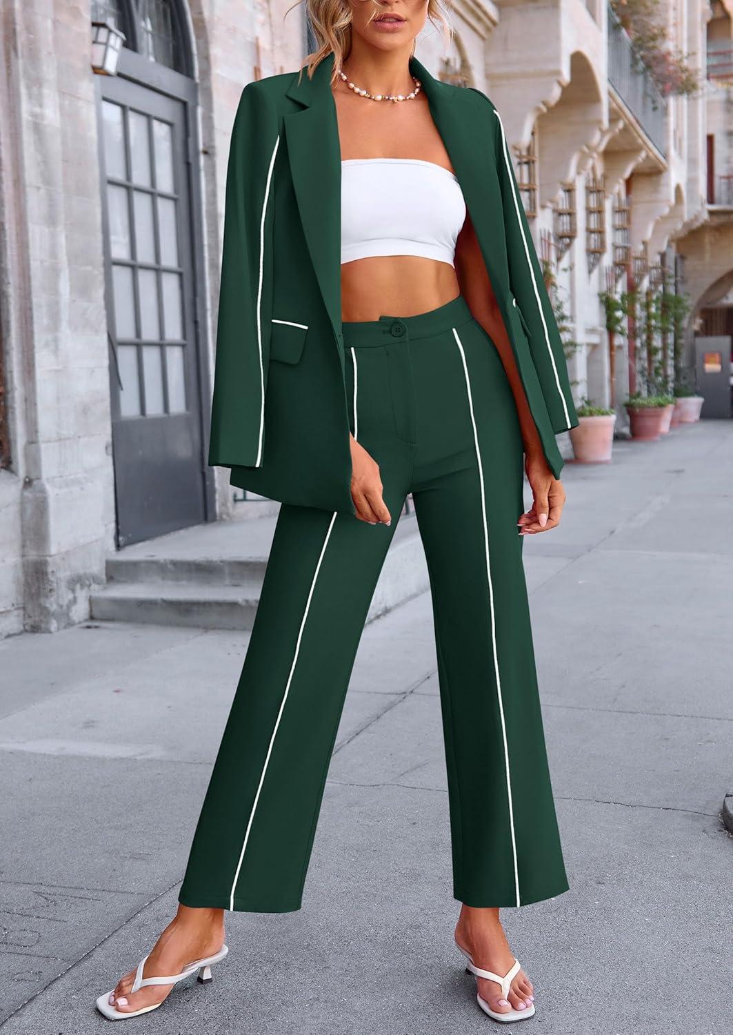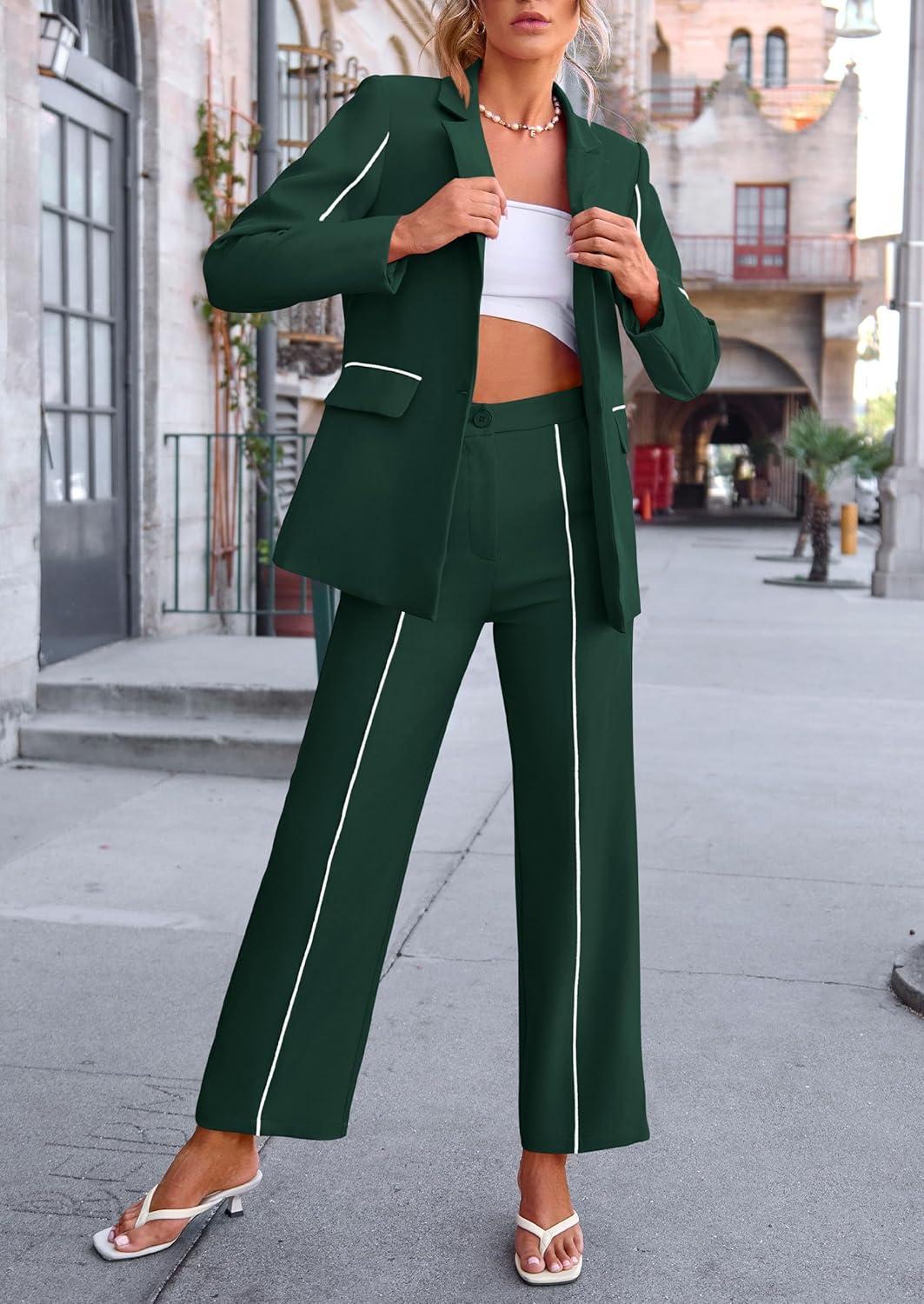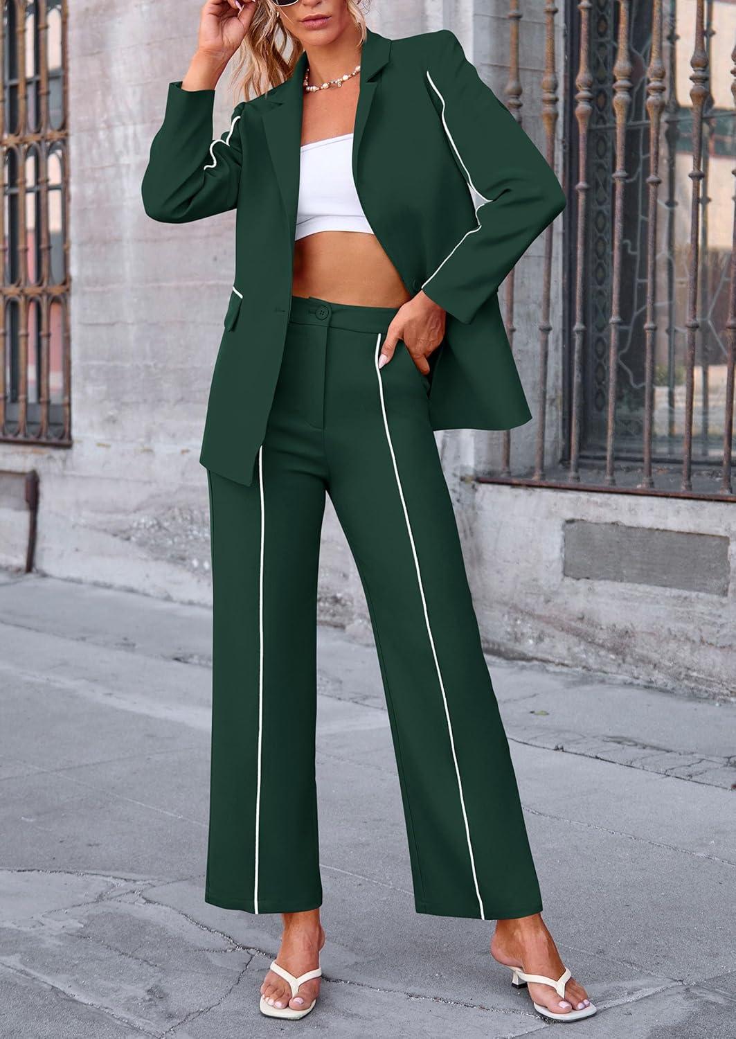 imagePRETTYGARDEN Womens Fall Spring 2 Piece Blazer Outfits Business Casual Oversized Jacket Wide Leg Work Pants Dressy Suit SetDark Green