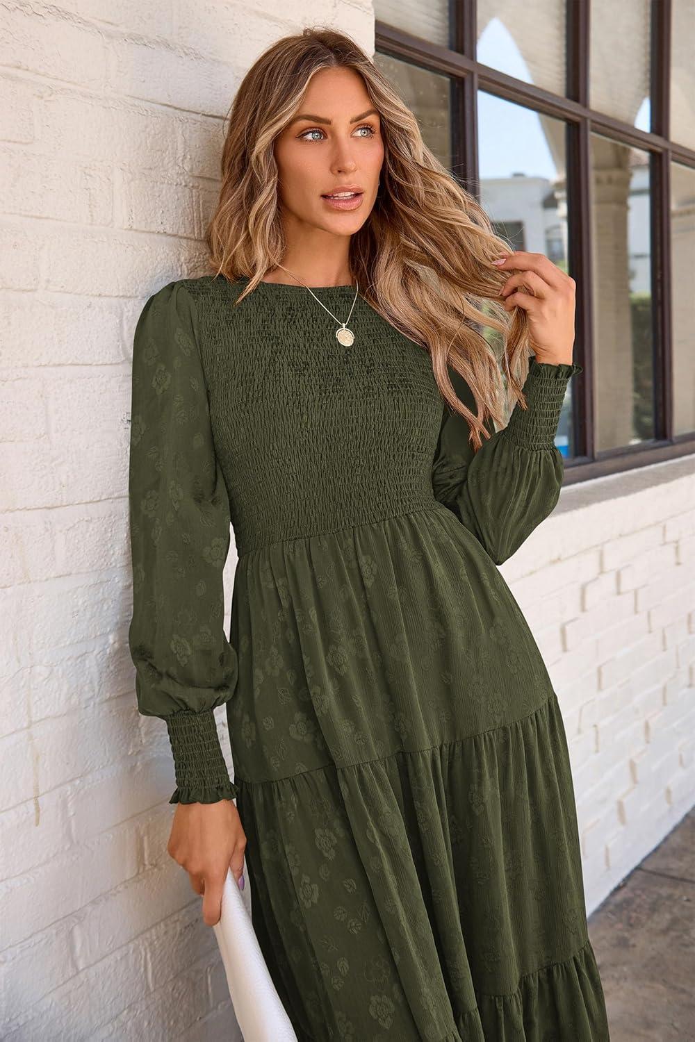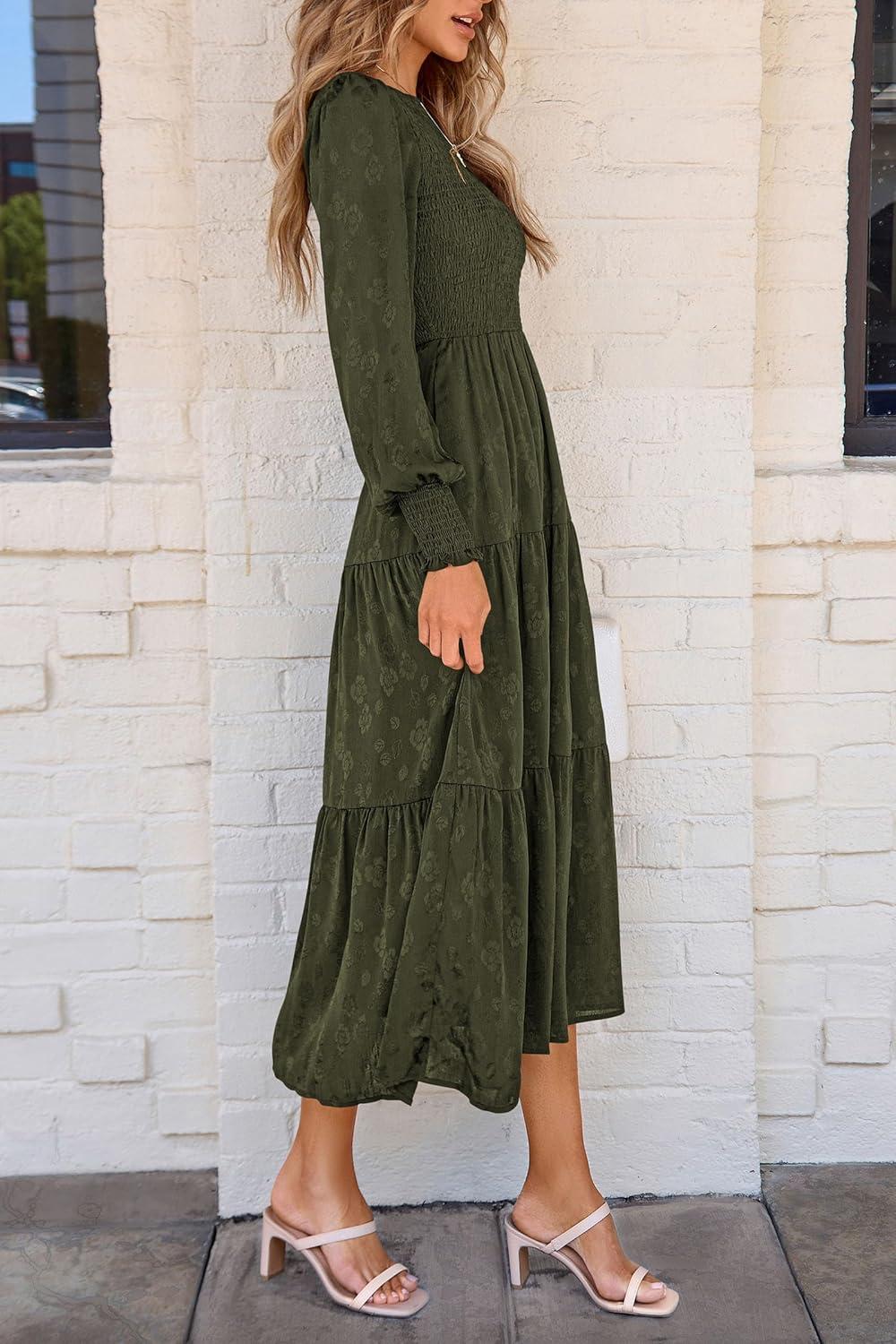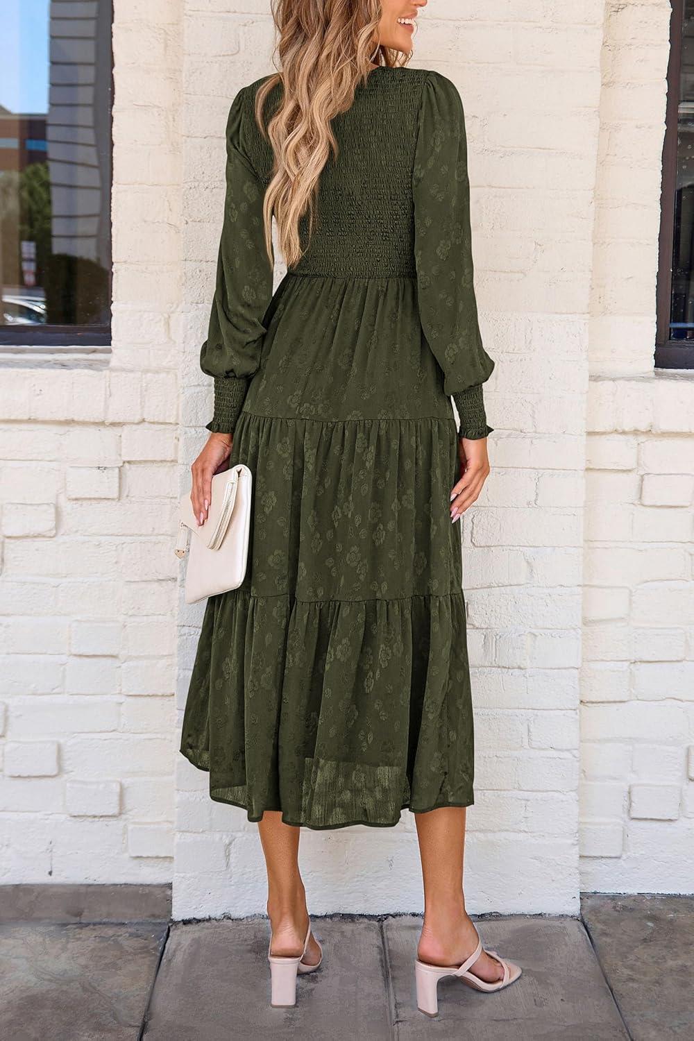 PRETTYGARDEN Women’s Fall Spring Midi Dress Long Sleeve Floral Smocked Elegant Wedding Guest Long Flowy Dresses with Pockets(Army Green)
