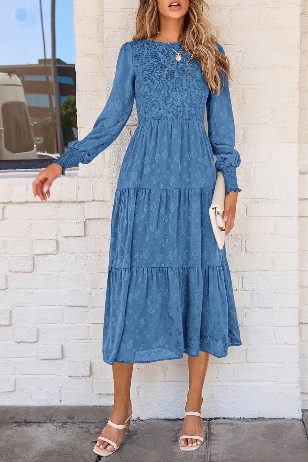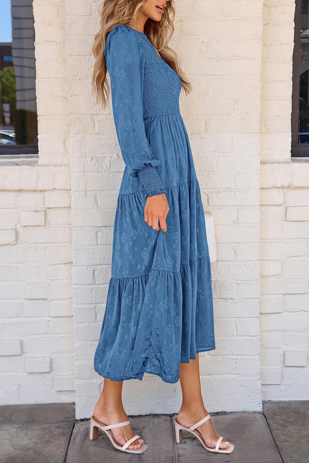 PRETTYGARDEN Women’s Fall Spring Midi Dress Long Sleeve Floral Smocked Elegant Wedding Guest Long Flowy Dresses with Pockets(Blue)
